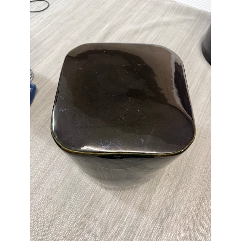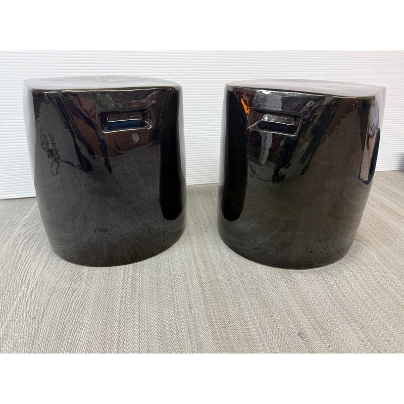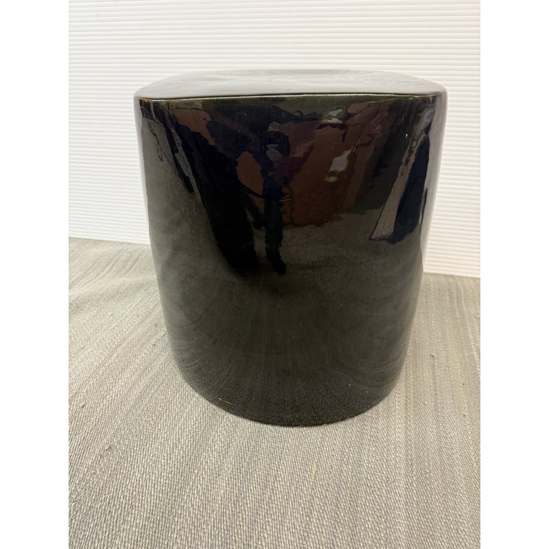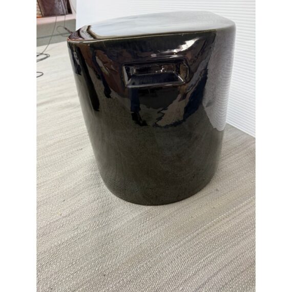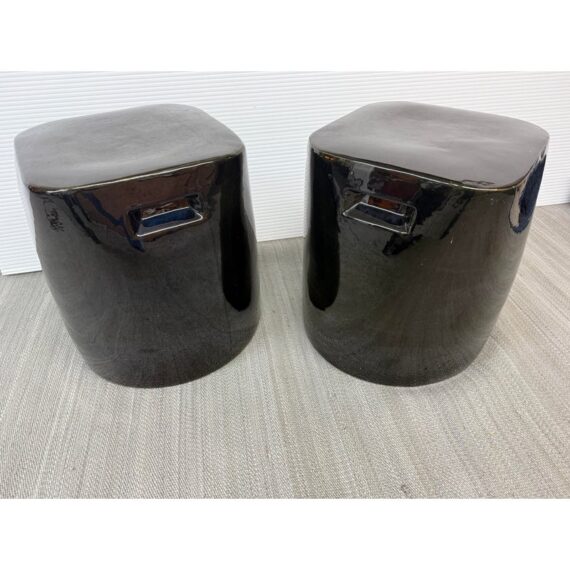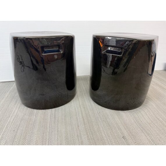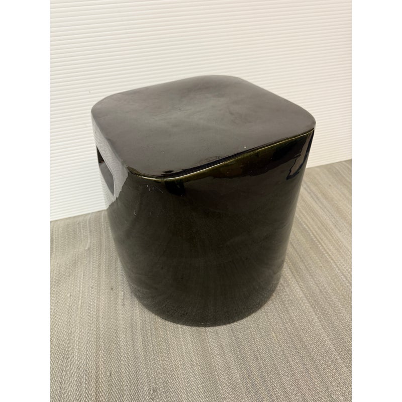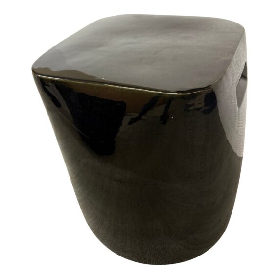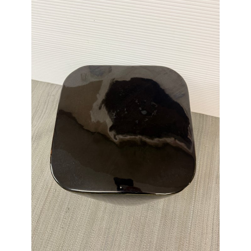 Design Plus Gallery presents a Ceramic Garden Stool from Pottery Barn. Sleek and sculptural, this stool brings a modern, high-gloss accent to any space. Features a rounded cylindrical base that transitions into a square top with softly rounded corners, plus two integrated side handles for easy repositioning. The rich black glaze reflects light beautifully, adding depth and polish to your decor. Visible wear on top from pot or plant; condition is consistent with usage.
