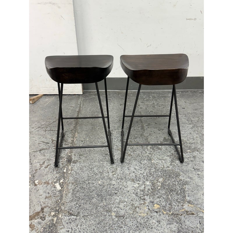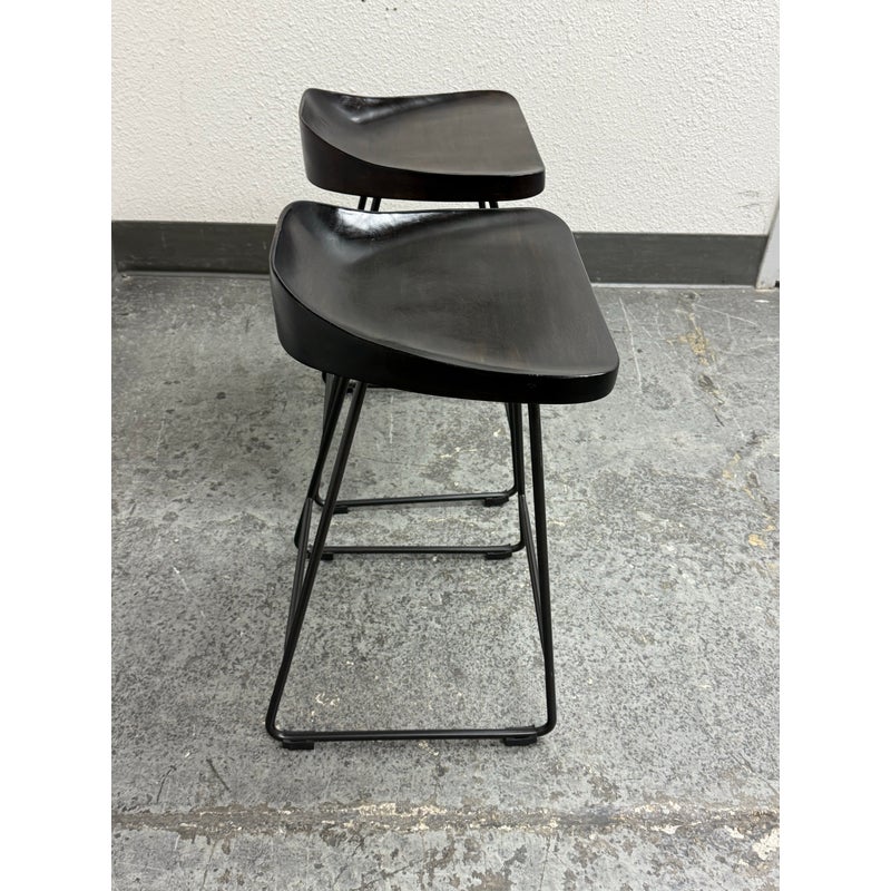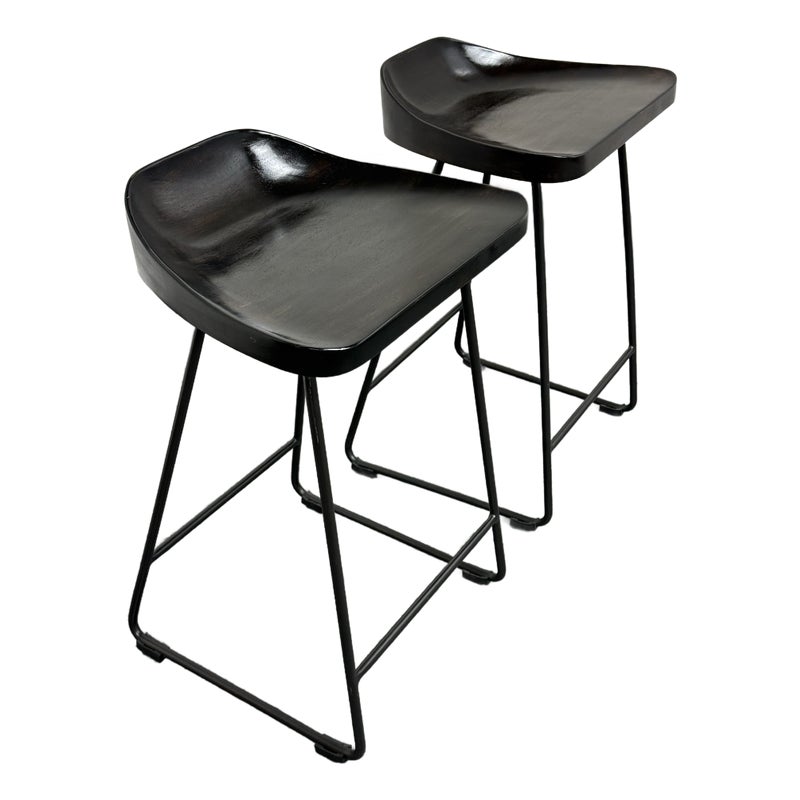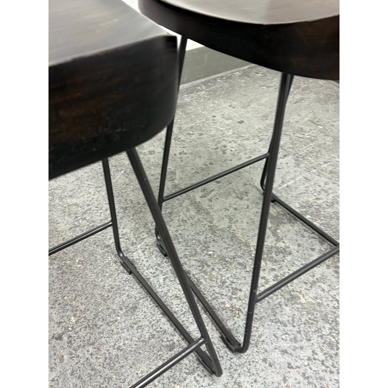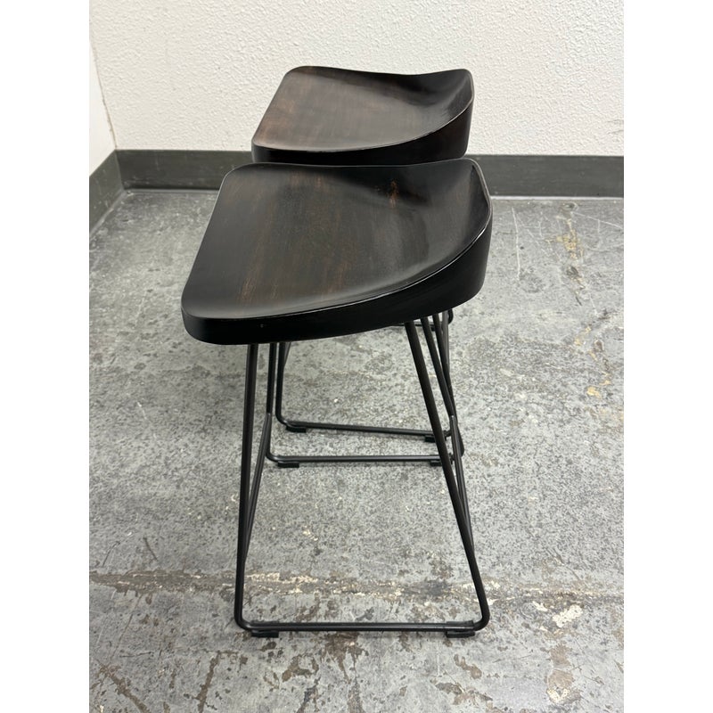 Design Plus Gallery presents a Pair of Brenner Counter Stools by Pottery Barn. Crafted with a sculpted wood seat that rests on angular metal legs for a look that hits the high notes of both modern and industrial designs. Features a frame that has a hand-applied powder coat bronze finish; seat features a warm black finish. Both are in good condition with minimal wear for their usage.