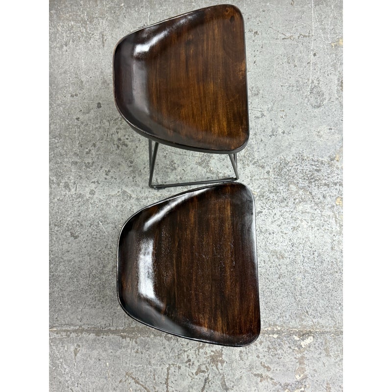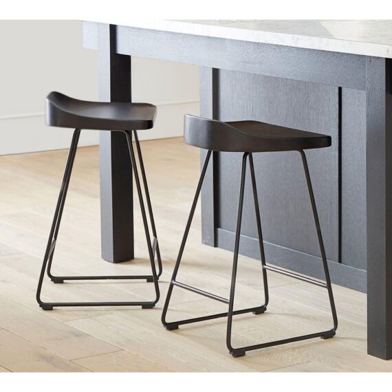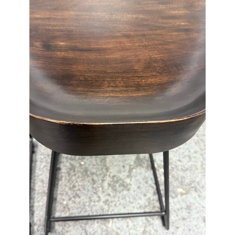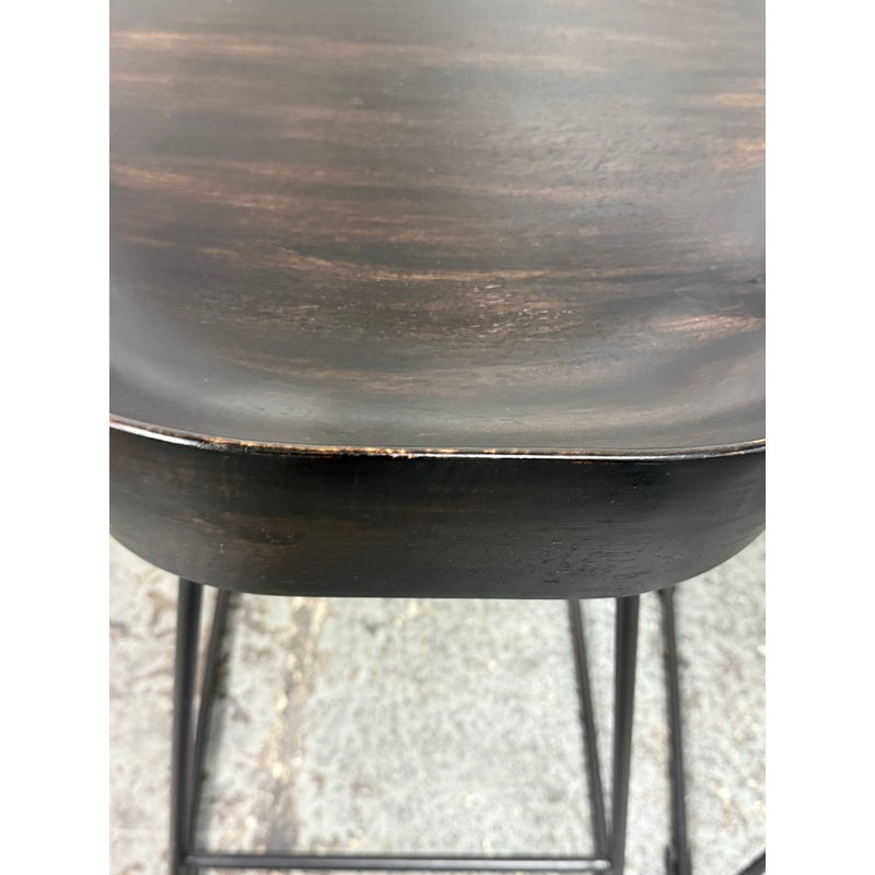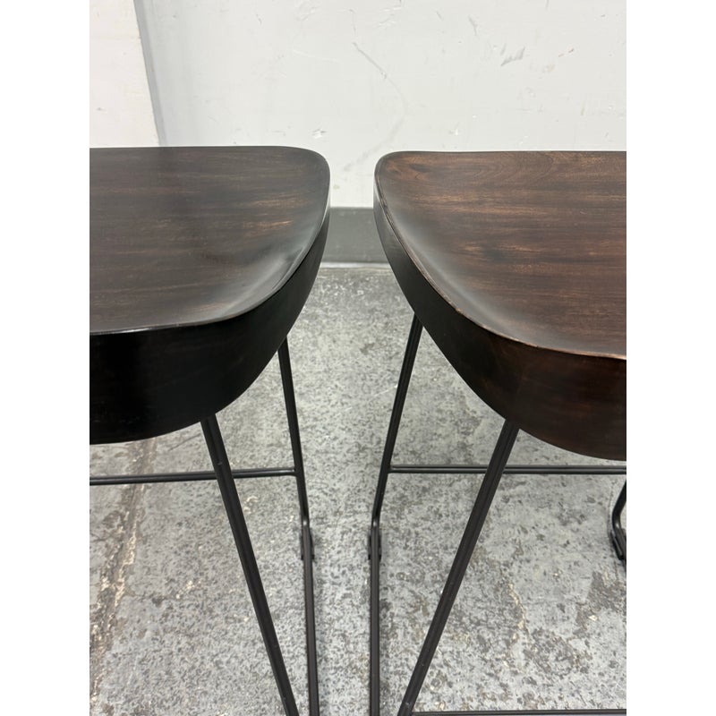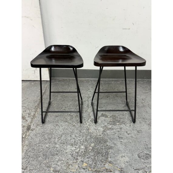 Design Plus Gallery presents a Pair of Brenner Counter Stools by Pottery Barn. Crafted with a sculpted wood seat that rests on angular metal legs for a look that hits the high notes of both modern and industrial designs. Features a frame that has a hand-applied powder coat bronze finish; seat features a warm black finish. Both are in good condition with minimal wear for their usage.