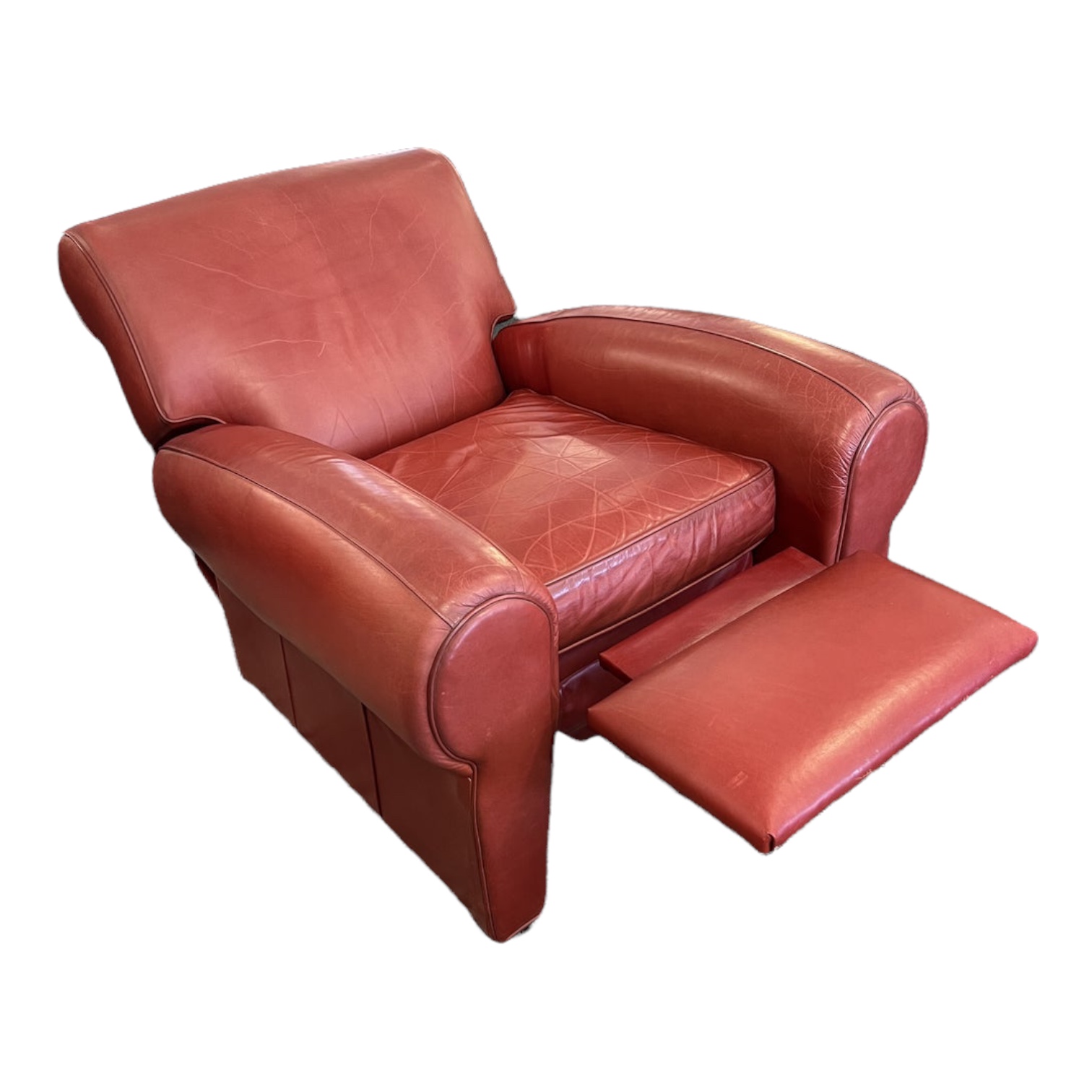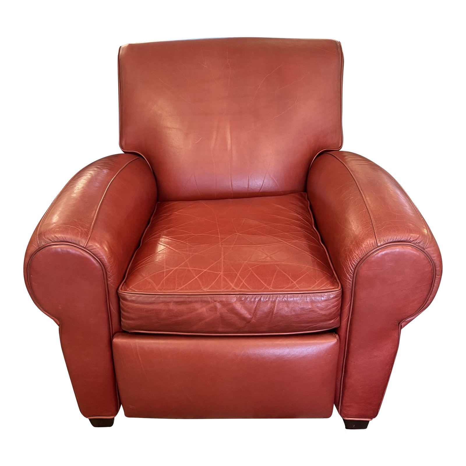 Design Plus Gallery presents the Manhattan Reclining Arm Chair by Pottery Barn. Now a classic, the signature blend of quality, value and style, the Manhattan Leather Recliner continues to be a 1930’s inspired favorite. Starting with a kiln-dried hardwood frame for durability, and hand-tied coil springs for support, the seat sports well-padded arms, a high back and deep loose seat cushion. Wrapped in distressed, full-grain aniline-dyed leather with self welting. Manual recline. Intentional distressing and light fading on leather, shows wear consistent with age and use.