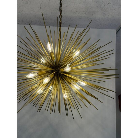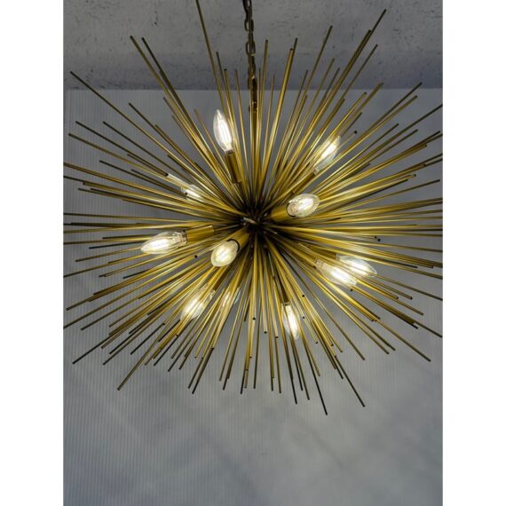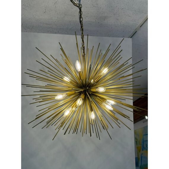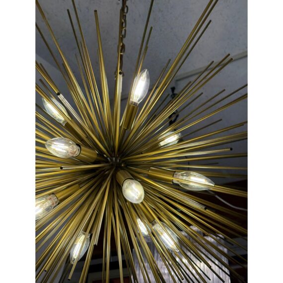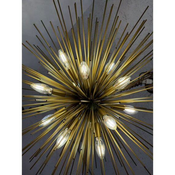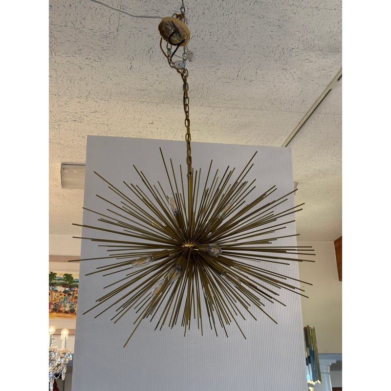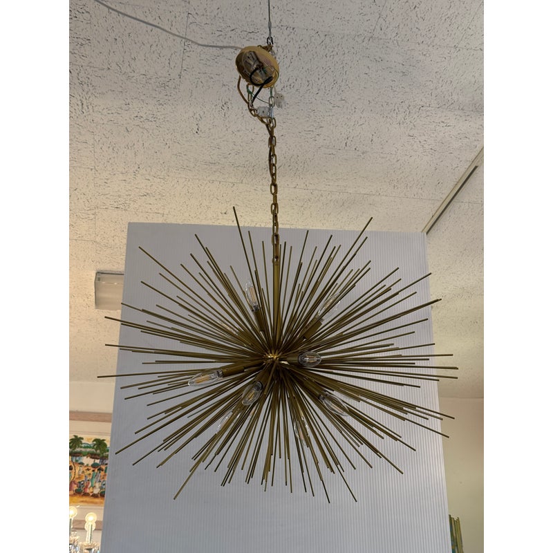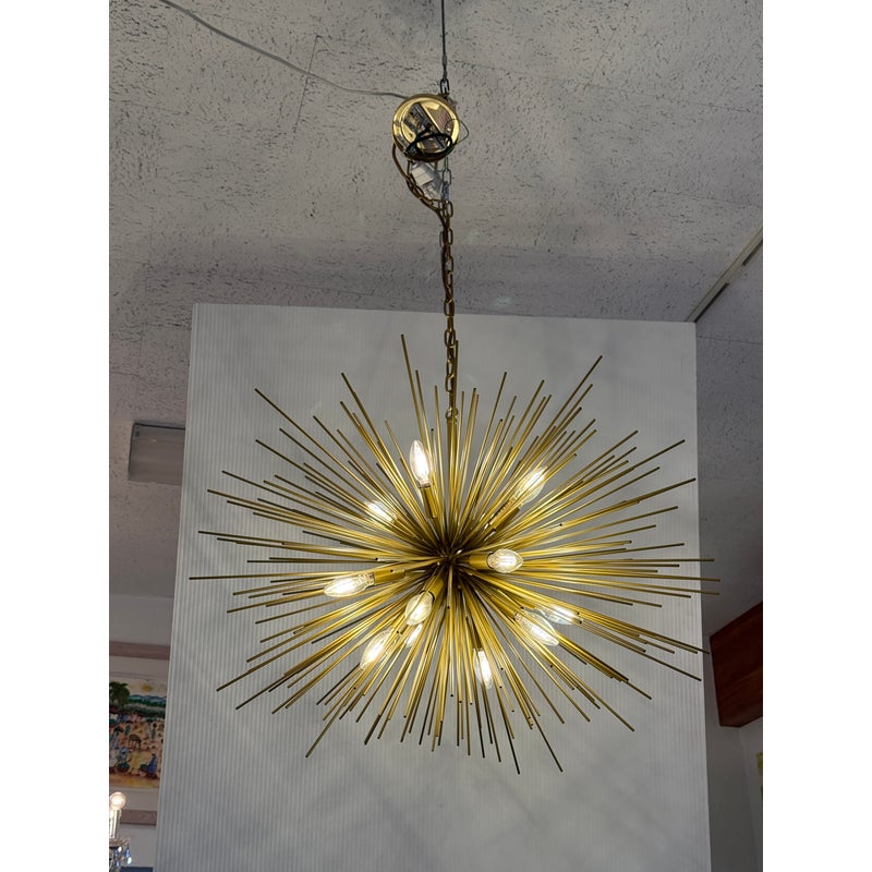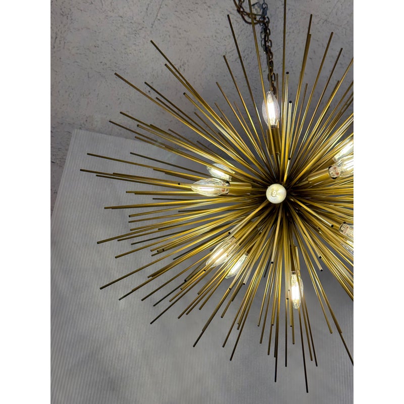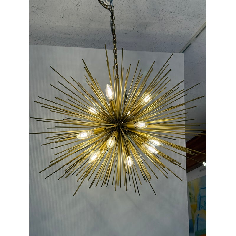 Design Plus Gallery presents a Brass Explosion Chandler with Twelve Lights from Pottery Barn. This mid 20th century modern light fixture will work with a variety of home styles and placements. The starburst of multiple brass rods spiking outward from the center will spark the room aglow from light bulbs within. Good condition with minimal wear.