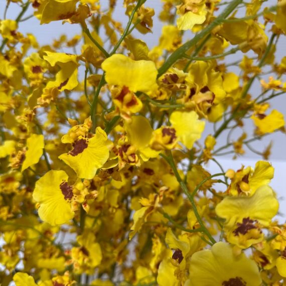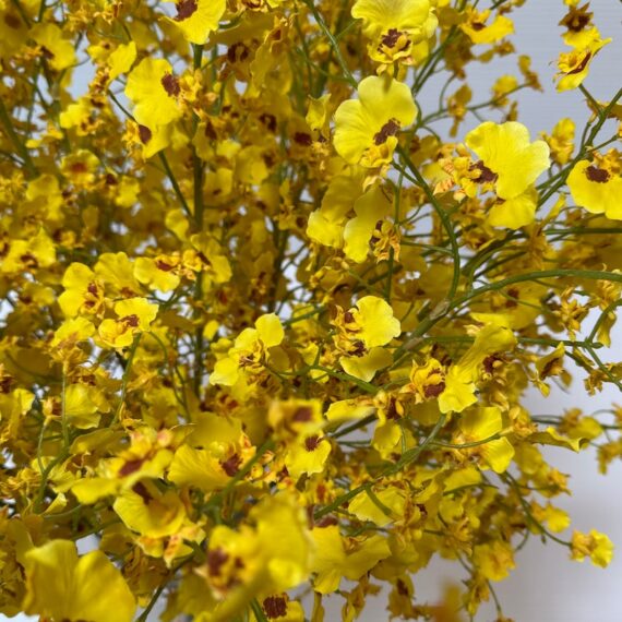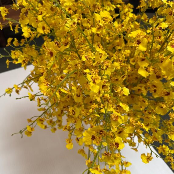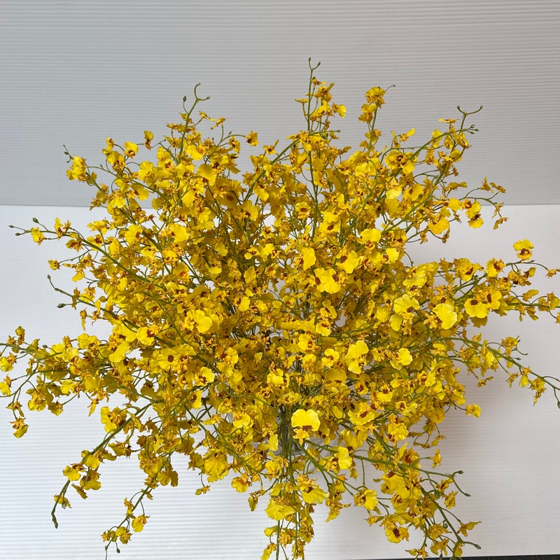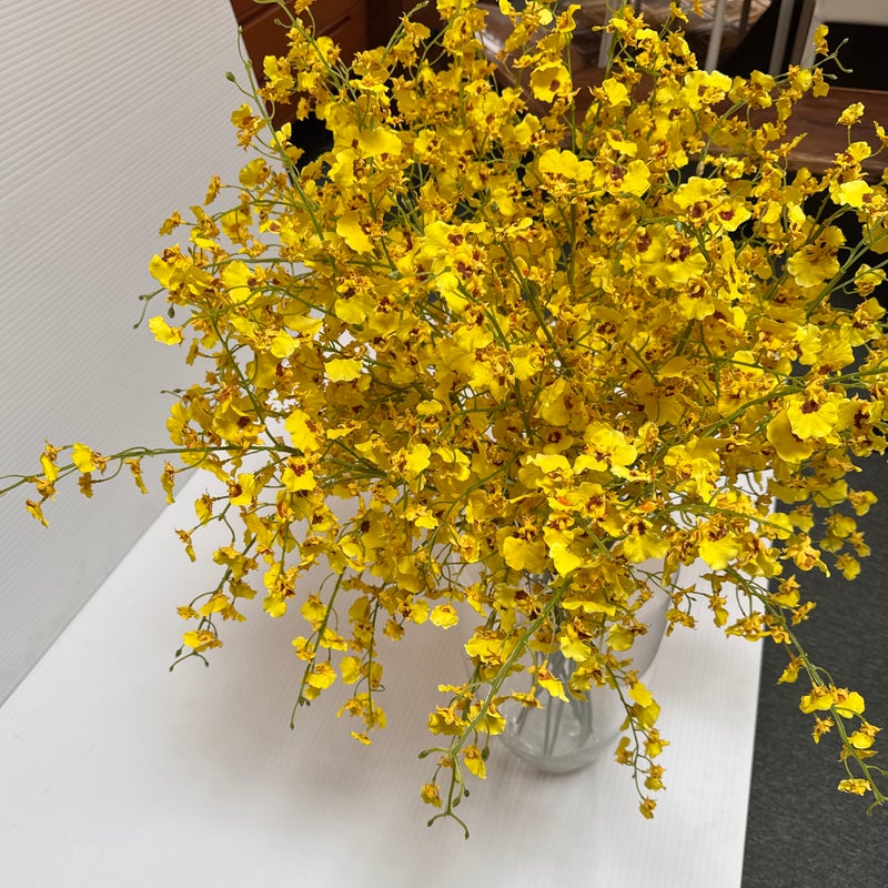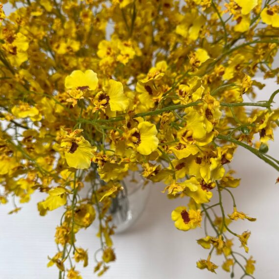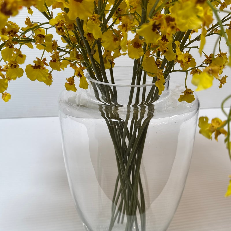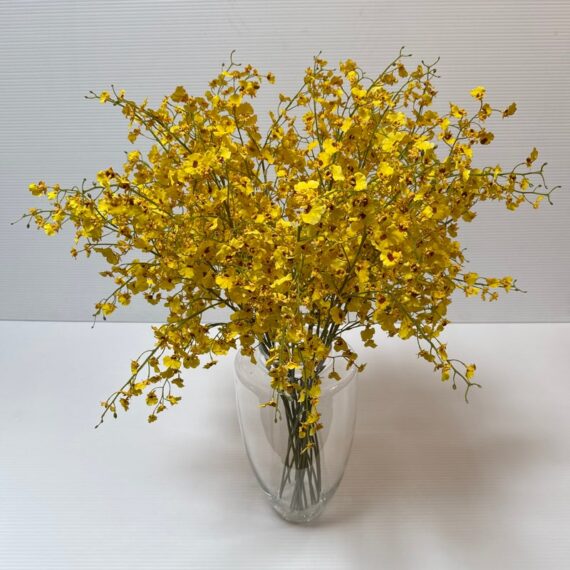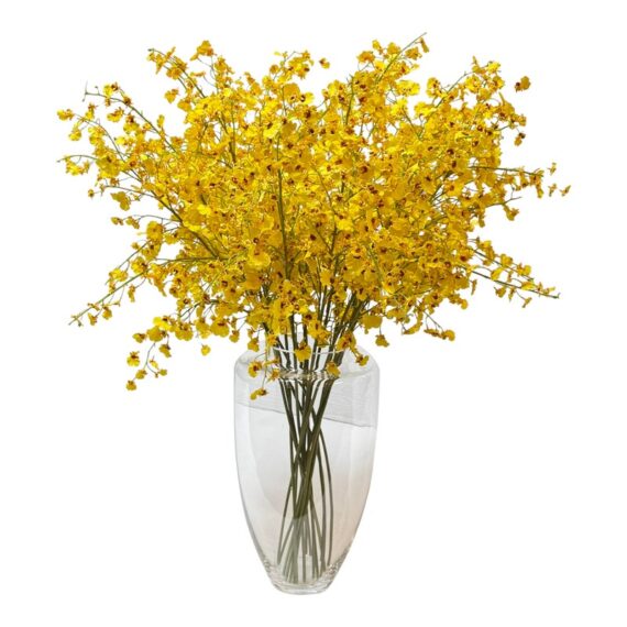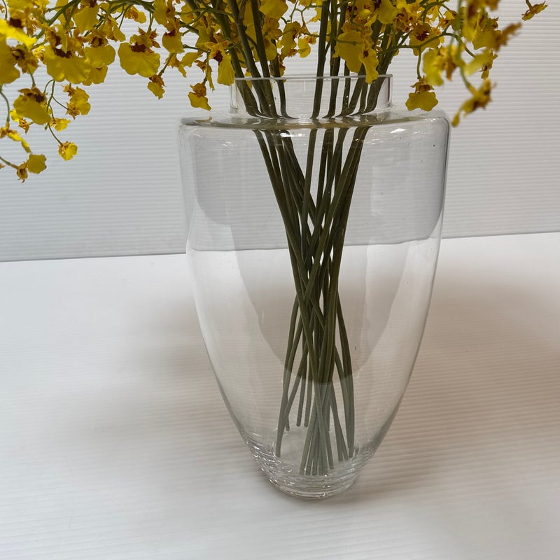 Design Plus Gallery presents a Set of 17 Forsythia Branches in Vase from Pottery Barn. The branches were hand assembled of plastic and polyester over a wire center and ten stems are included with the glass vase. Is in good condition for its age with minimal surface wear that is consistent with use.