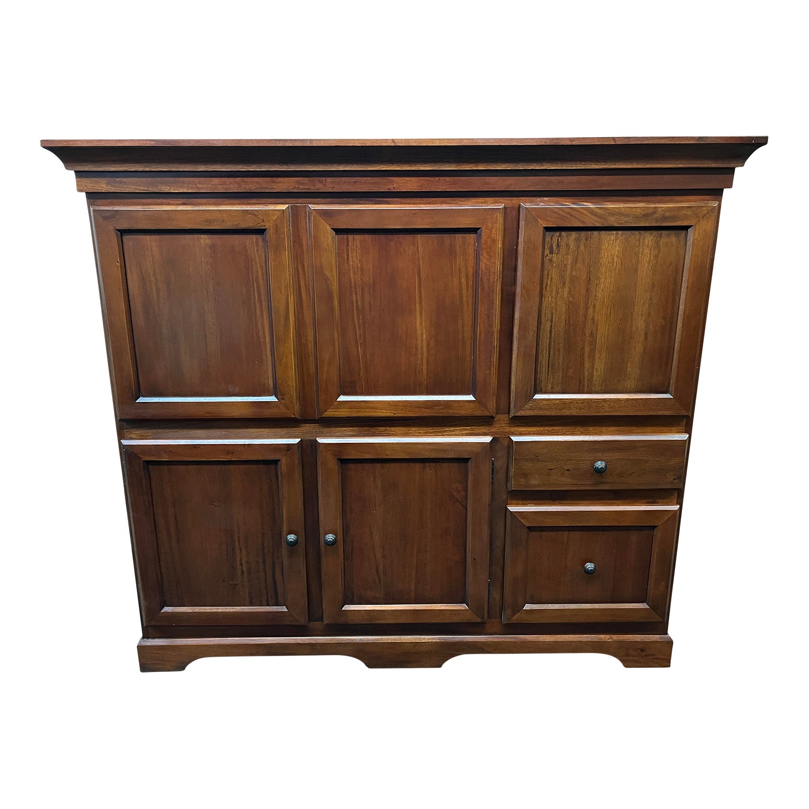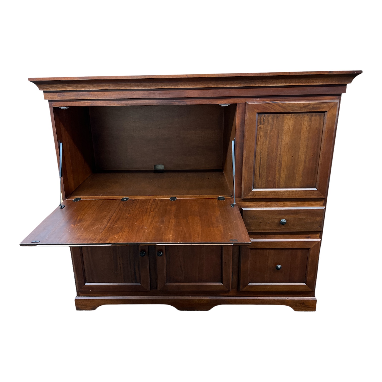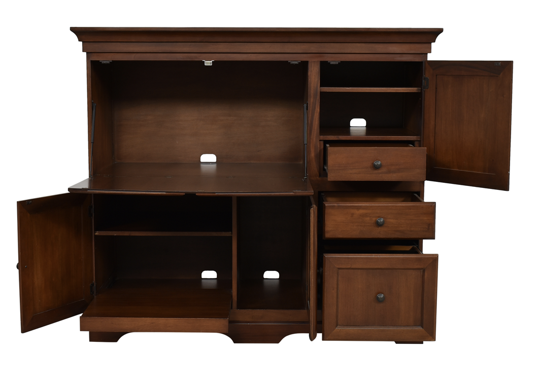 Design Plus Gallery presents the Garrison Secretary Desk by Pottery Barn. A Transitional work space, the desk provides desk space and storage and then just close the doors to hide the day’s activity! Three drawers and multiple cubbies are crafted with mahogany veneer over MDF (medium density fiberboard) and plywood, with antiqued bronze pulls. Cord access.