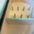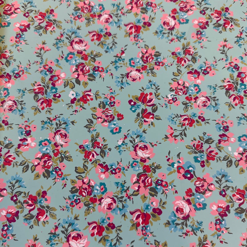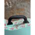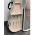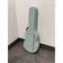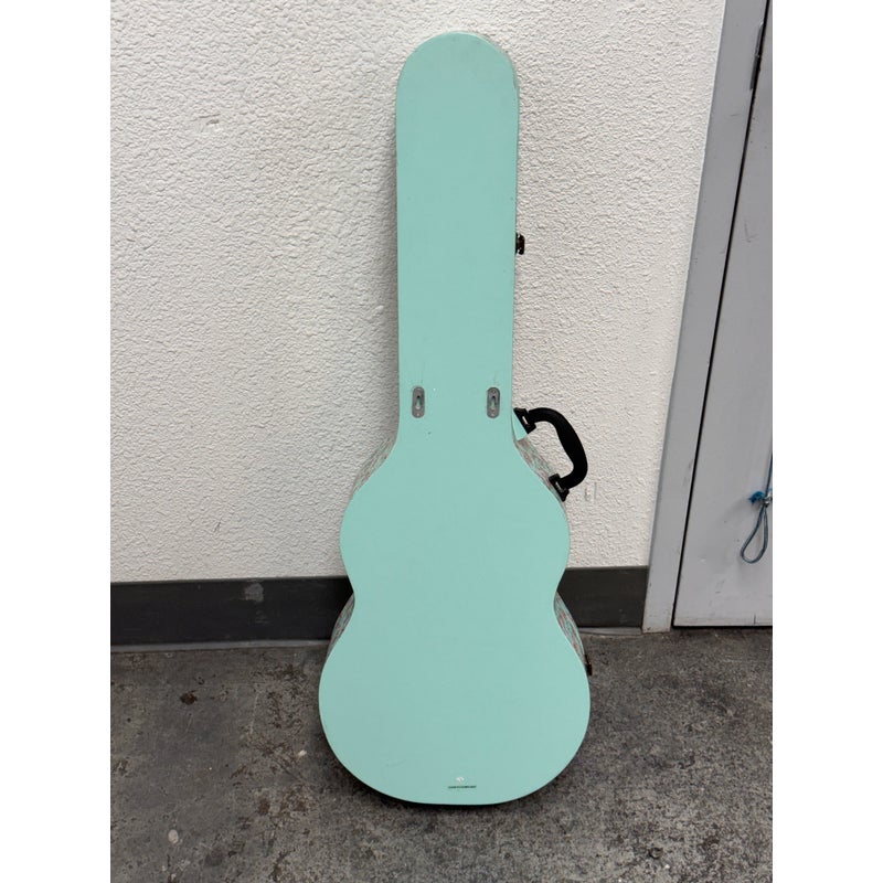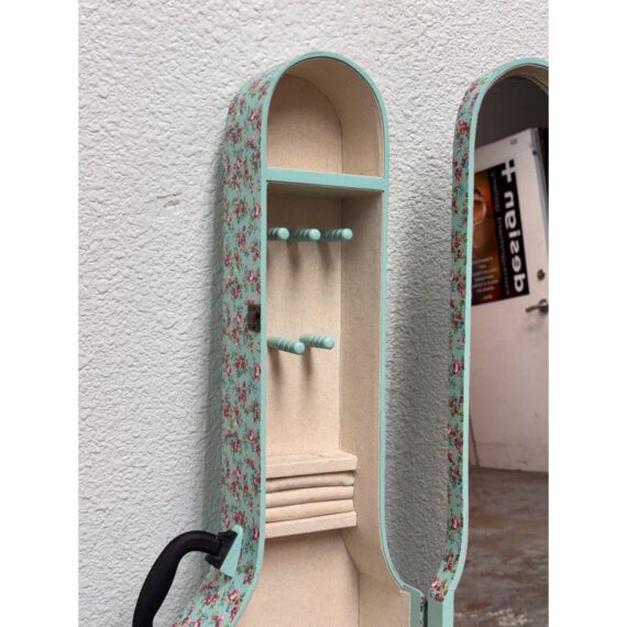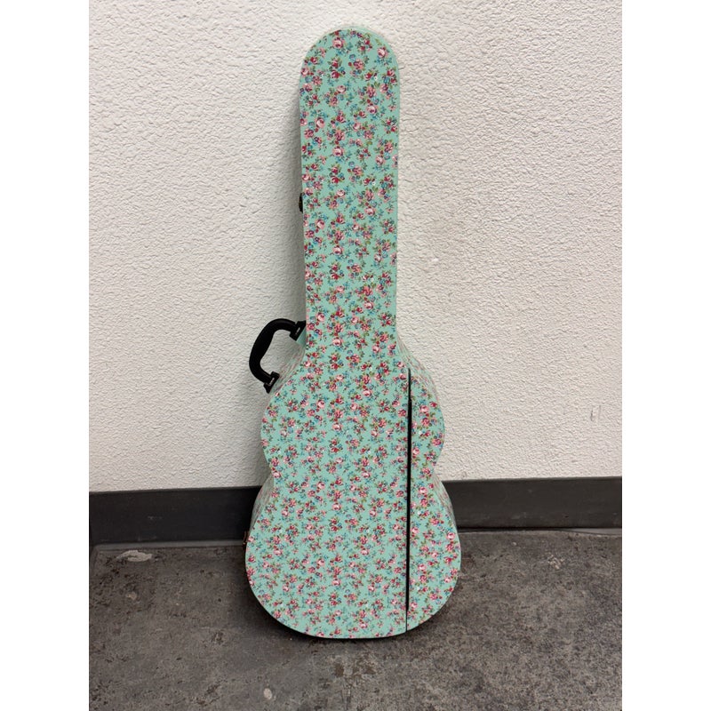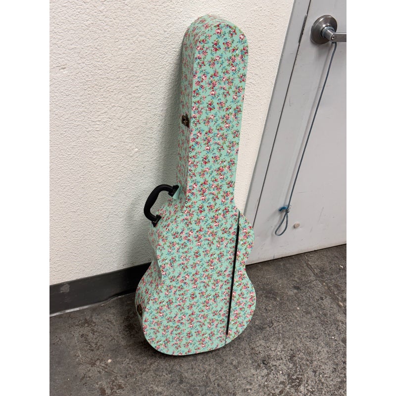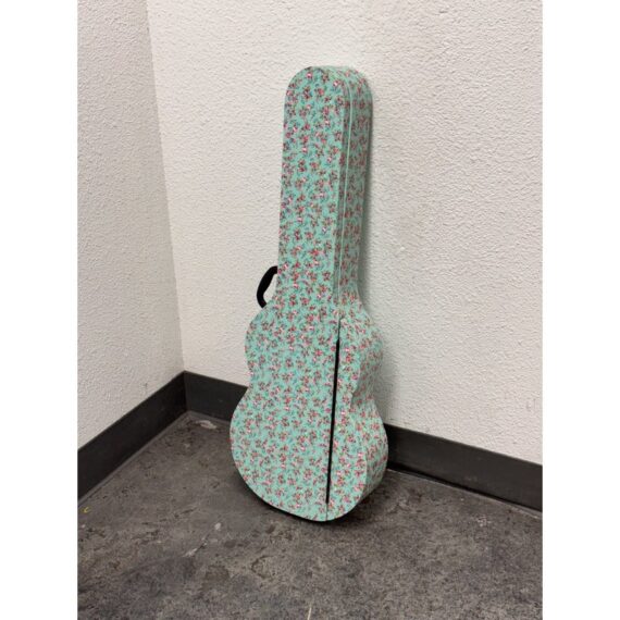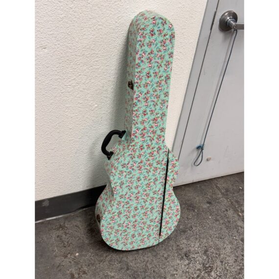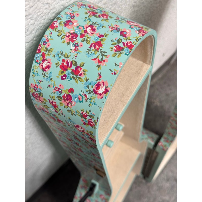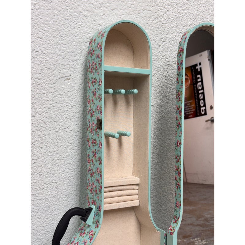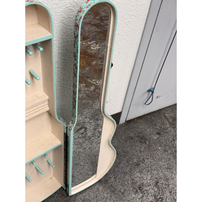 Design Plus Gallery presents a Guitar Shaped Jewelry Storage Case + Mirror from Pottery Barn. This whimsical guitar form case is wrapped in a mint floral print with a black carrying handle and secure side latches. The interior opens to a built in mirror on one side and organized storage on the other, including hanging pegs for necklaces and bracelets, additional pegs below, and a padded ring bar for smaller pieces. The molded compartments keep items separated and easy to sort, and the structured shell holds its shape when closed. This is a discontinued model with the brand and is in good condition with visible and minimal wear from usage