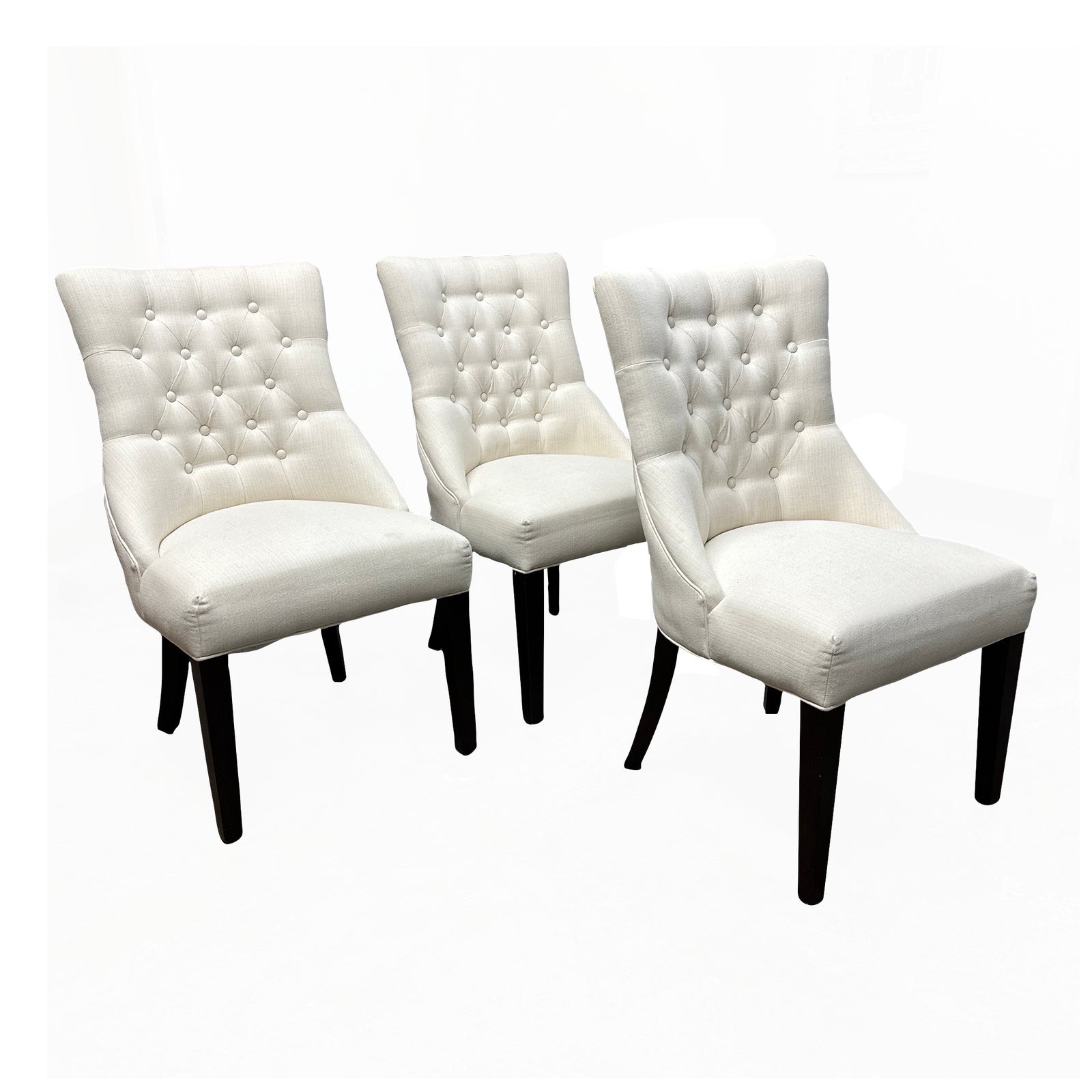 Design Plus Gallery presents a Set of Four Hayes Tufted Upholstered Dining Chairs by Pottery Barn. Designed with deep button tufting and a barrel-curved back, offers unparalleled comfort and style. Made of kiln-dried solid wood frame. Crafted from solid wood for easy care, durability, and natural beauty. Seat and back padding is a lofty blend of foam and fiber fill. Upholstered in an off white linen. Visible and minor wear from usage. Made in USA.