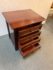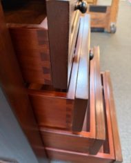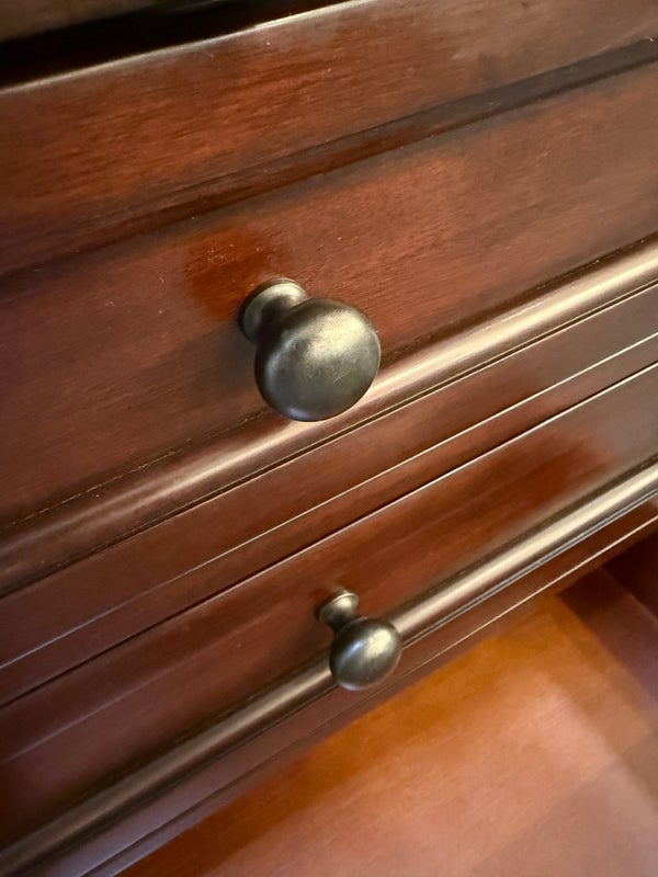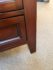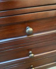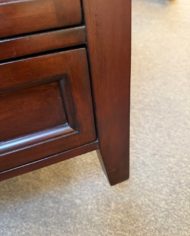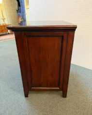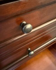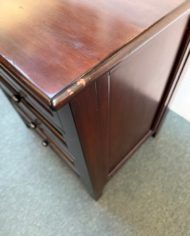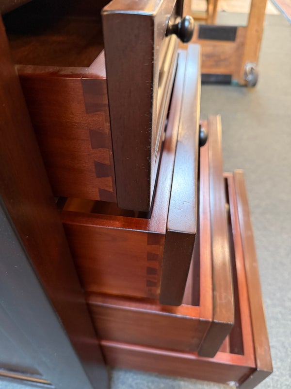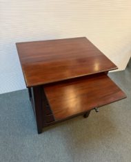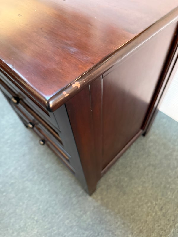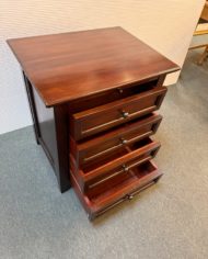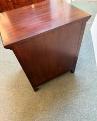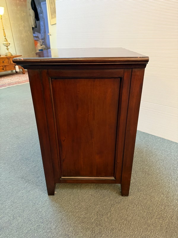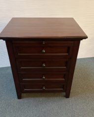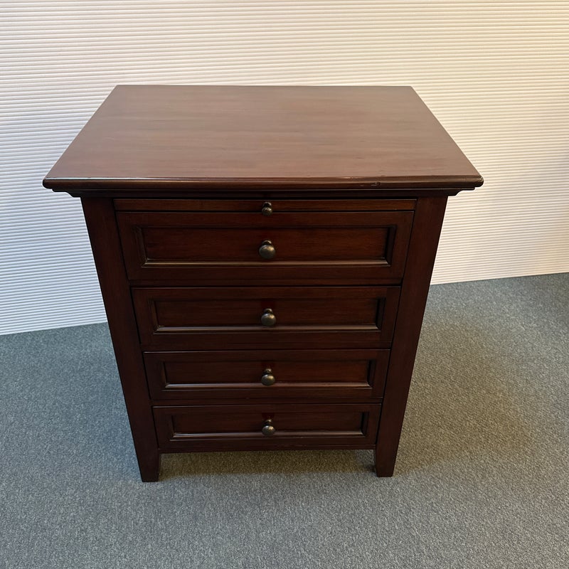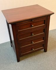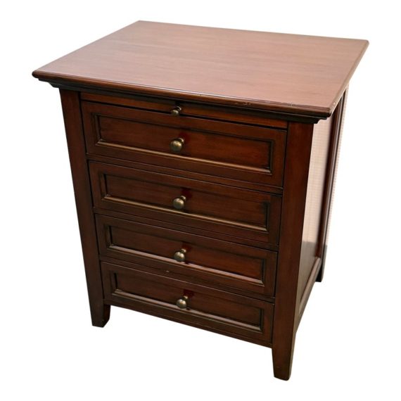 Design Plus Gallery presents a Hudson Nightstand by Pottery Barn. Simple lines and minimal embellishment recall the artistry of Craftsman-style design in this nicely scaled piece in mahogany finished kiln-dried solids and veneers. The bedside cabinet has four dovetailed drawers, each with bronze finished brass pulls, and a convenient pull out shelf. Made in Indonesia. Light surface nicks, condition is consistent with age and use.