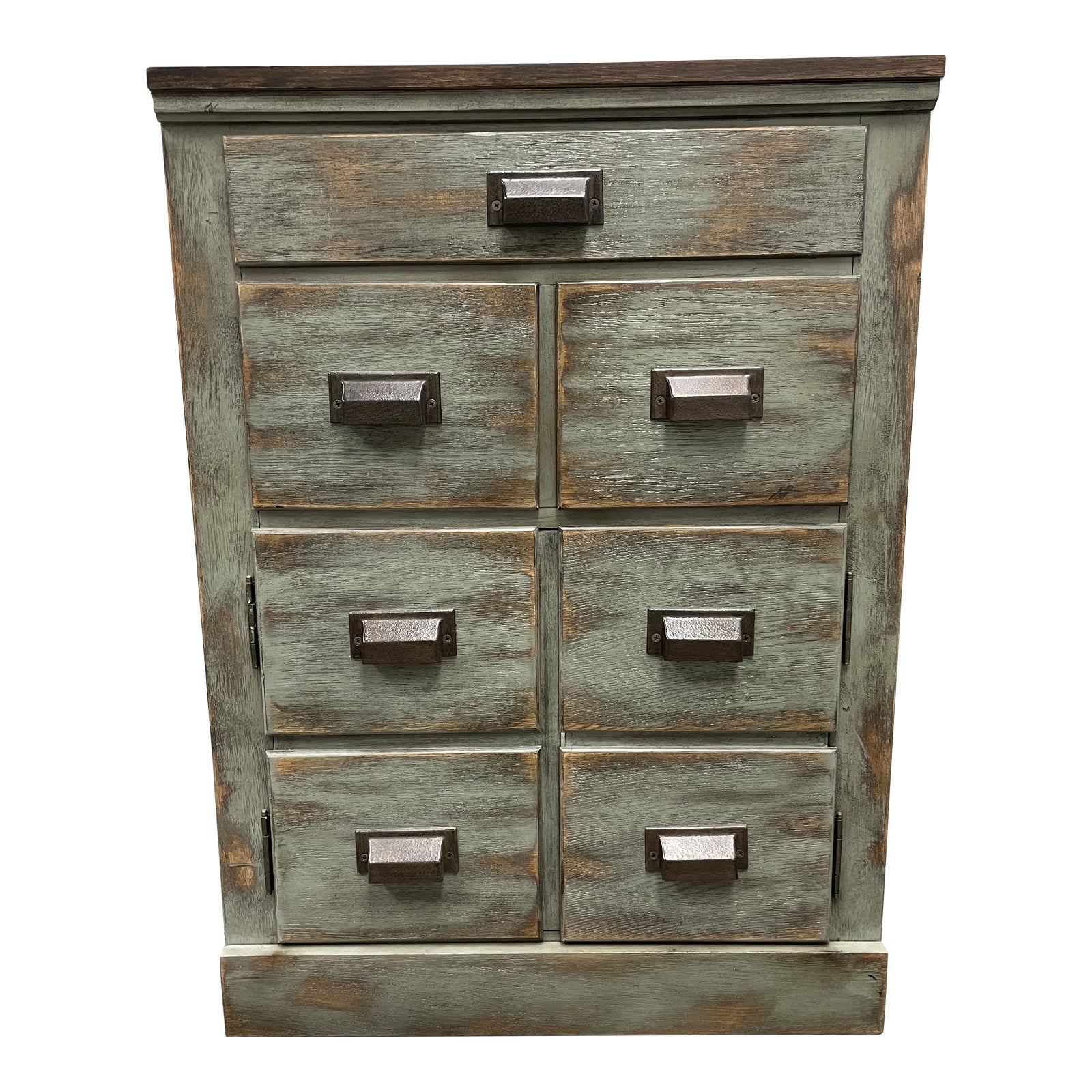 Design Plus gallery presents a Pottery Barn Industrial Antiqued Small Cabinet Sideboard. Wood frame is distressed and blends a warm chestnut tone with a teal gray dry brush paint application. Face has the look of an old pharmacy cabinet with oiled bronze hardware pulls. Lower four pulls make up a single cabinet door with three functional dovetail drawers on top. An electrical out put opening is at the base out through the cabinet’s interior. Top is richly stained and sits at counter height. Easy to fit scale of this charming unit can fit in almost any office, kitchen or bathroom setting. Minor wear, good condition.