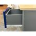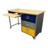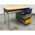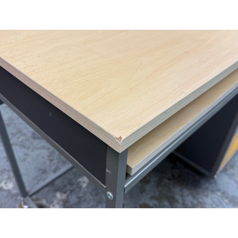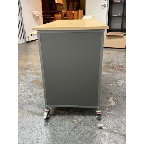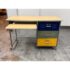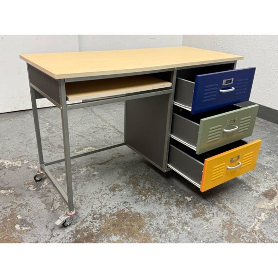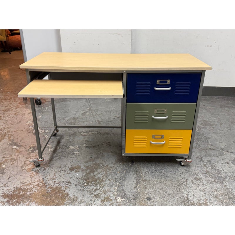 Design Plus Gallery presents the Teen Locker Desk from Pottery Barn. It has a durable metal frame with a natural wood top and multi-color drawers. There is a pull out keyboard tray with three drawers of equal size but different colors; blue, green, and yellow. The most fun feature is this is a maneuverable desk as its rolls to and fro on casters. The brand no longer is producing this desk and it shows some visible wear but is in good condition overall.