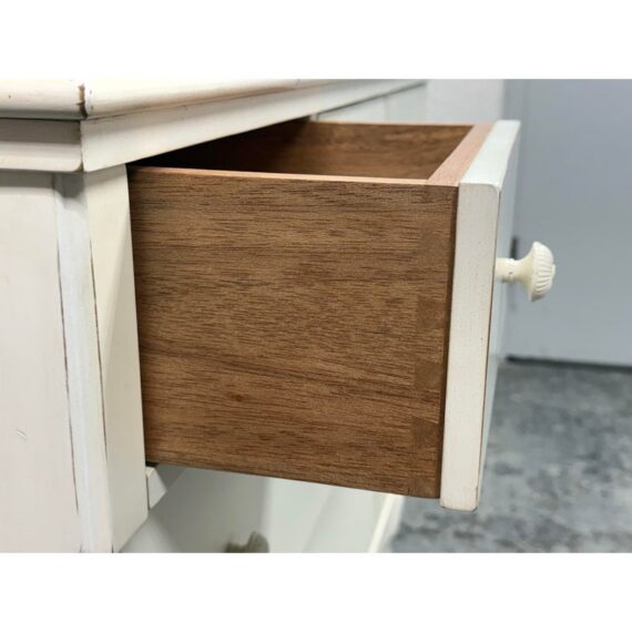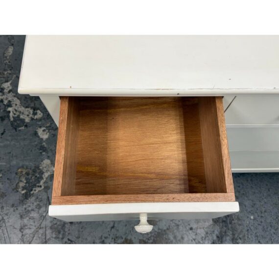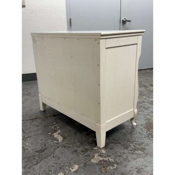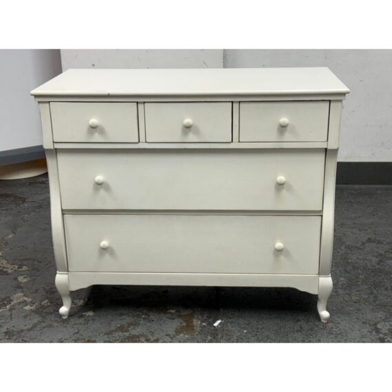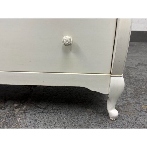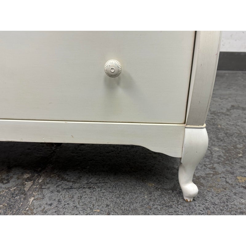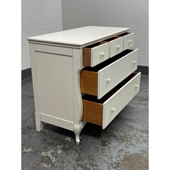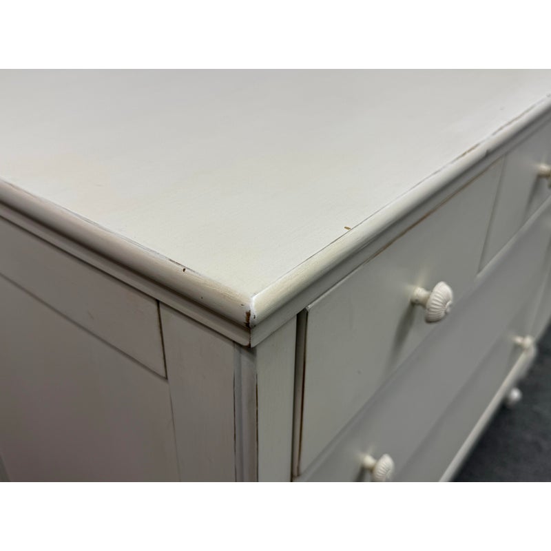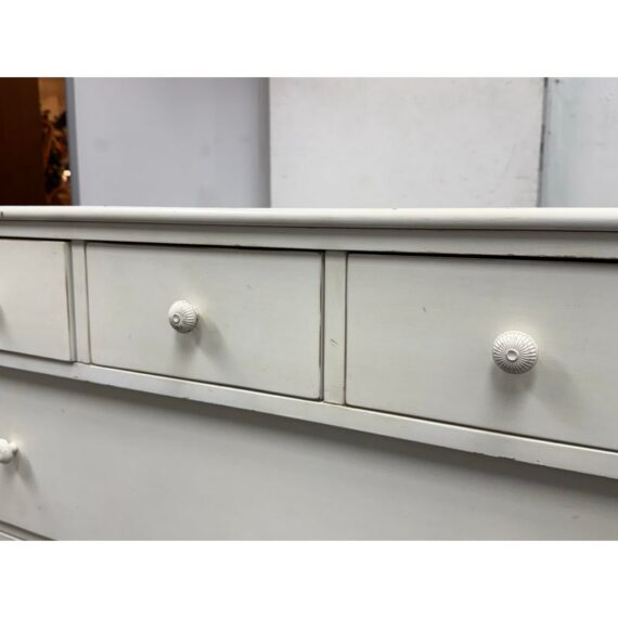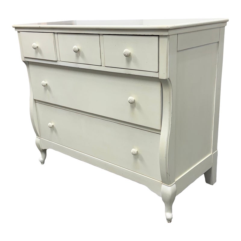 Design Plus Gallery presents the Genevieve Dresser from Pottery Barn Kids. The dresser is in an antique white painted finish that blends so well in children’s rooms. There is a top segment of drawers that are all equal and take up a third width each for compartmentalized storing of small and regularly necessary items. The lower two drawers are full width for folding and arranging. A great dresser to teach your little ones to organize their rooms. The item is in good condition, visible and minimal wear from usage. Made in Indonesia.