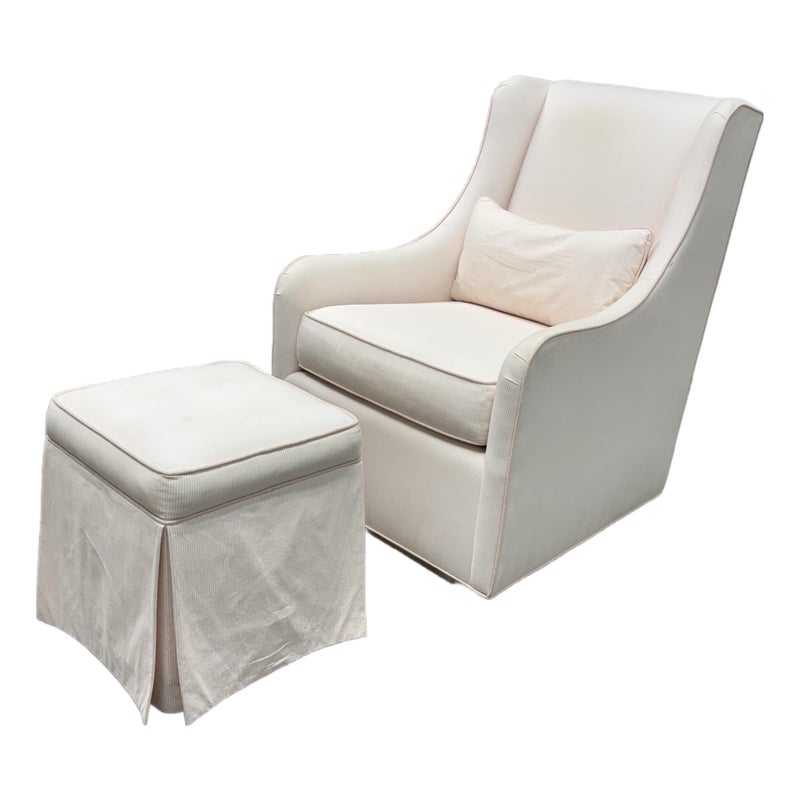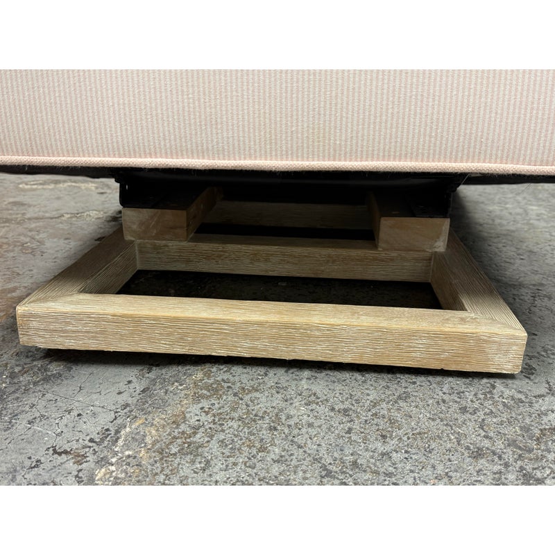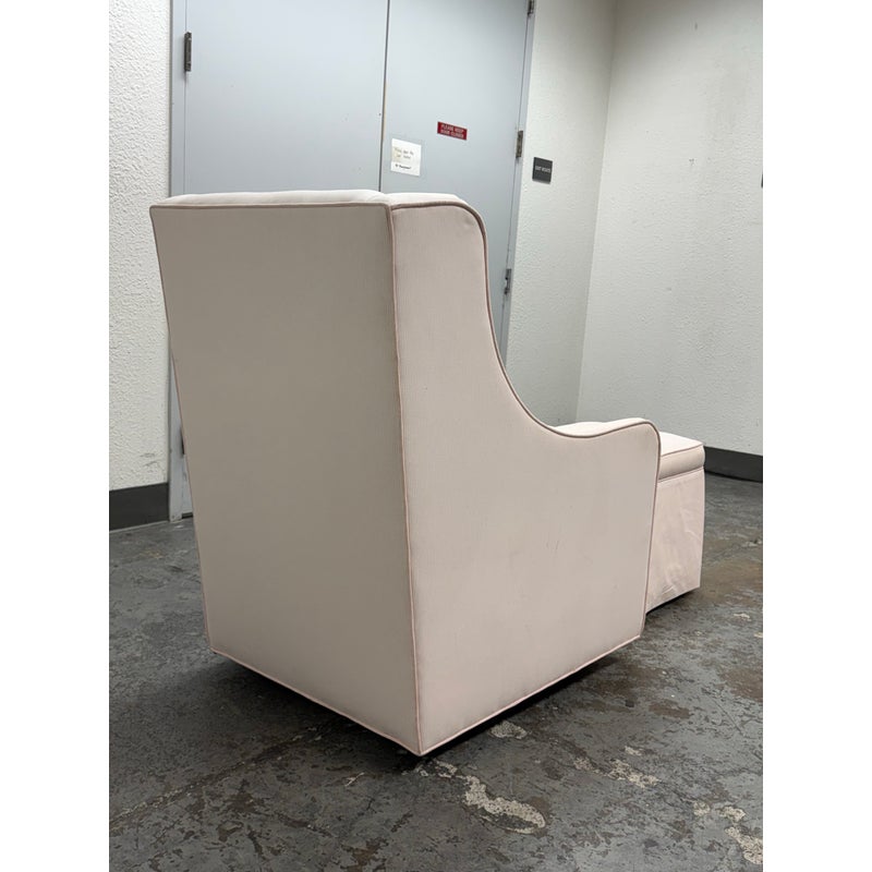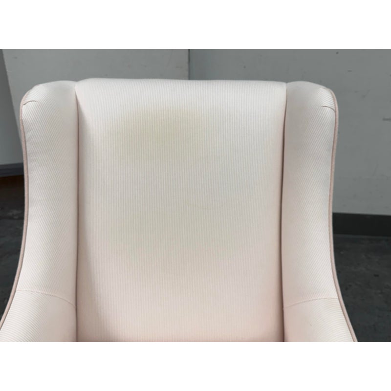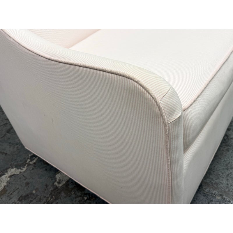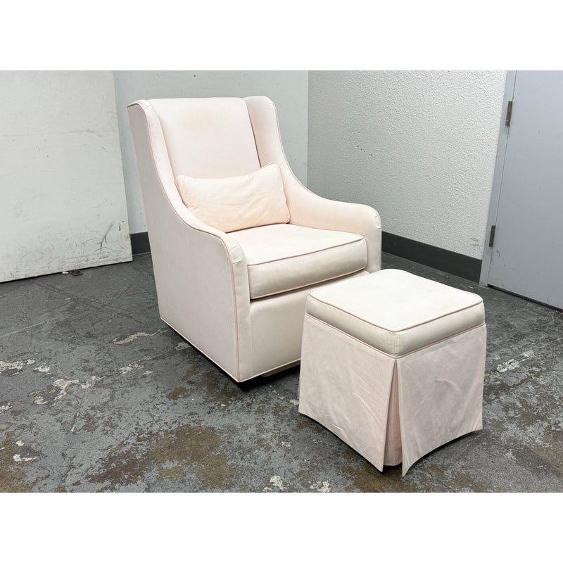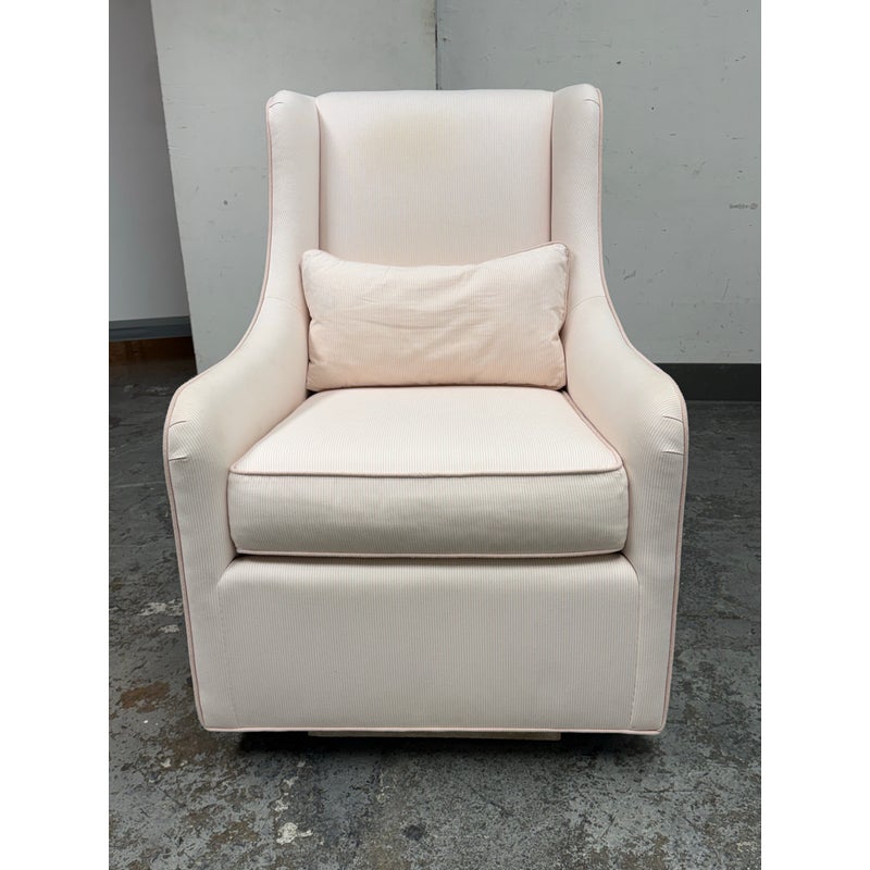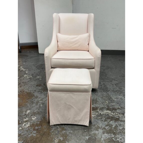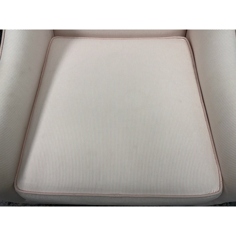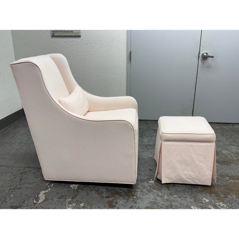 Design Plus Gallery presents the Merced Glider + Ottoman from Pottery Barn Kids. With its clean lines and sides that slope into curved arms, the Merced Glider blends timeless and modern design elements. Extra-thick cushioning and a sturdy hardwood frame combine welcoming comfort with strength and longevity. Plus, a skirted ottoman perfectly proportioned to keep you comfortable when nursing. The set was custom upholstered in a pale pink ticking stripe with white and included a lumbar pillow too. The removable seat cushion shows visible wear on both sides so a replacement or heavy duty clean is suggested. Other than that the chair + ottoman are in good condition with some visible wear that is consistent with their usage.