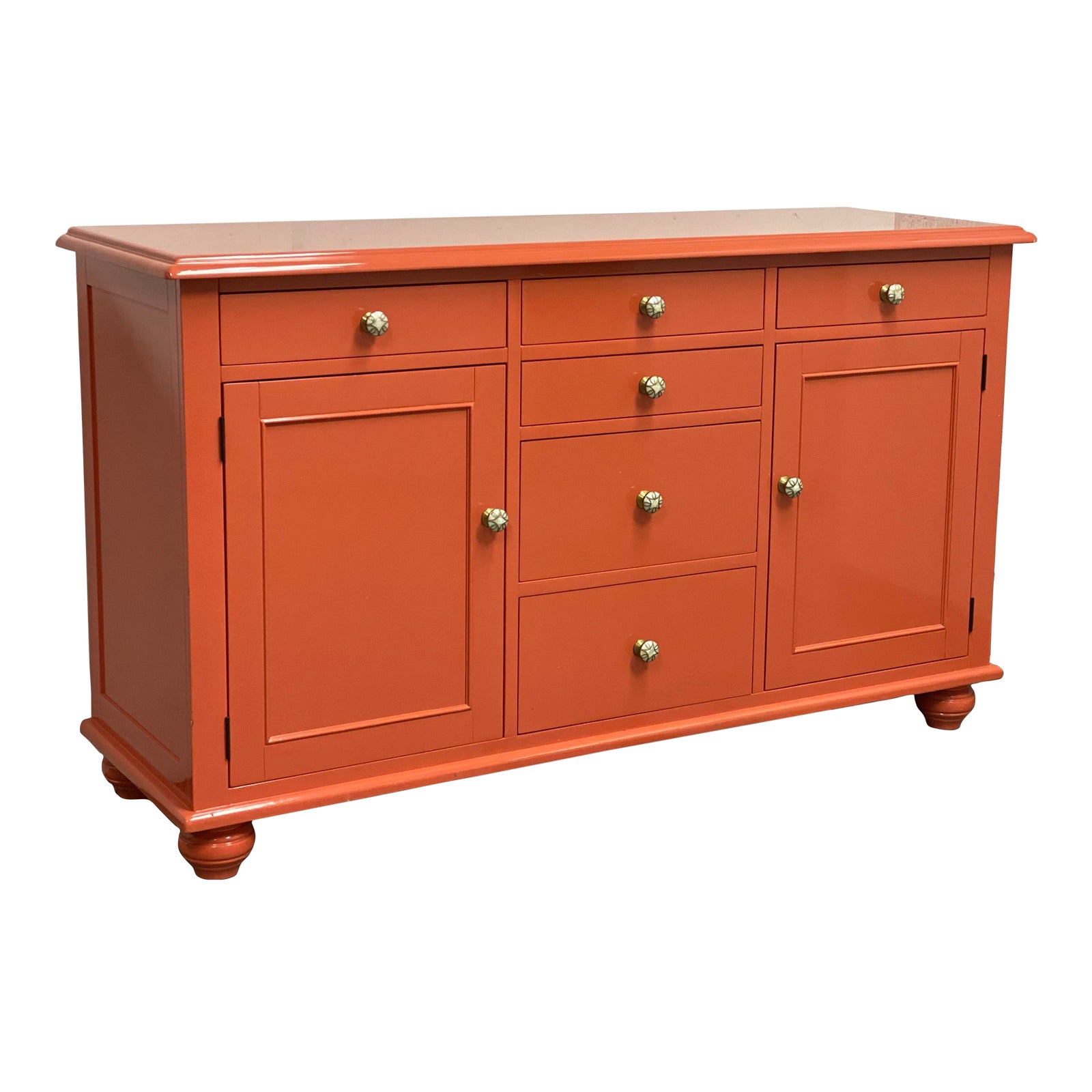 Design Plus Gallery presents a Custom Lacquered Laurel Buffet by Pottery Barn. Buffet has four center drawers, two side drawers and two side cabinets. The two top center drawers are compartmentalized for cutlery. This Laurel Buffet has had a customized Lacquer finish offering a unique coral color and features optimum shine. The finish shows little wear but has some small chips. It is further accented with metal with mother of pearl drawer knobs. Minor wear consistent with age and use.