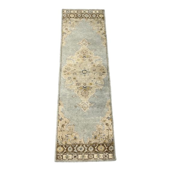 Design Plus Gallery presents a 2ft6in x 9ft Light Blue Runner by Pottery Barn. An ornate symmetrical tan medallion rests in the runner’s center over a blue background. The ends are a mix of tan, blue and taupe; taupe lines and tan field corners contain botanical accents. The rug is Persian-inspired and hand tufted with 100% wool. The backing is made with synthetic latex that doesn’t dry out or break down over time. Visible and minor wear from use; runner is in good condition.