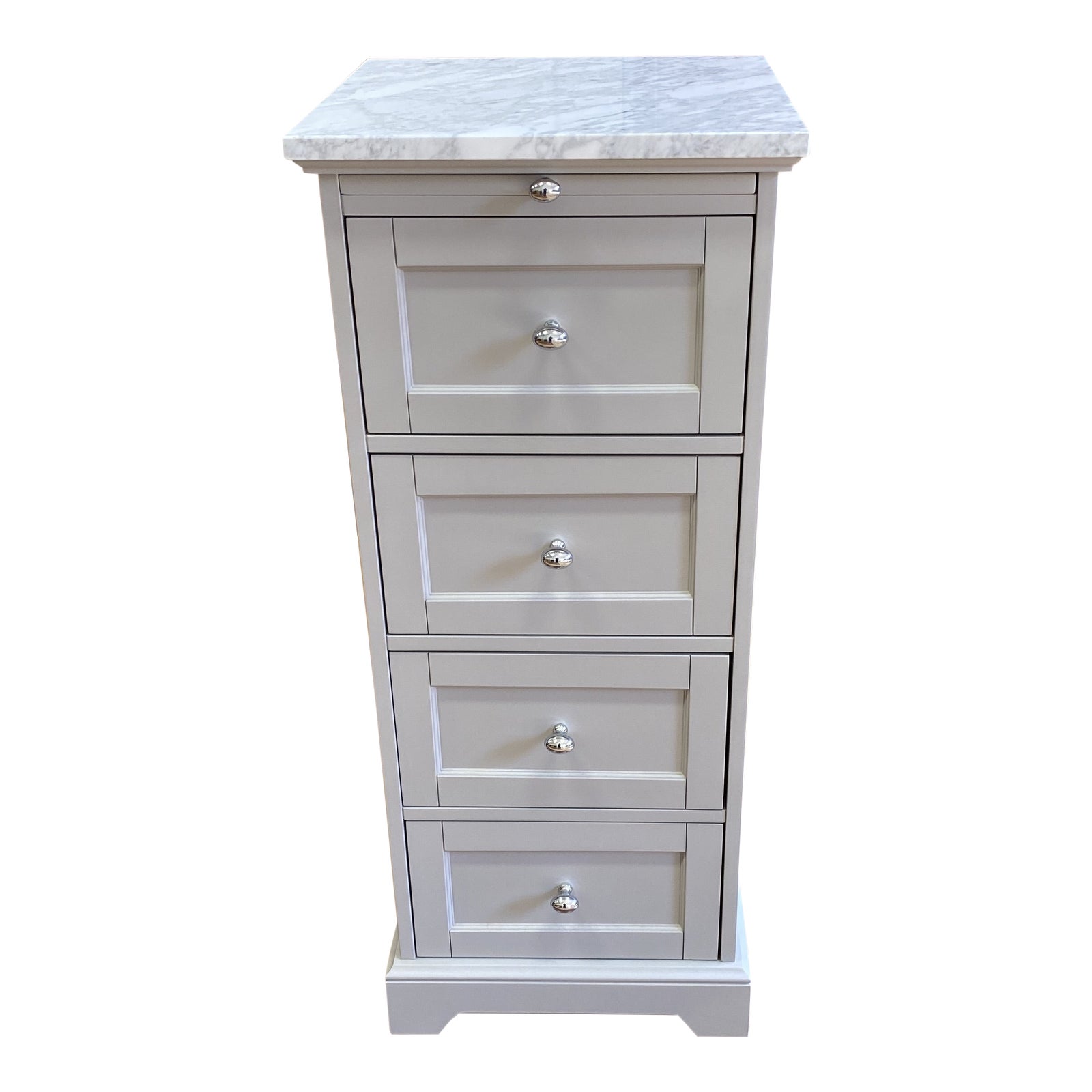 Design Plus Gallery presents a Marble-Top Sundry Tower by Pottery Barn. Topped with Carrara marble, a stylish tower features a pullout breadboard above four paneled drawers. Crafted of hardwood and MDF, an engineered wood that lends exceptional strength. Fitted with polished-nickel hardware.