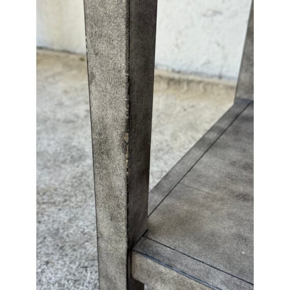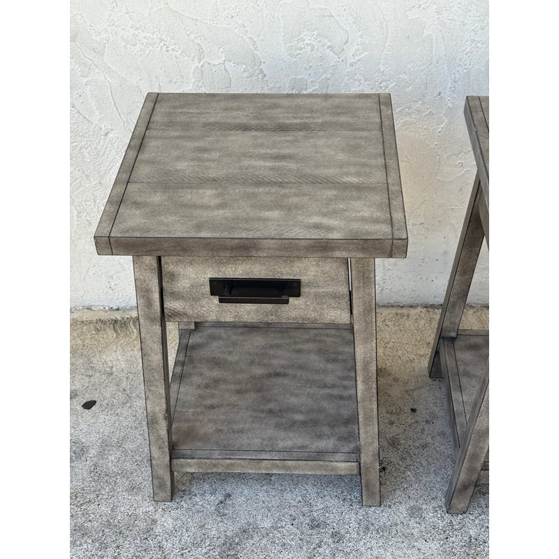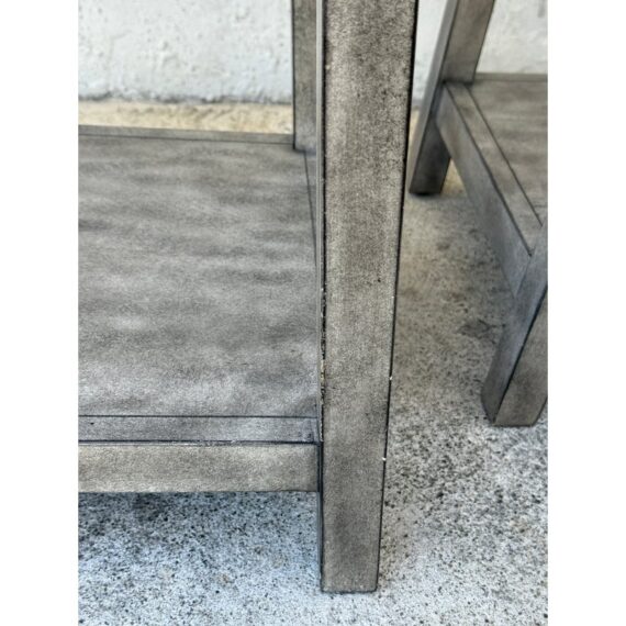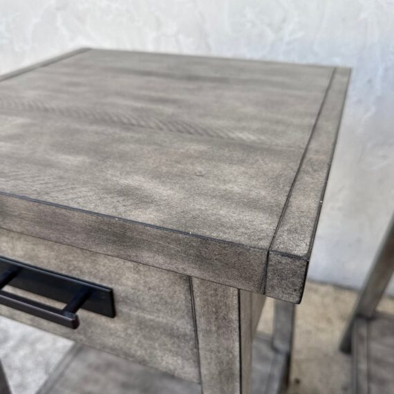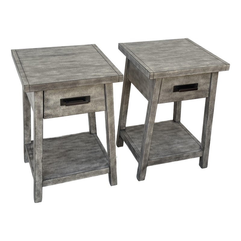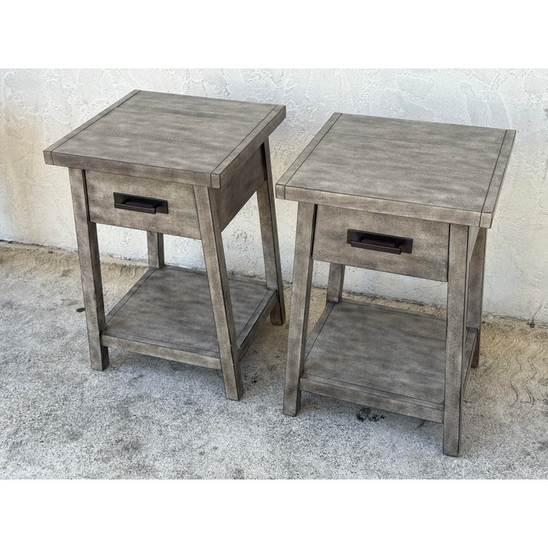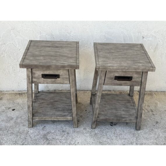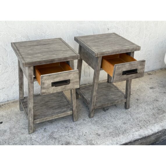 Design Plus Gallery presents a Pair of Mateo Nightstands by Pottery Barn. Crafted from solid woods and veneers. A weathered, distressed finish with rough-sawn detailing and a depth of color that will bring warmth and character to your space. The nightstand’s drawer and shelf provide convenient display and storage space, and is accented with a dark-bronze drawer pull. In good condition, visible and minimal wear. This is a discontinued model. Made in Vietnam.