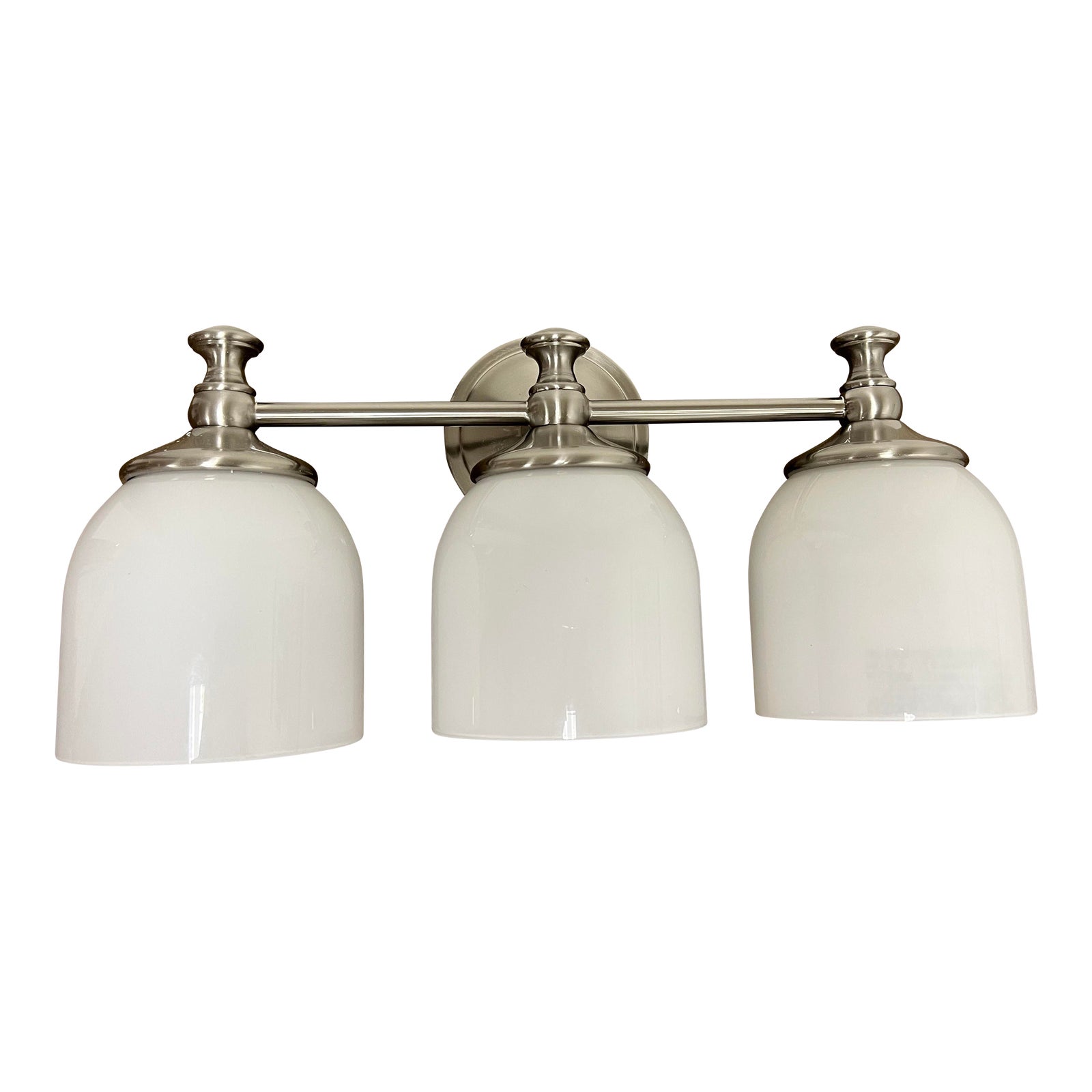 Design Plus Gallery presents a Mercer Triple Sconce by Pottery Barn. The frame is constructed with drop-forged sheet metal in a satin nickel finish. The shades are double-layered glass with a milk tone and white interior. Can be used indoors in a protected outdoor area. Minor wear consistent with use; sconce is in good condition.