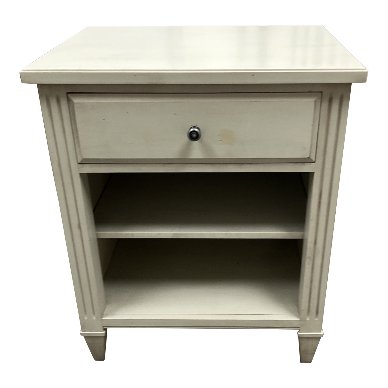 Design Plus Gallery presents a Pottery Barn Neoclassical Grey Nightstand. tapered feet and moldings are fused with a clean and fresh coat of grey conversion varnish for a timeless and fresh look. There is visible wear through out, nightstand is in good condition. Drawer is made with dovetail construction. Made in America.
