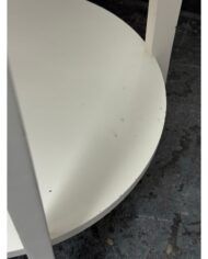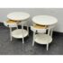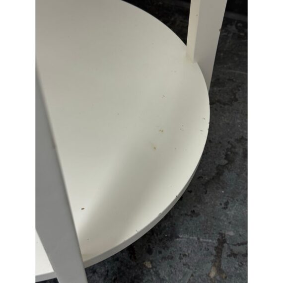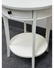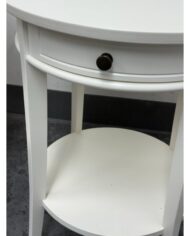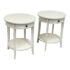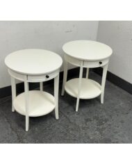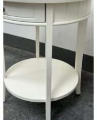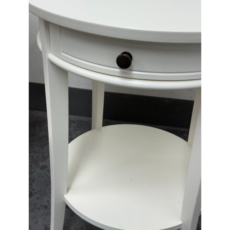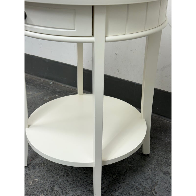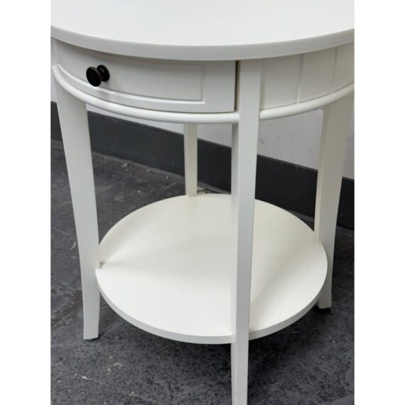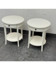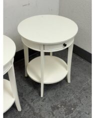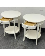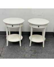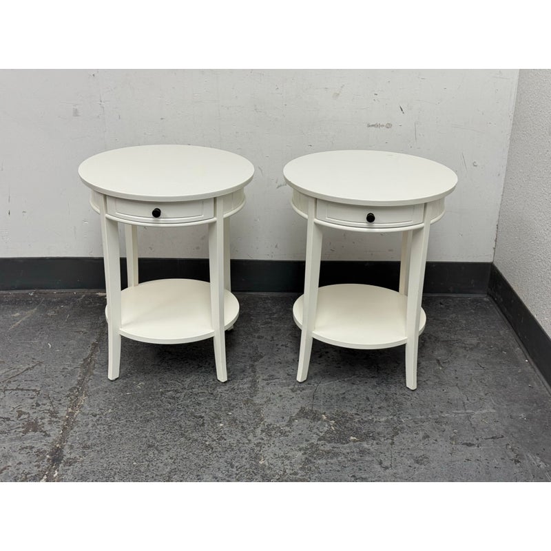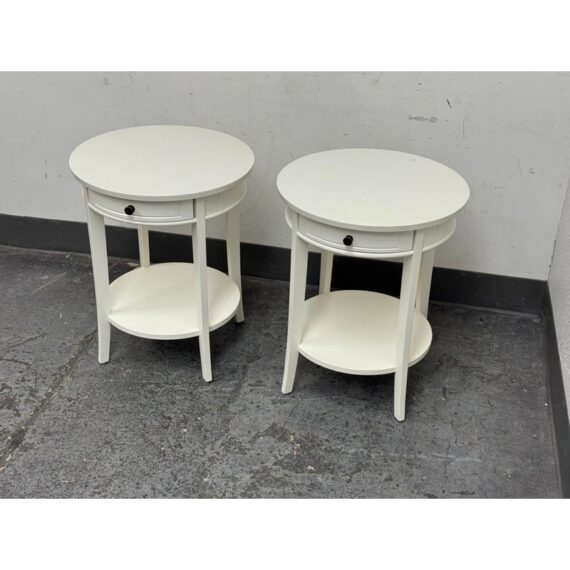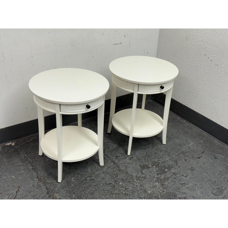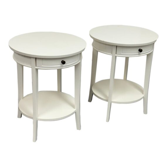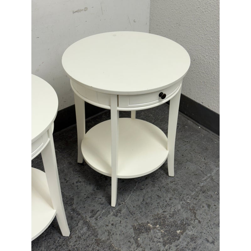 Design Plus Gallery presents a Pair of White Nightstands from Pottery Barn. The pair has a sweet aesthetic with their dual round surfaces and white lacquer finish. Each has a convenient drawer for storing items out of sight. The style has been discontinued by the brand. In good condition, visible wear on top surface and minimal wear.