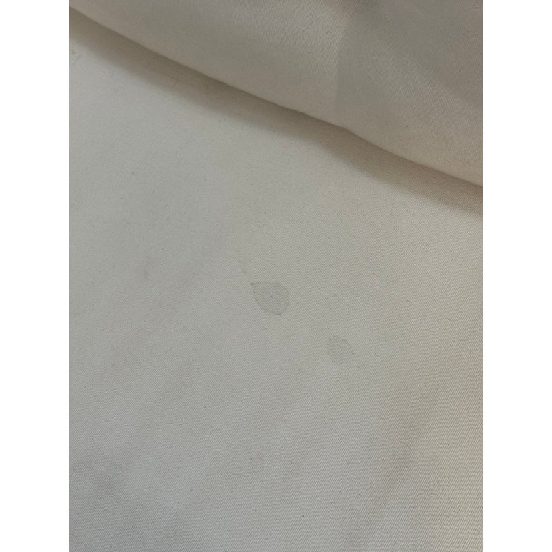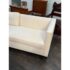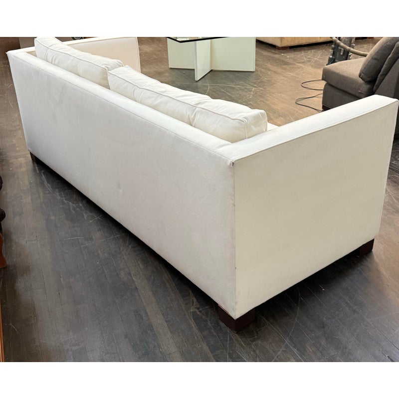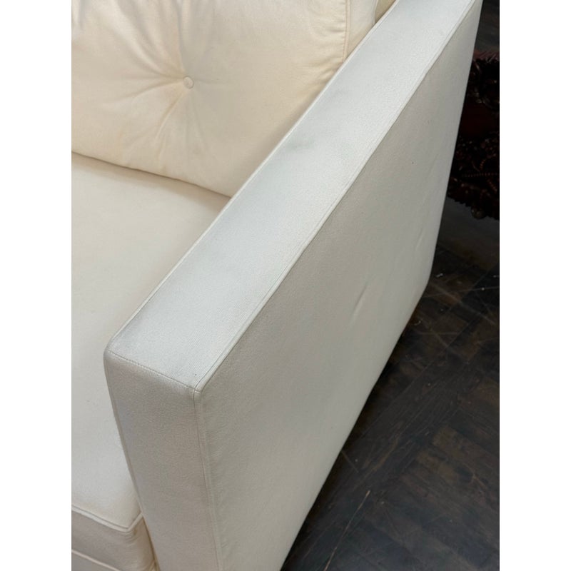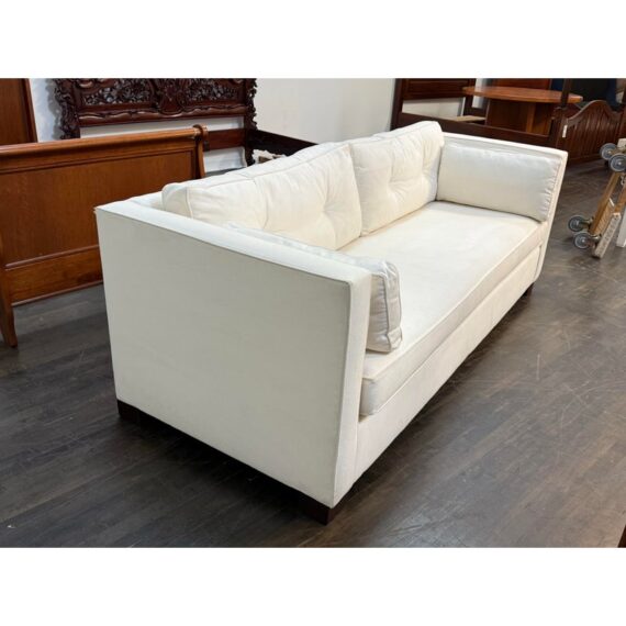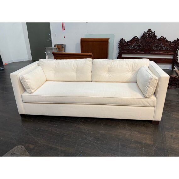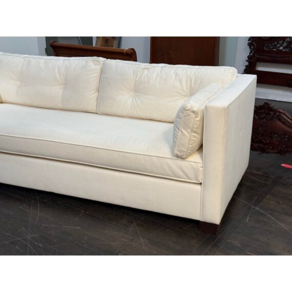 Design Plus Gallery presents a Sofa from Pottery Barn. This sofa is upholstered in an off-white fabric that lends a light, versatile presence to living spaces both casual and tailored. The design includes a single bench seat cushion with two back cushions detailed with subtle tufting. Two matching side lumbar pillows add extra support and comfort, while the squared arms and low profile create a balanced, modern form. Please note, there is a small tear located on the back corner of the sofa, and the sofa would benefit from a professional cleaning to refresh the upholstery. This is a discontinued model with the brand and is in fair condition, visible and minimal wear from usage.