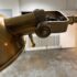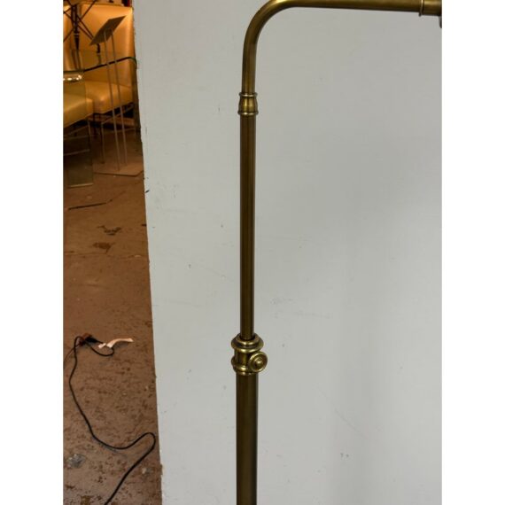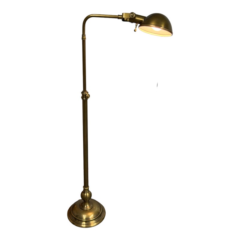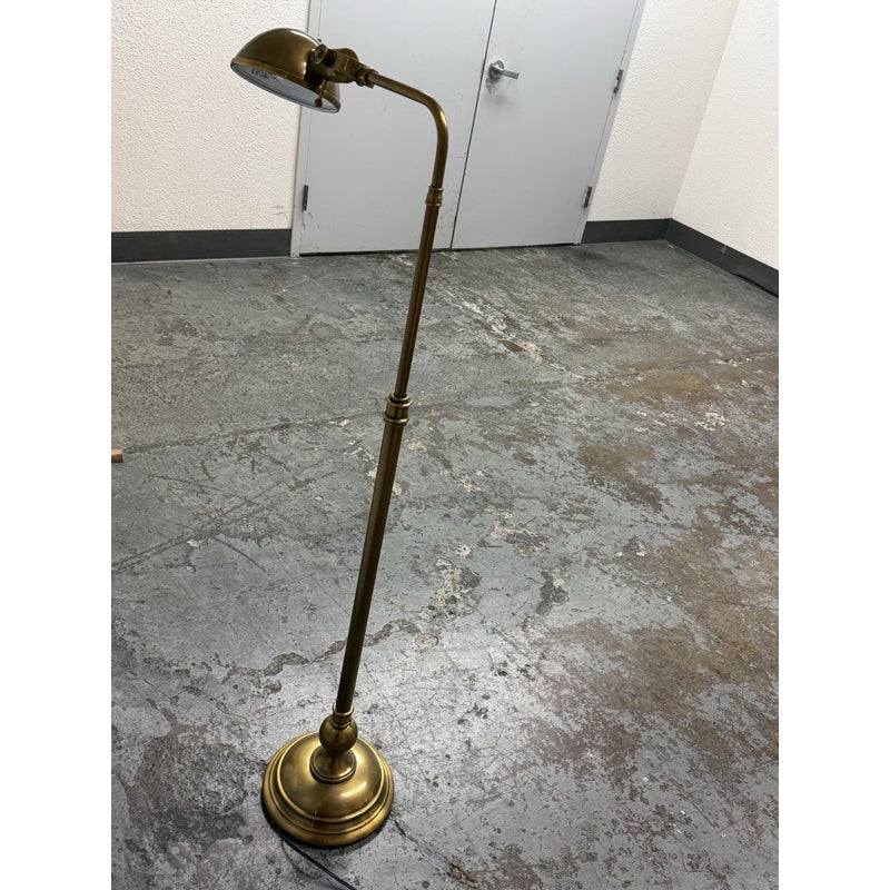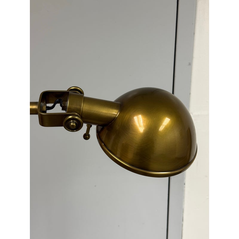 Design Plus Gallery presents a Pharmacy Task Floor Lamp from Pottery Barn. This floor lamp has an antique brass finish and is made with a round stepped base, a slender pole with a height-adjust collar, and an adjustable pivoting dome shade. This is a discontinued model with the brand and is in good condition with visible and minimal wear from usage.