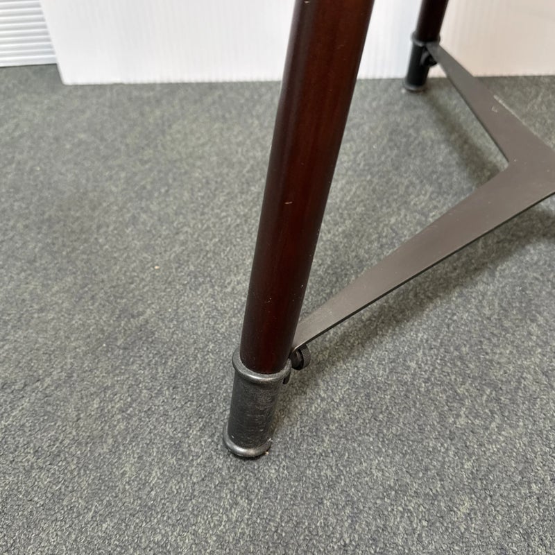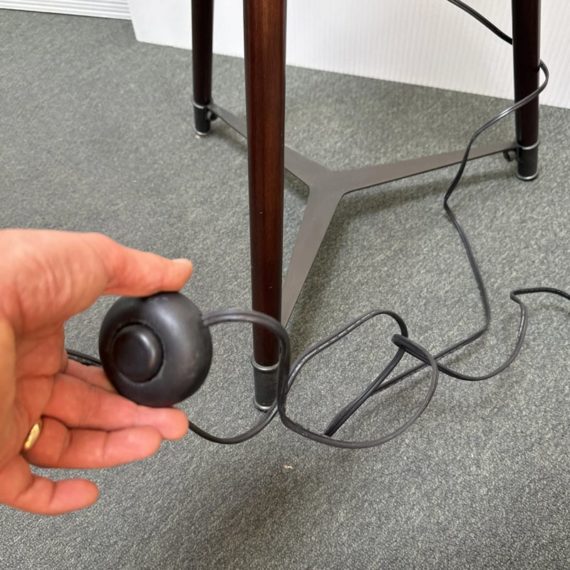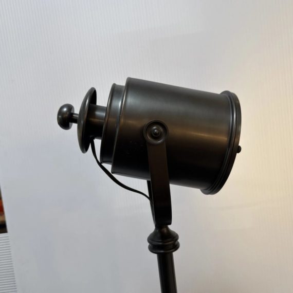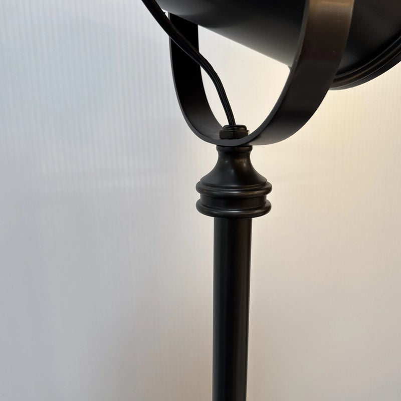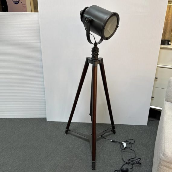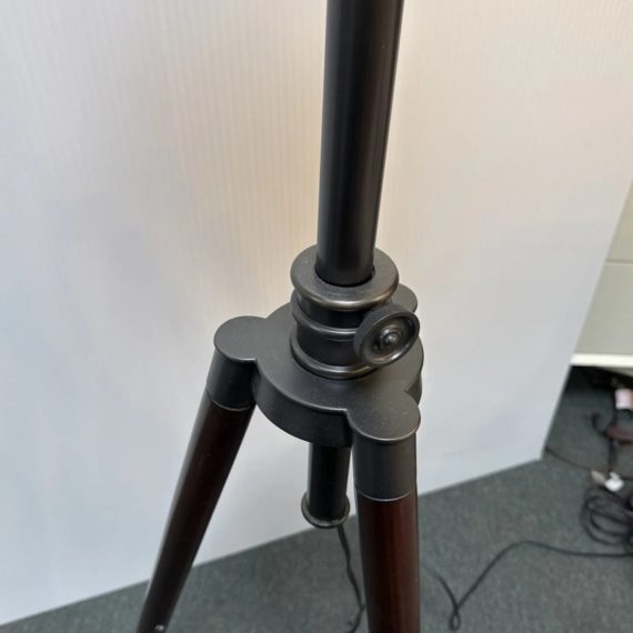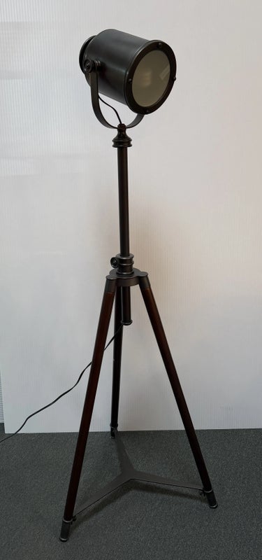 Design Plus Gallery presents a Photographer’s Adjustable Tripod Metal Floor Lamp by Pottery Barn. Inspired by the golden age of cinema when studio lights were designed to create a quality of light that both softened and highlighted actors’ expressions. Are you ready for your close up? Cast black metal with an espresso-stained hardwood base with a frosted glass diffuser. On/off switch located on socket.UL-listed. Imported. Minor wear from usage, good condition.