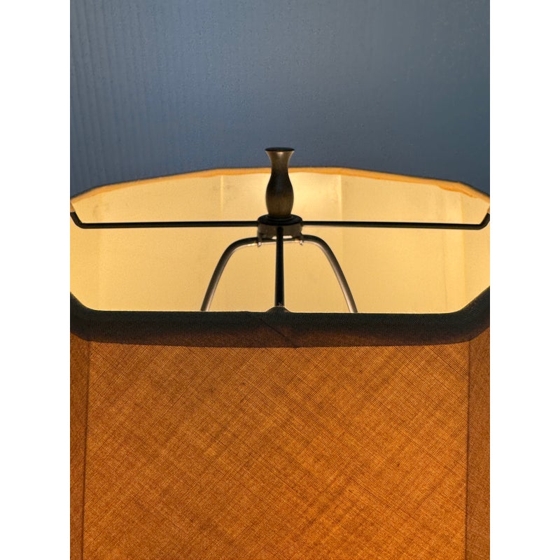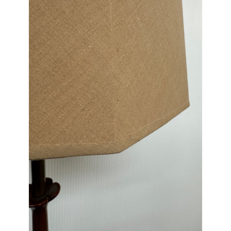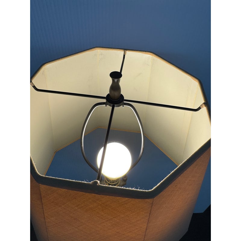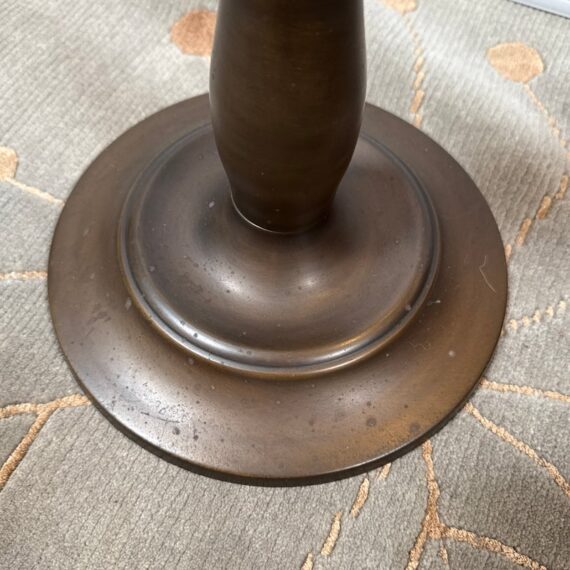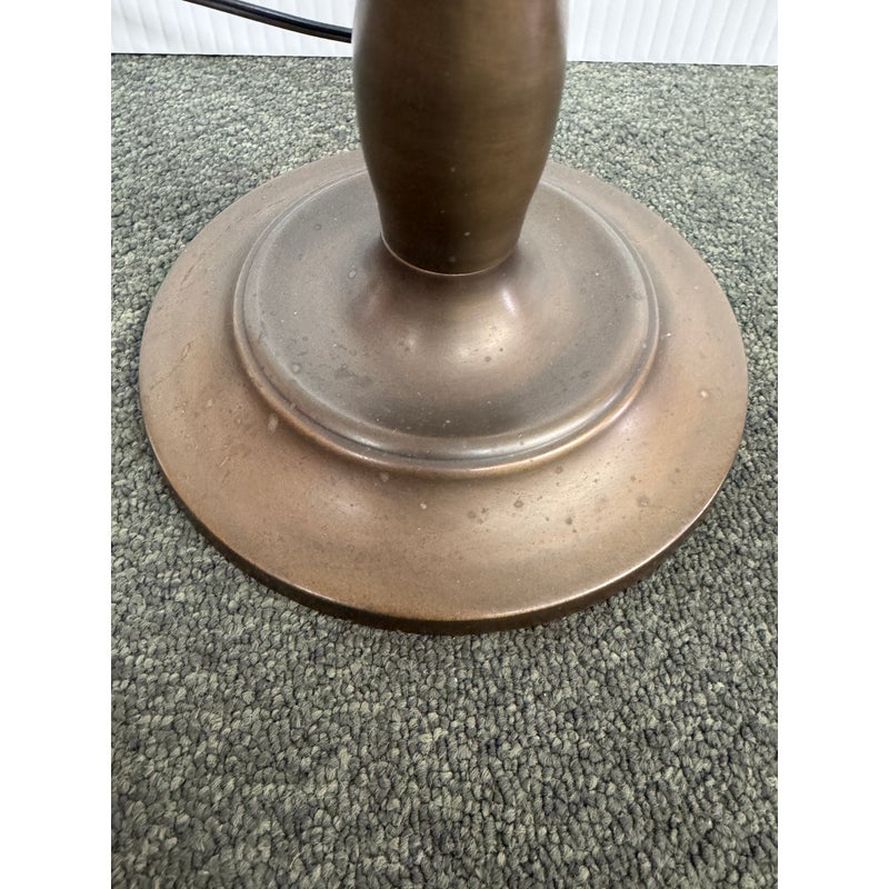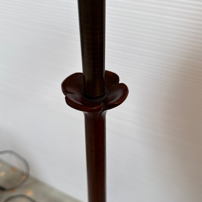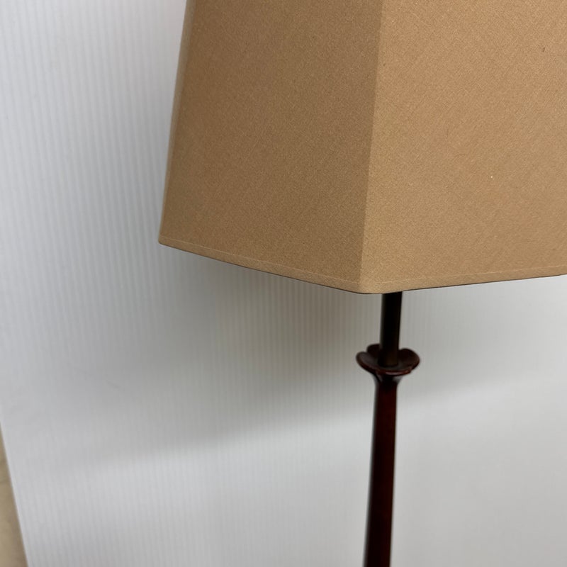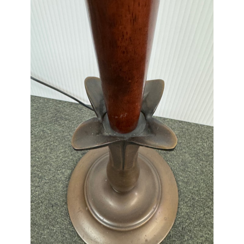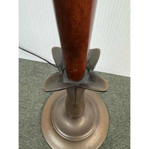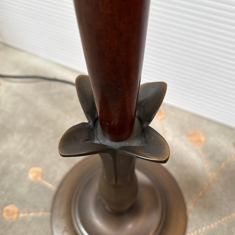 Design Plus Gallery presents a Pina Floor Lamp by Pottery Barn. Topped with the perfect custom shade, the beautifully turned candlestick silhouette is embellished with case brass petals. Simply lovely. Condition is fair, some pitting on base.