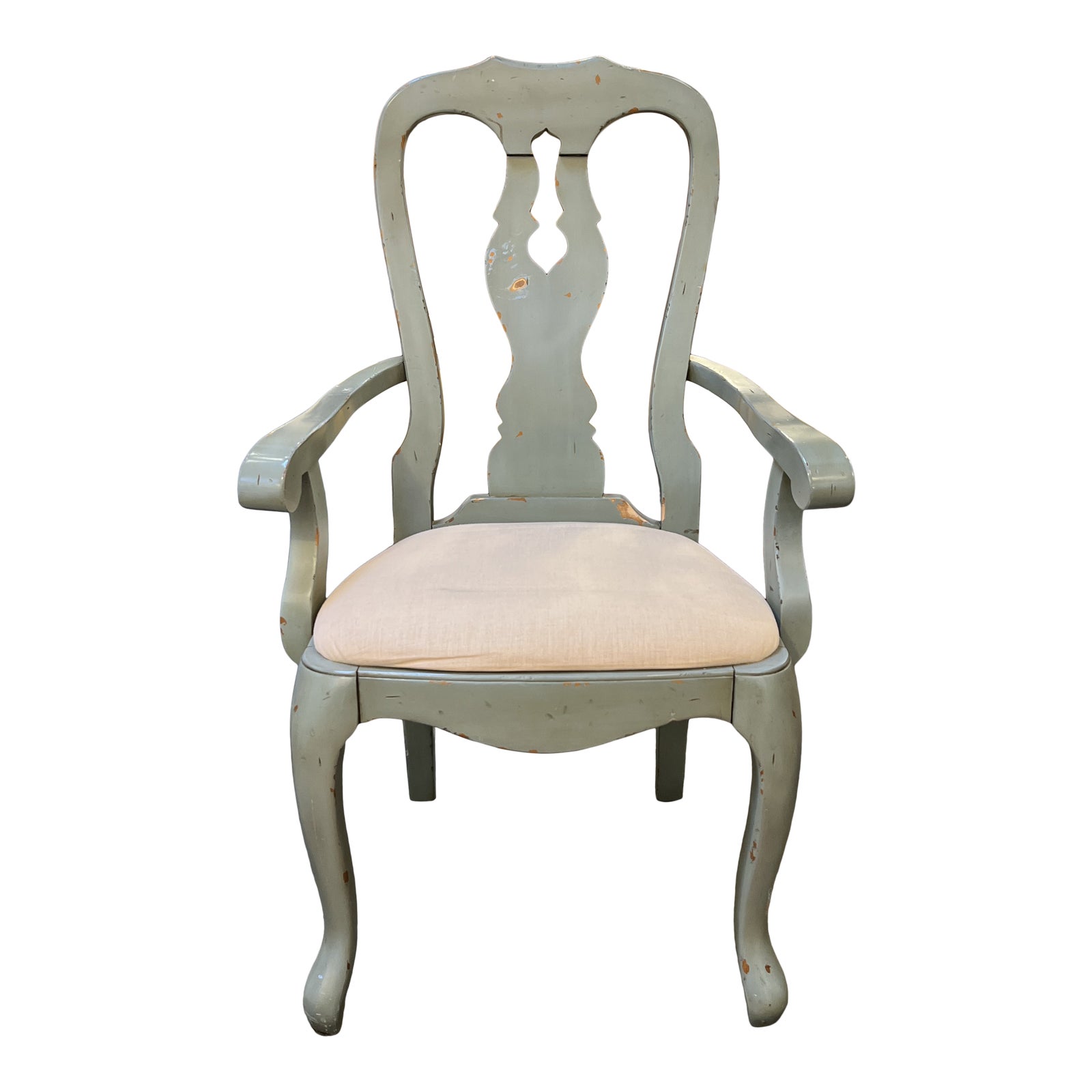 Design Plus Gallery presents the Pottery Barn Queen Anne Chair. Features a chippy blue finish and flax linen cushion. The legs are in cabriole style. The finish is worn in some areas (see photos); chair is in good condition. Queen Anne style is an iconic branch of traditional design.
