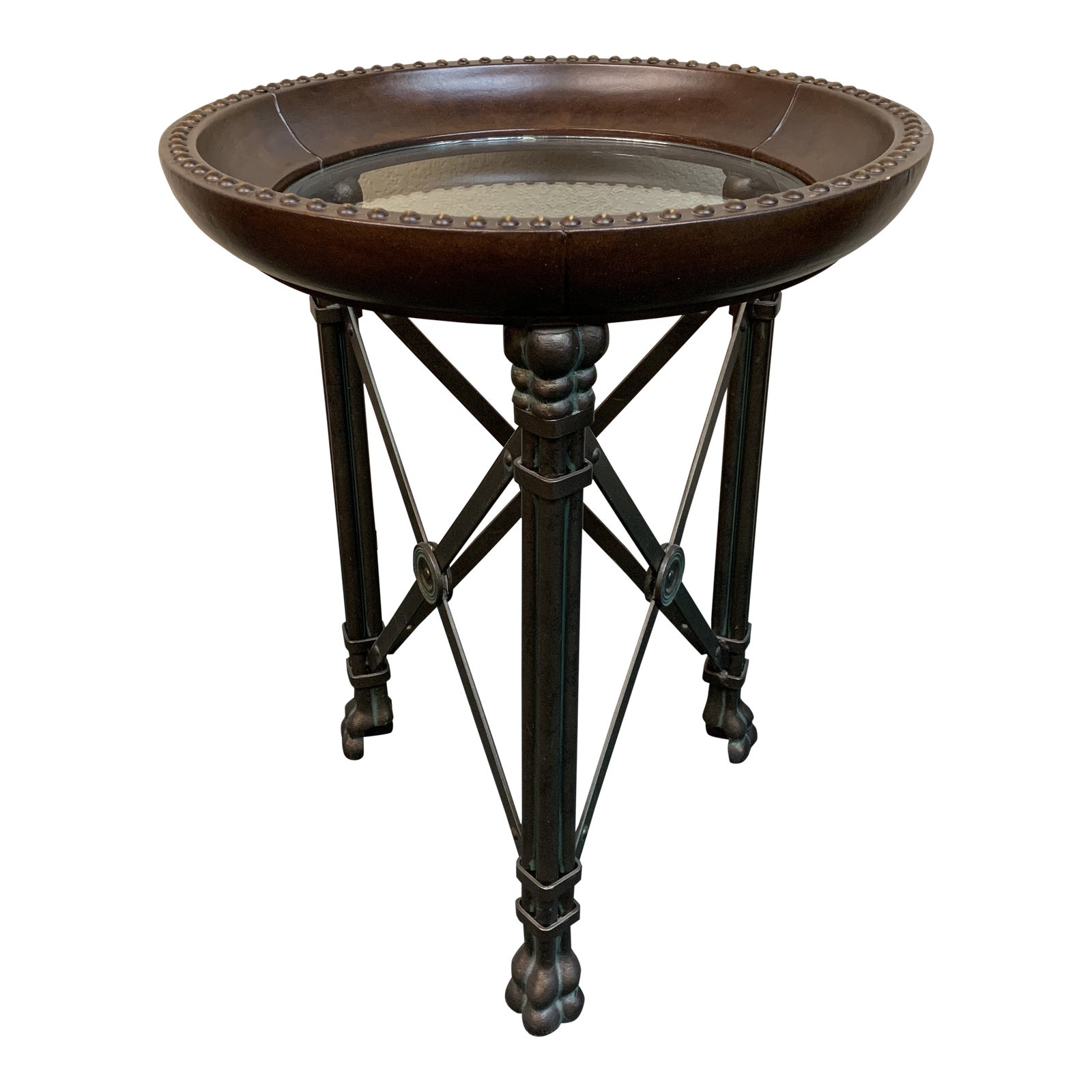 Design Plus Gallery presents a Rustic Industrial Accent Table. With stretchers of bronze finished iron, this petite table packs in a huge amount of style. Faux rivets circle the leather round that frames the the beveled glass surface, large enough for a side table and small enough for cocktails.