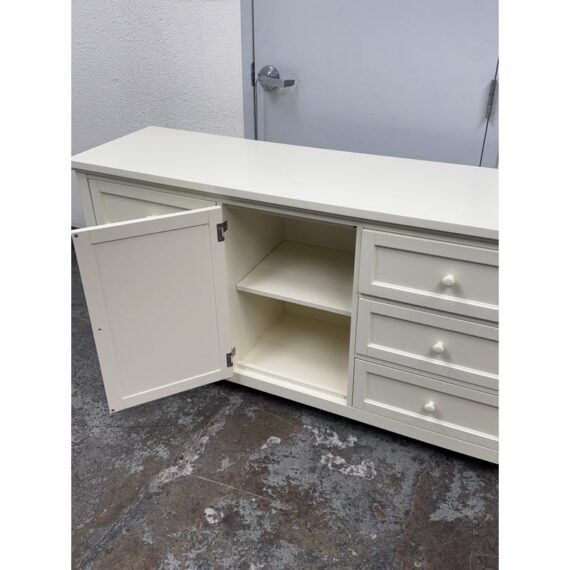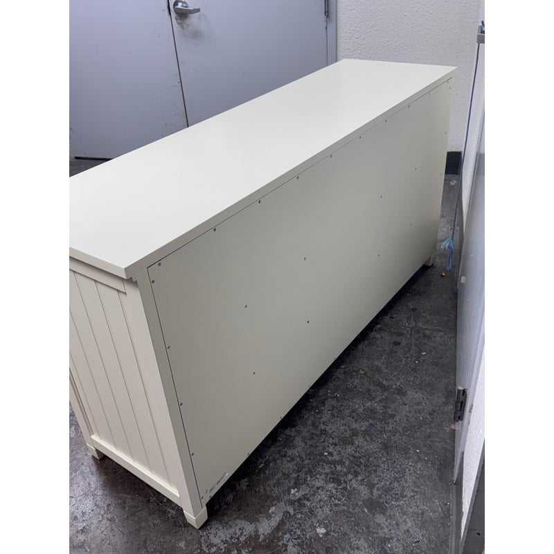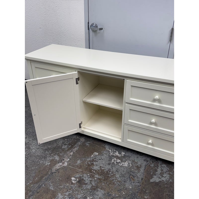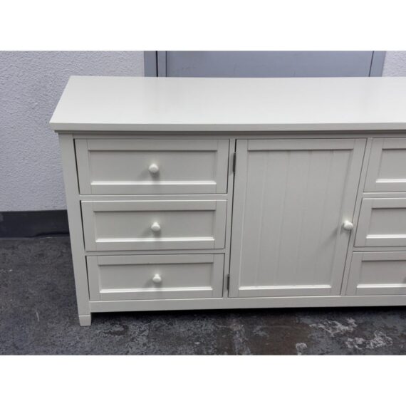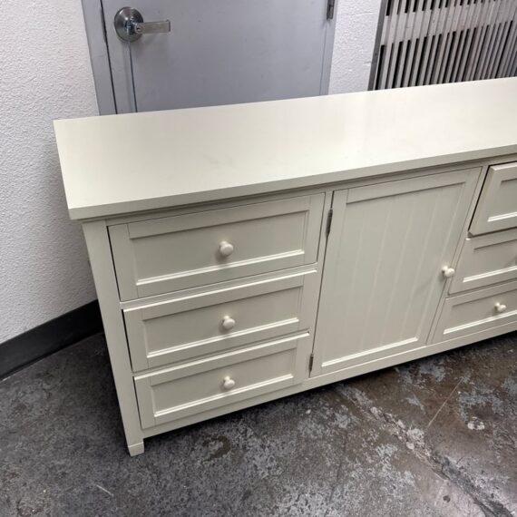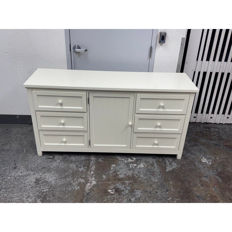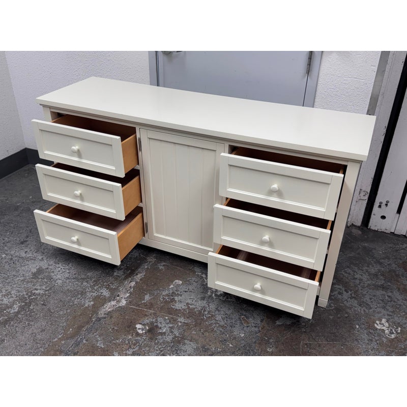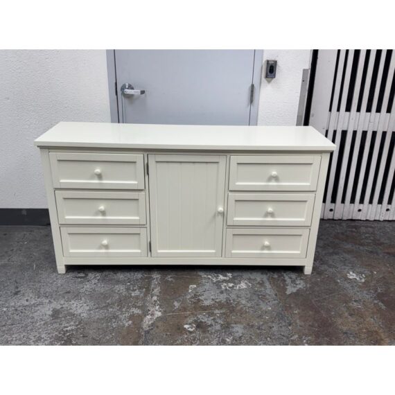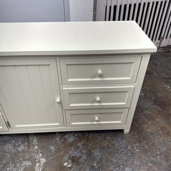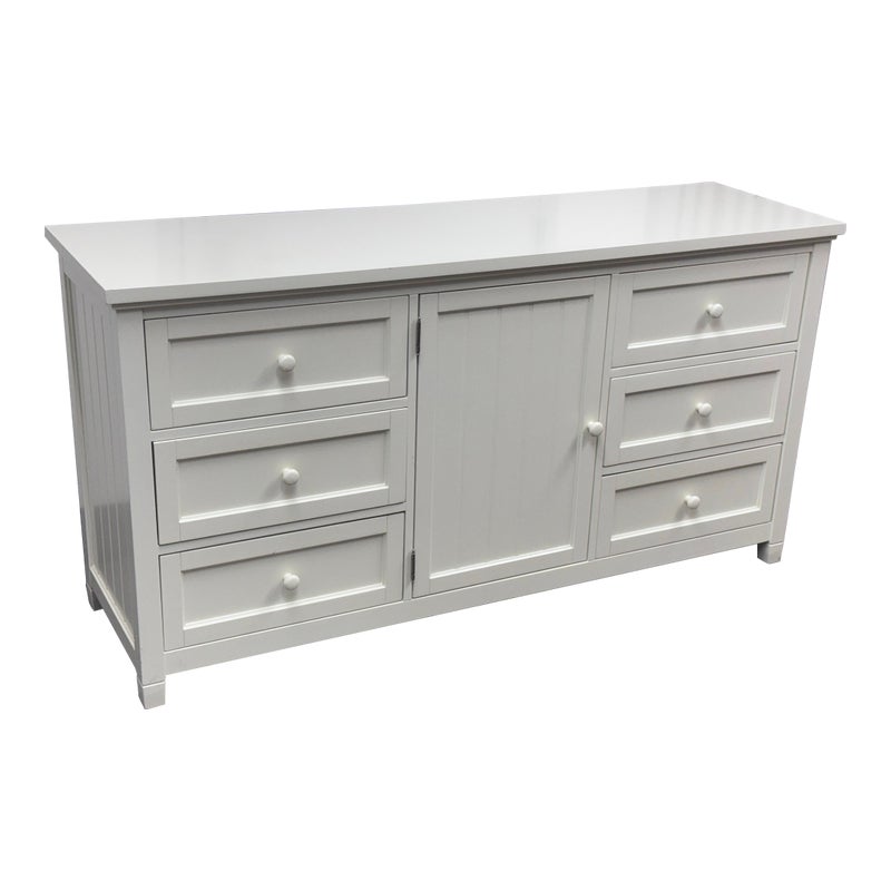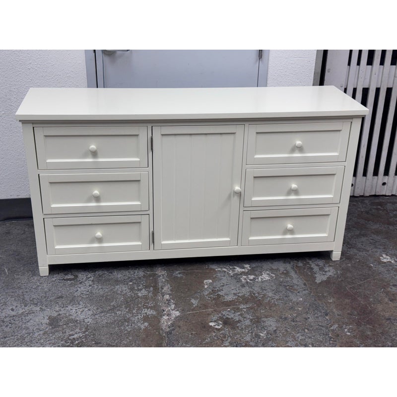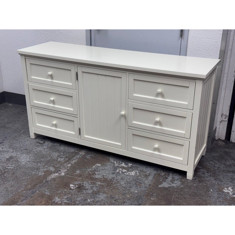 Design Plus Gallery presents the Beadboard Dresser in White from Pottery Barn Teen. This beadboard dresser features a timeless beadboard paneling and roomy storage. It is expertly crafted with kiln-dried solid wood frame, built to last a lifetime. There are three drawers of equal size on either side with a middle cupboard door opening to a single shelf in its cavity that is also removable. It is in good condition with visible and minimal visible wear for its usage.