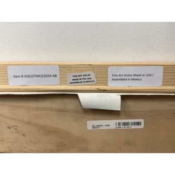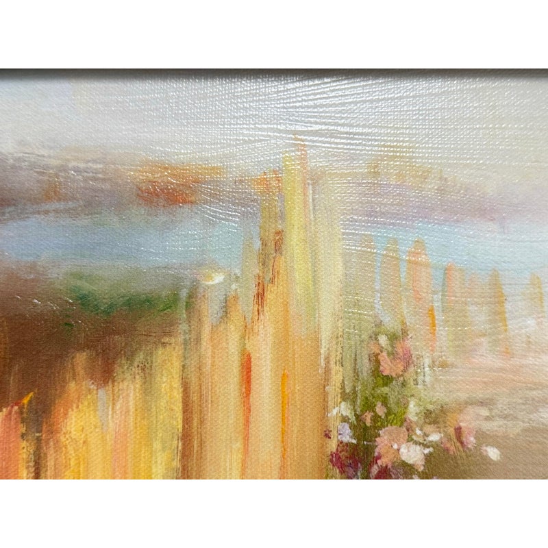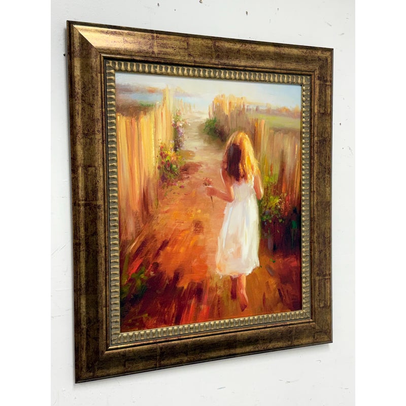Design Plus Gallery presents “Summer Stroll” from Prestige Arts. This piece shows a young girl walking away from the viewer. She is wearing a white flowing sun dress while holding the hand of another out of frame and flowers in her free hand. The giclée is made of canvas and is encased in a hand textured finished frame. It is in good condition and no longer in production. Made in the USA.