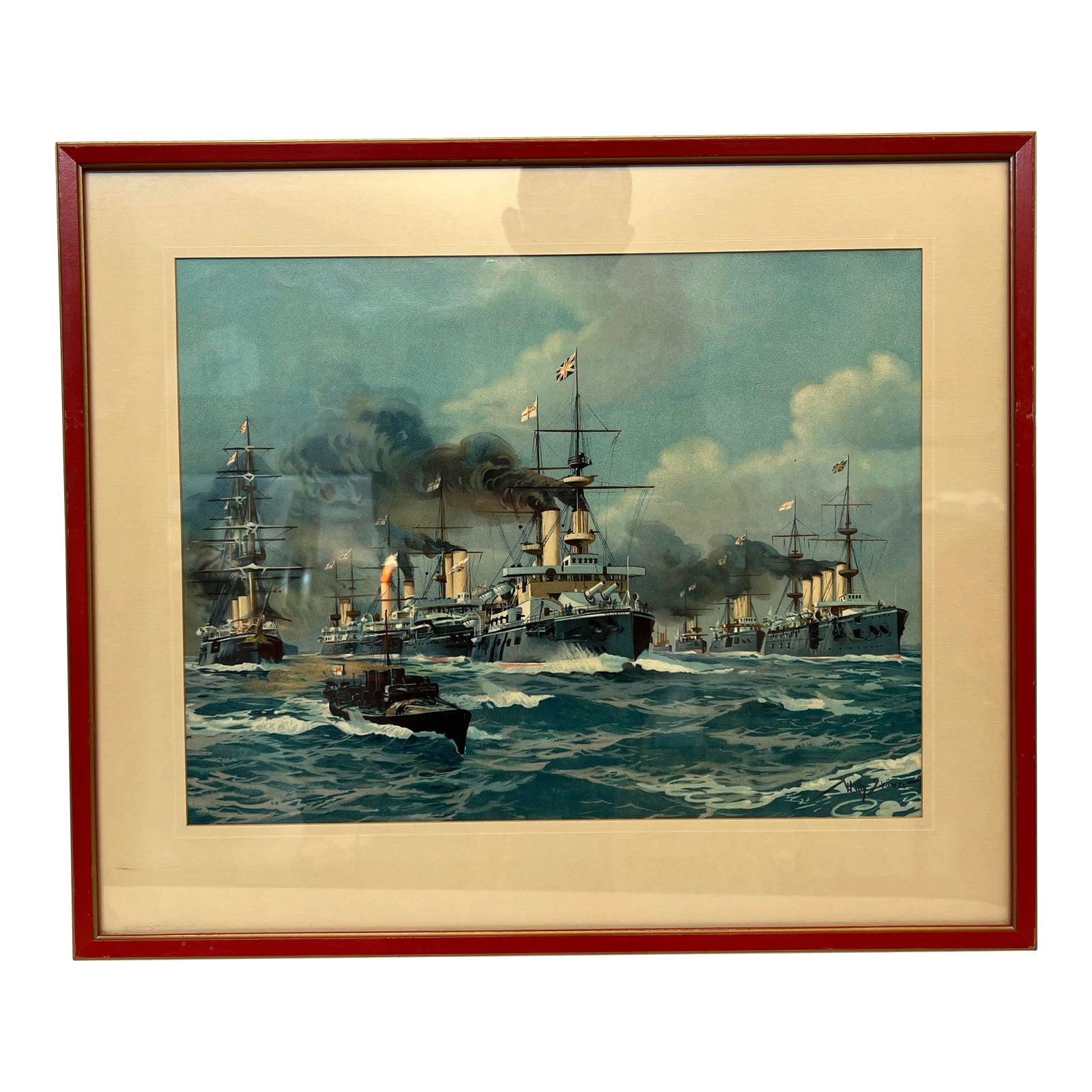 Design Plus Gallery presents the Print of British Naval Ships From World War I, by Willy Stower. The print depicts a fleet of navy ships during war times. The print is single-matted and then framed in wood with a red finish. Minor wear from use; print is in good condition.