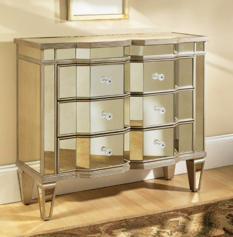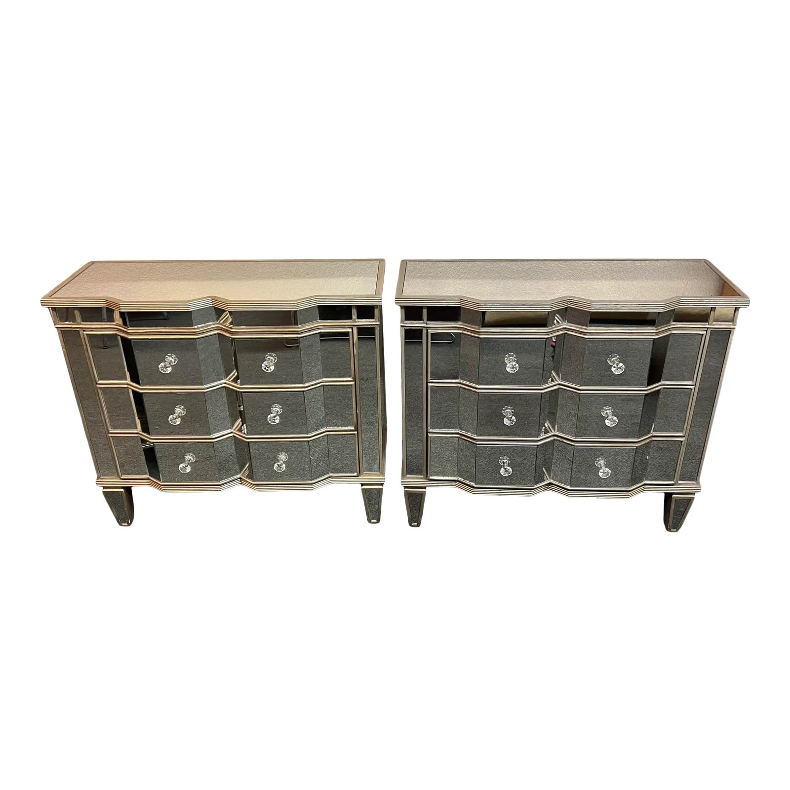 Design Plus Gallery presents a Pair of Marquis Mirrored Chests by Pulaski Furniture. Scaled to work in many settings, the Hollywood Regency style brings the glamour. Gilt trimmed eglomise mirror covers all surfaces but back. Lovely glass pulls detail the shallow drawers
