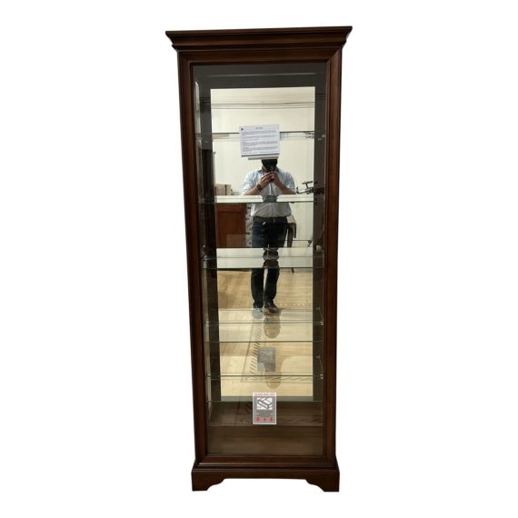 Design Plus Gallery presents a NEW Traditional Cherry Stain Glass Display Curio Cabinet by Pulaski Furniture. Narrow and clever design has access through the sides with oiled brass pulls to keep the flow of your space nicely open. Back panel is mirrored to reflect your collection’s beauty on the glass shelving. Glass cabinet is in good condition.