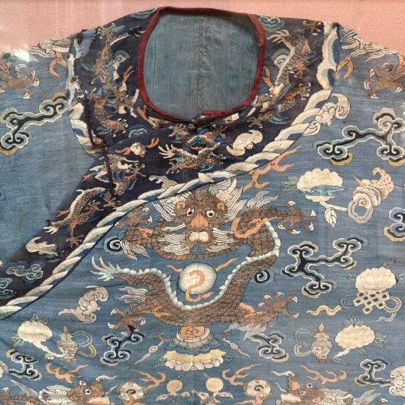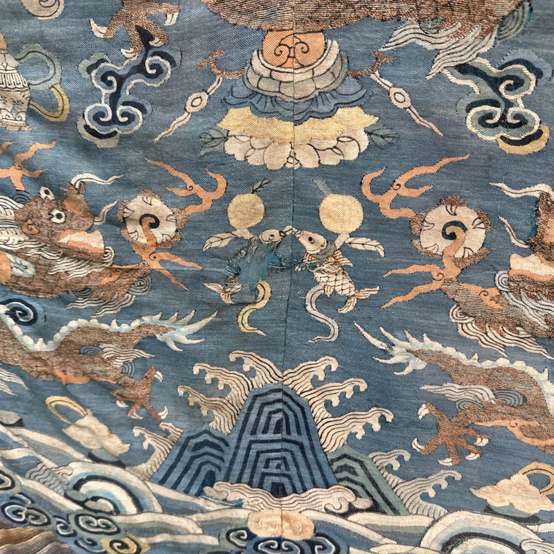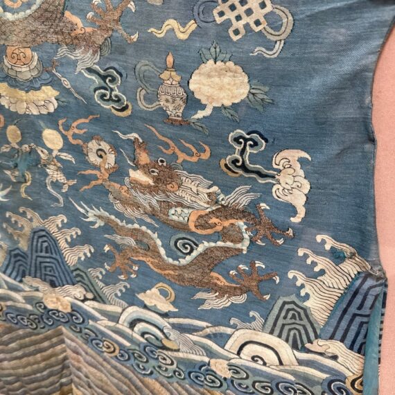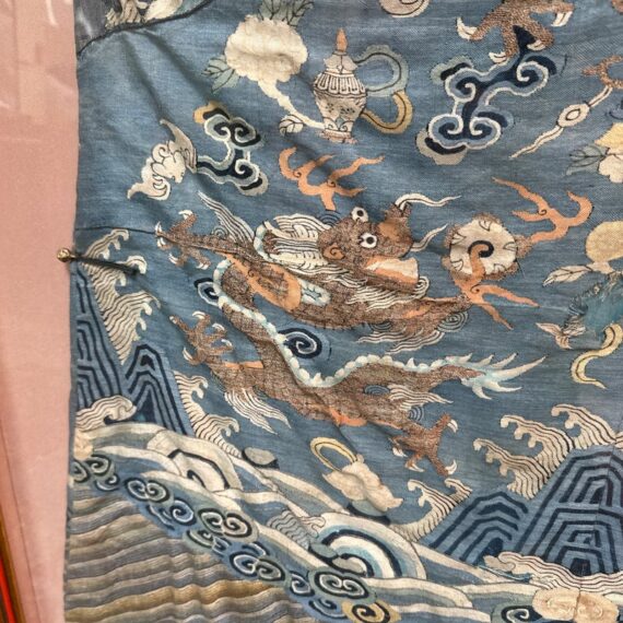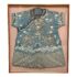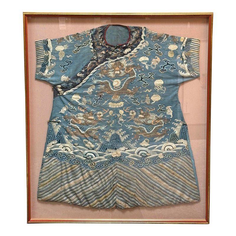 Design Plus Gallery presents a Framed Silk Kimono in the Qing Dynasty Style. The blue Chinese robe is embroidered in silk with a dragon, or Jifu robes of this type were worn by members of the imperial court on semi-formal occasions. It has intricate embroidery of dragons, flaming pearls, and other auspicious symbols amidst clouds, typical of this era. The kimono is flat layer and encased in a beveled edge frame with a rose pink background. Overall the art piece is in good condition for its usage.