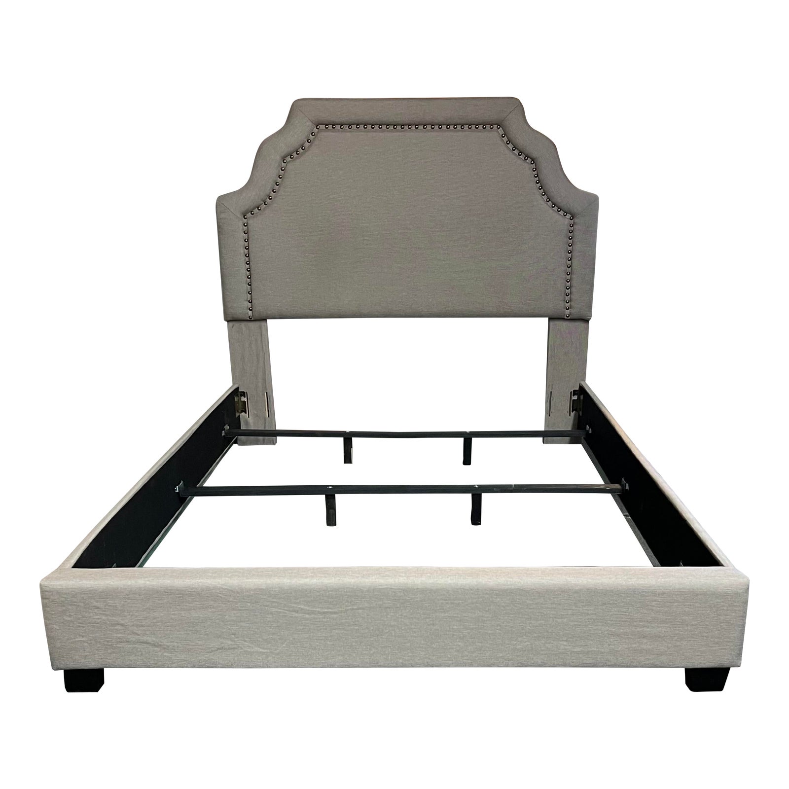 Design Plus Gallery presents a Queen Size Bed Frame by Alton Furniture. Upholstered in a light gray color fabric. The headboard is outlined in a bronze nail head trim. Visible wear on the left side of the headboard from hair soil. Minor wear from usage.