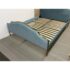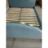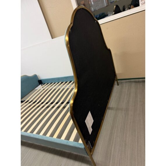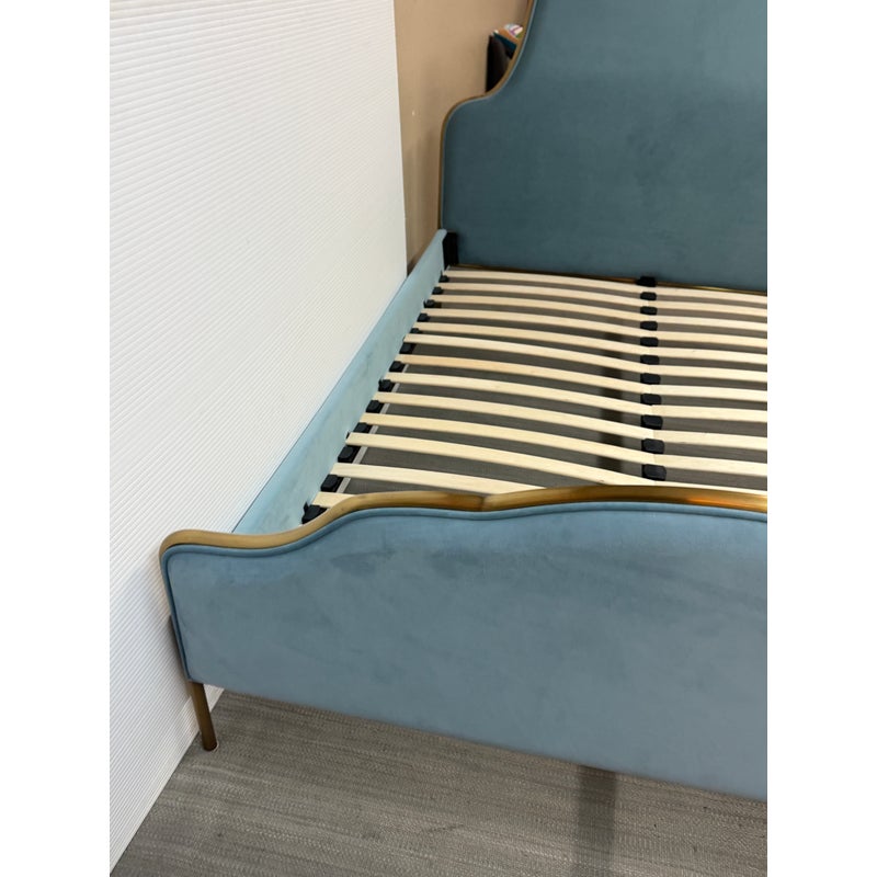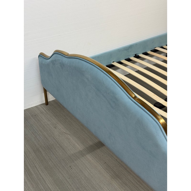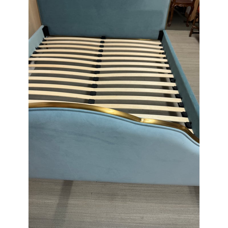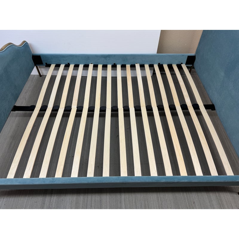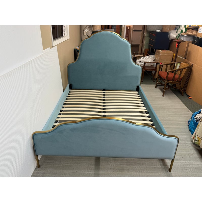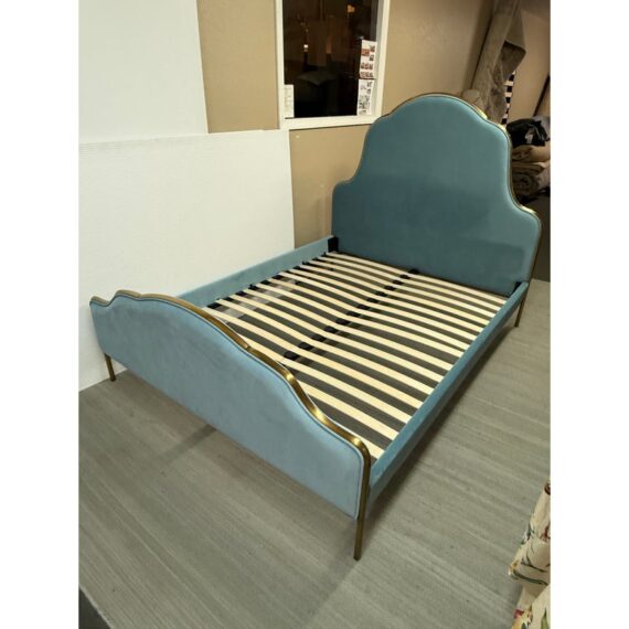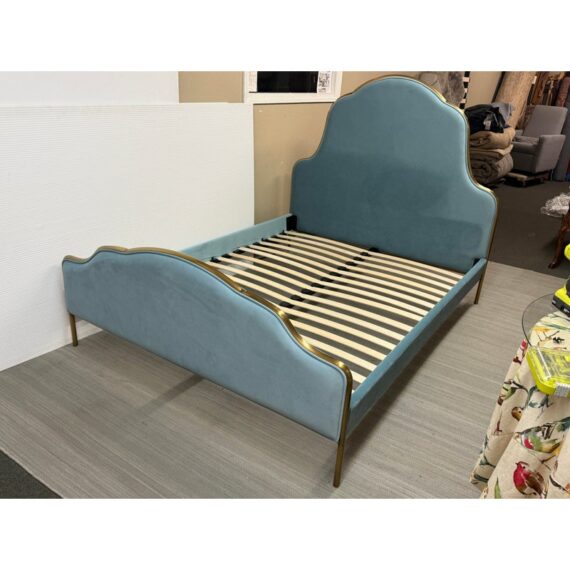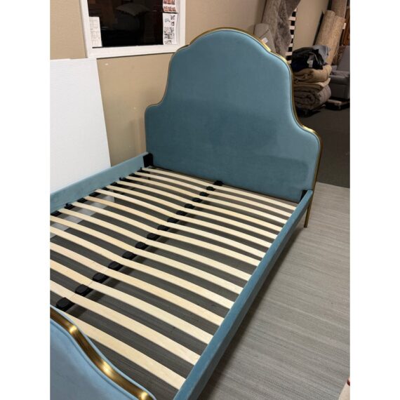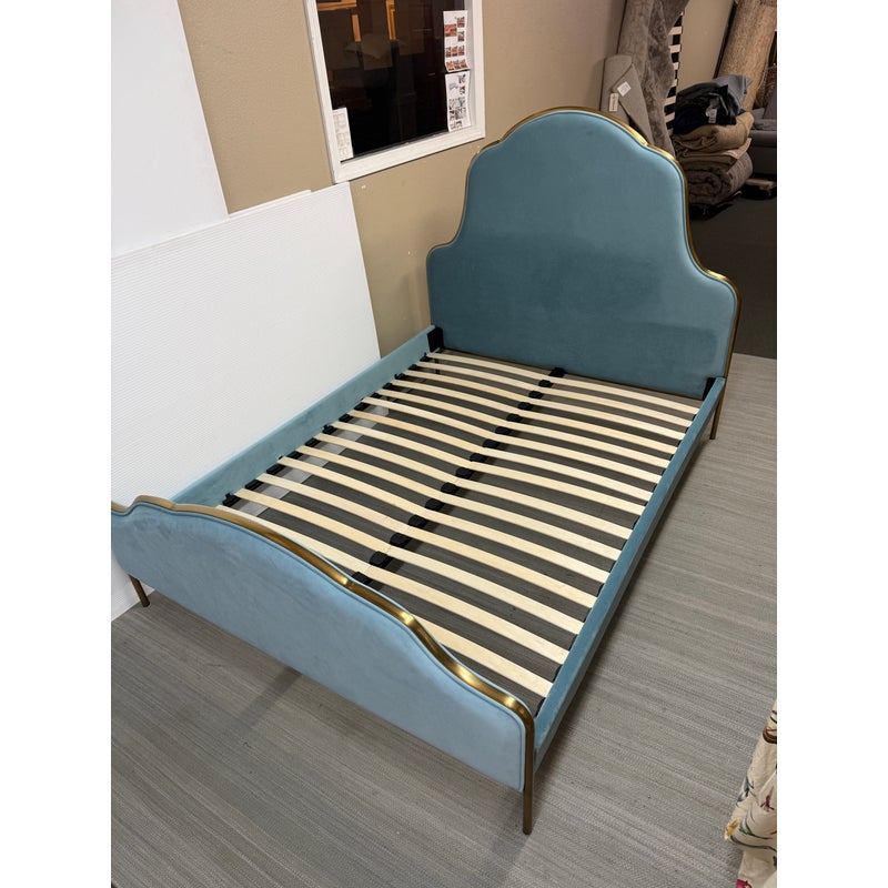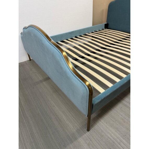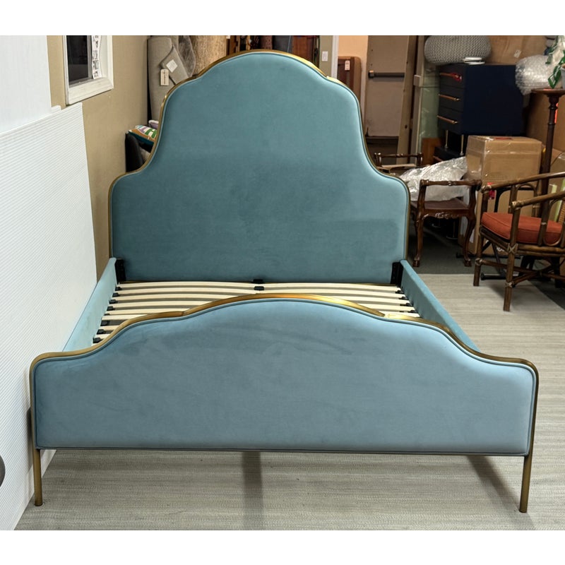 Design Plus Gallery presents the Queen Size Fenna Bed Frame from Anthropologie. This traditionally elegant silhouette is updated with rich polyester velvet in a soft turquoise and accented by gleaming brass trim and legs. The style calls to mind the childhood magic of fairytales and princesses. The frame is supported by inner slats allowing this piece the ability to secure a mattress with a box spring. Overall it is in good condition, visible and minimal wear from usage.