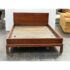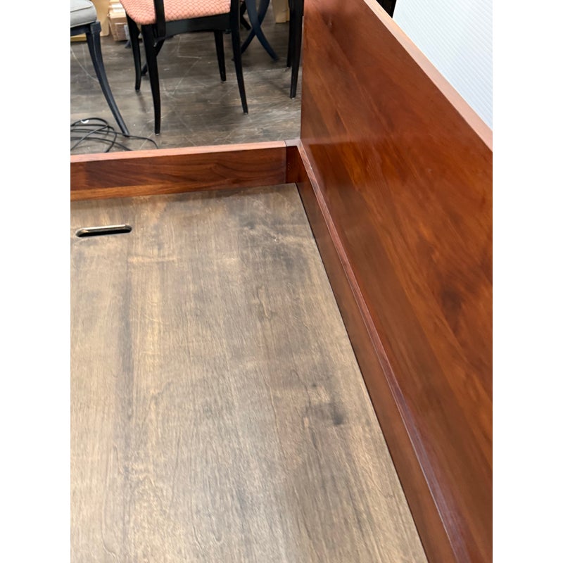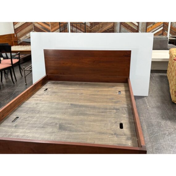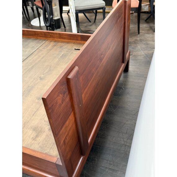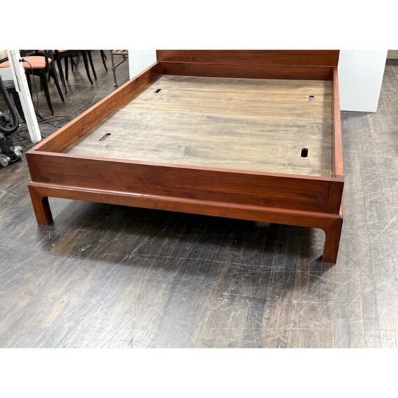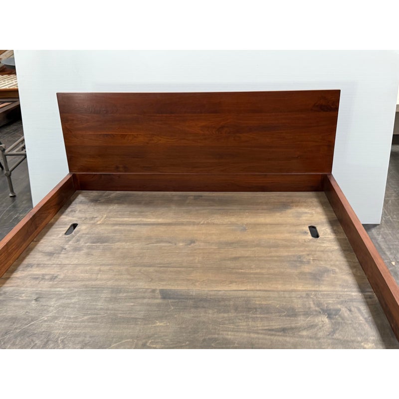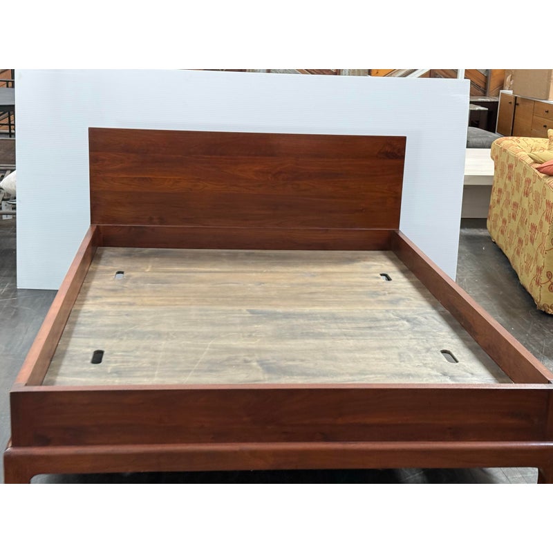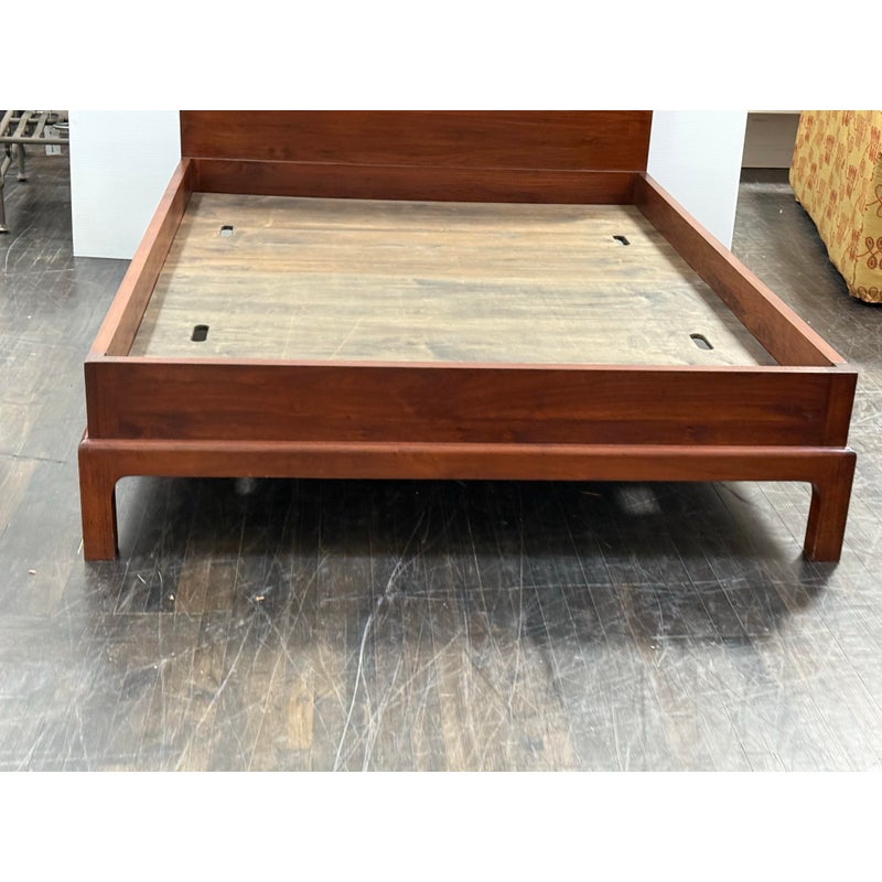 Design Plus Gallery presents a Queen Size Ming Bed Frame. This platform bed is made of solid walnut with a deep walnut stain and a Ming-inspired frame. The design includes a paneled headboard, low platform base, squared legs, and rounded front rail. The support deck includes cutout openings, so a box spring is not required. The walnut grain and architectural form give the piece a timeless Asian-inspired presence. It is in good condition with visible and minimal wear from usage. Made in the USA.