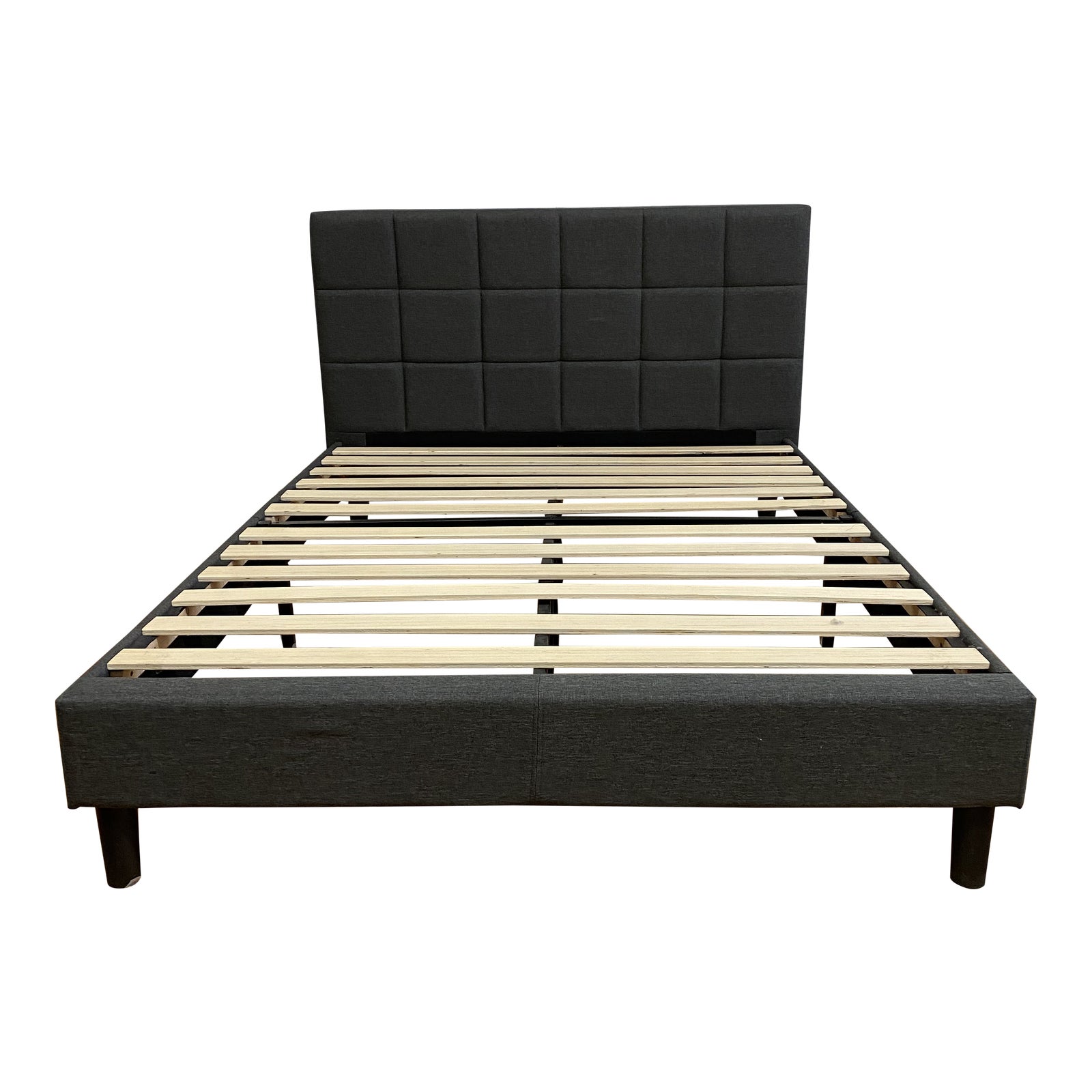 Design Plus Gallery presents a Queen Contemporary Blind Tufted Upholstered Bed Frame. Each plane of this contemporary bed frame is fully upholstered + padded with a dark Charcoal gray contract grade fabric. Black legs give a slight lift to the frame and comes with slates for a platform mattress bed application. Little evidence of wear. Headboard utilizes an blind tufted detail for a soothing and modern style.