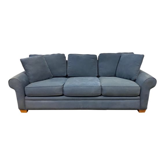Design Plus Gallery presents a Blue Micro Fiber 3 Seater Sofa. Blue fabric has visible wear with stains and comes with 3 seat and 3 back cushions in addition to 2 smaller side pillows. Cable welt surrounds the silhouette and cushions. Rolled arms and chestnut stained wood legs give the sofa a warm and inviting feel.