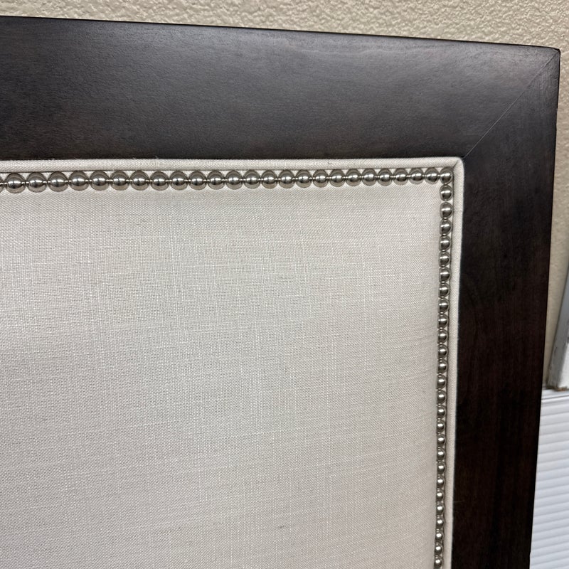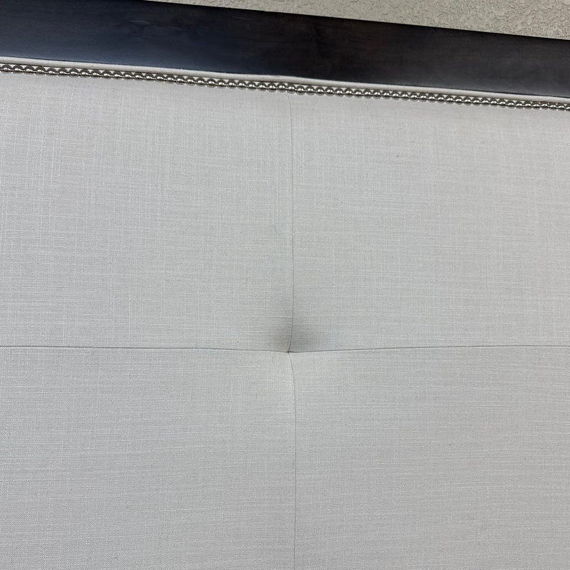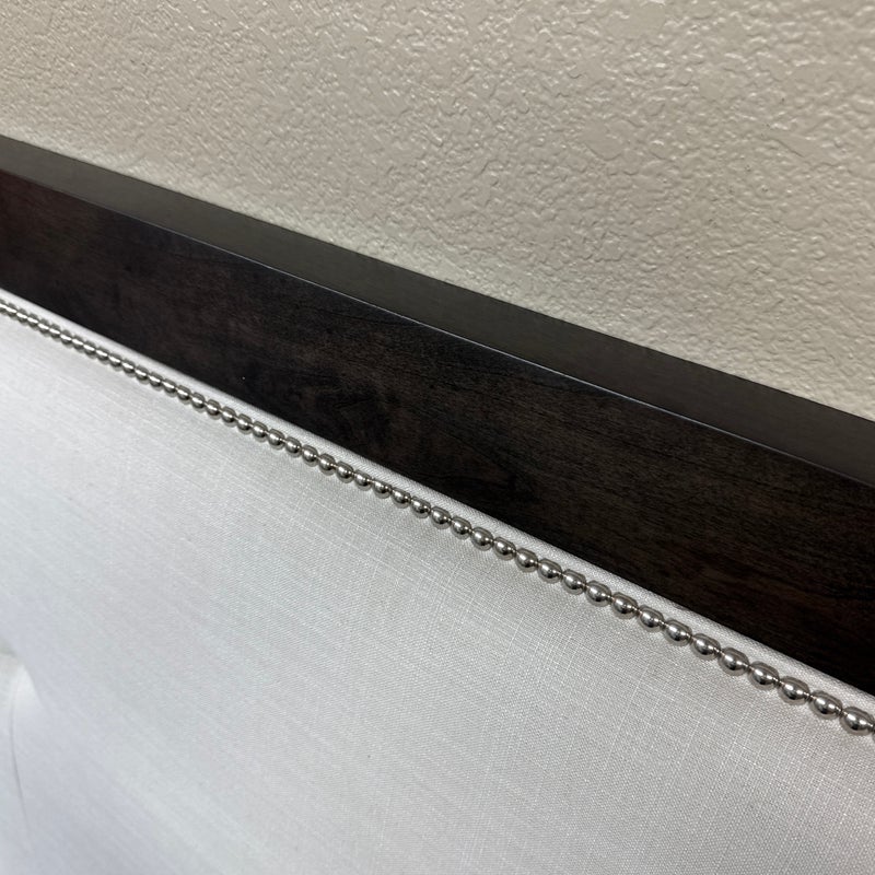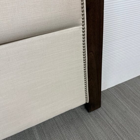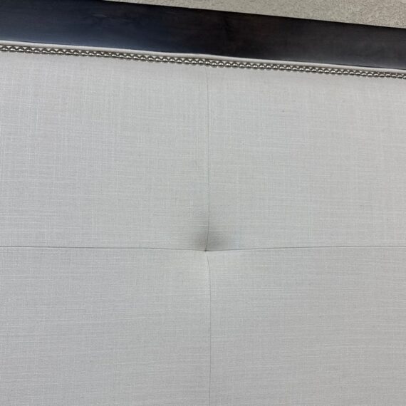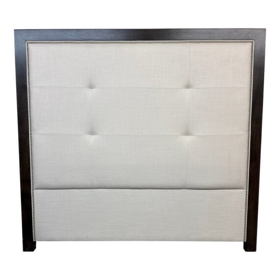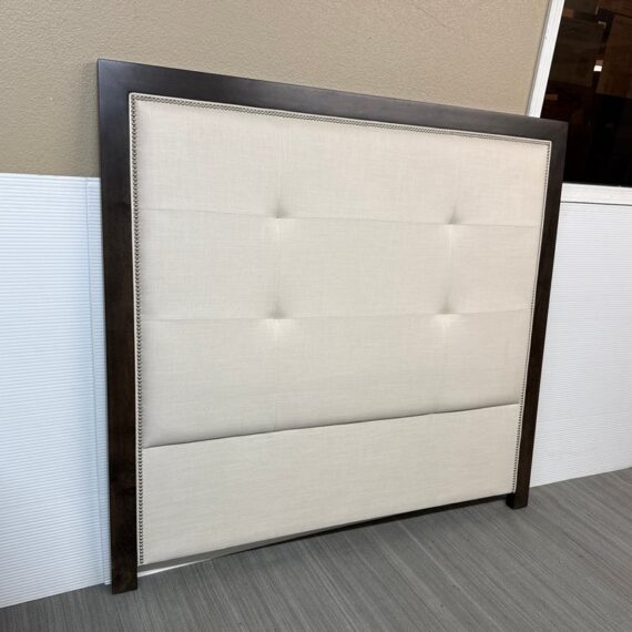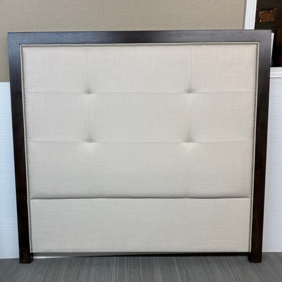 Design Plus Gallery presents a Queen Size Linen Headboard Custom Made by California Sofa. The headboard offers an updated tufted style and is upholstered in woven performance (stain resistant) fabric that is framed within contrasting Dark Brown wood. There are cleats on the backside of the headboard to allow for a sturdier nights rest. The headboard is in good showroom like condition with minimal visible wear. Made in USA.
