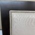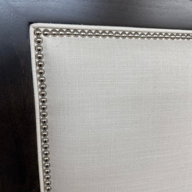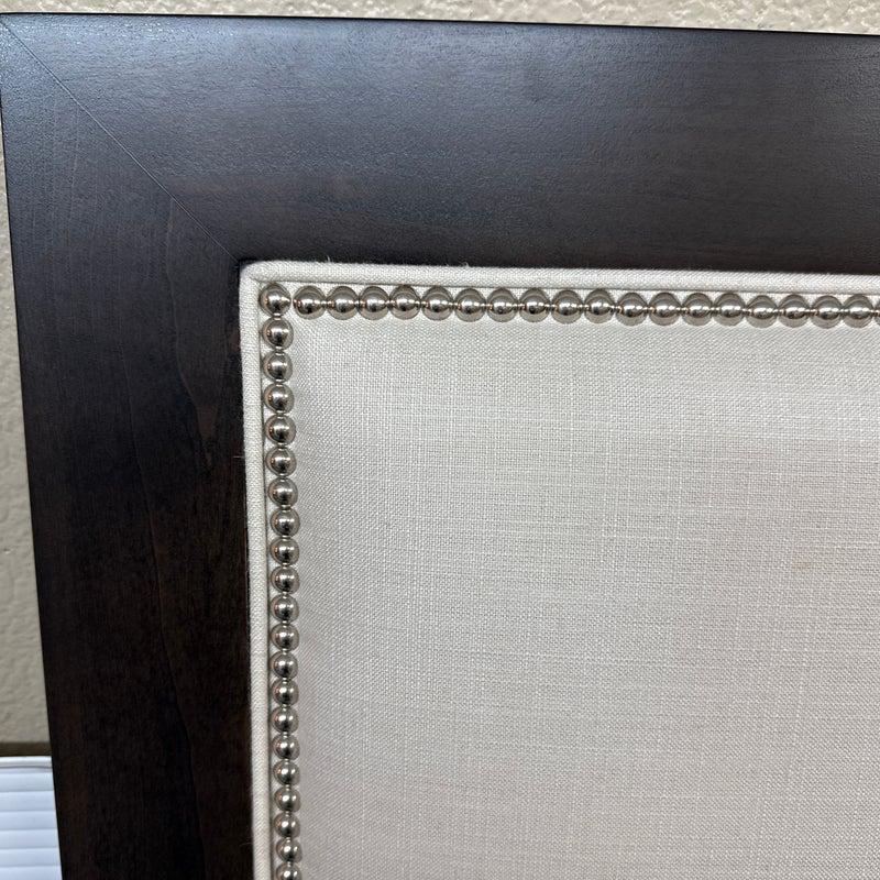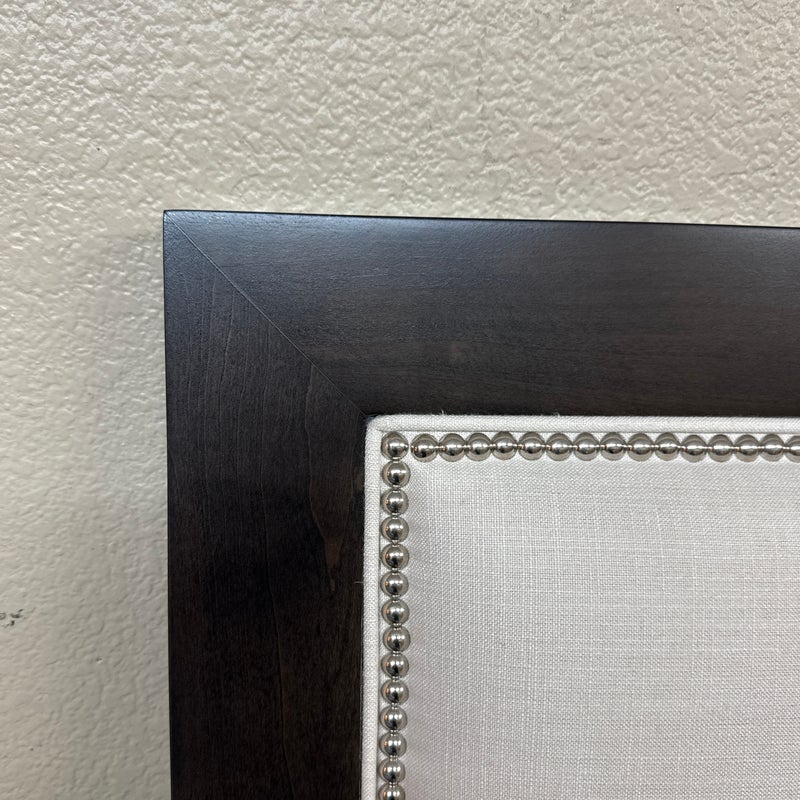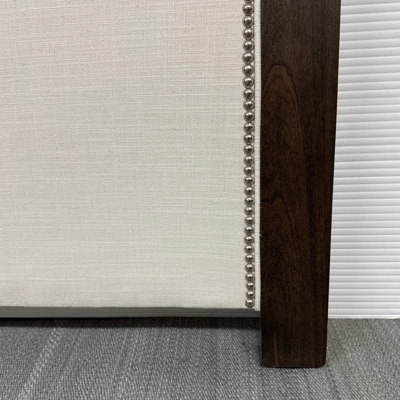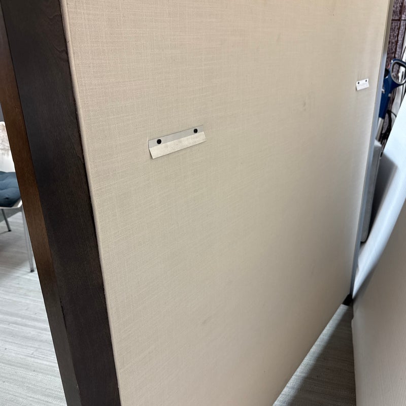 Design Plus Gallery presents a Queen Size Linen Headboard Custom Made by California Sofa. The headboard offers an updated tufted style and is upholstered in woven performance (stain resistant) fabric that is framed within contrasting Dark Brown wood. There are cleats on the backside of the headboard to allow for a sturdier nights rest. The headboard is in good showroom like condition with minimal visible wear. Made in USA.