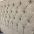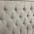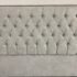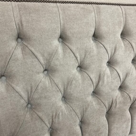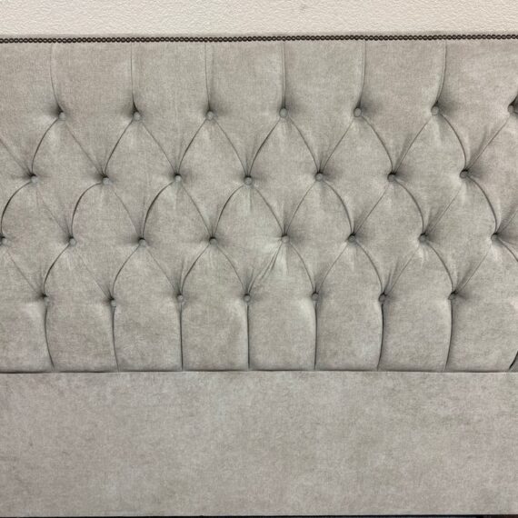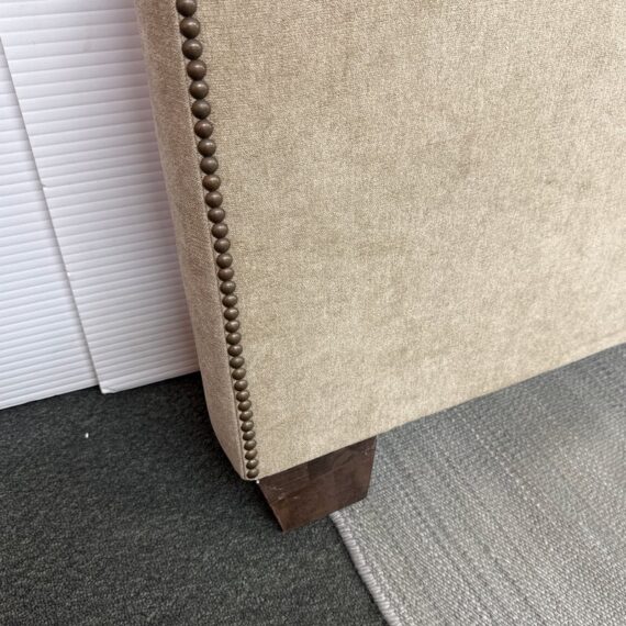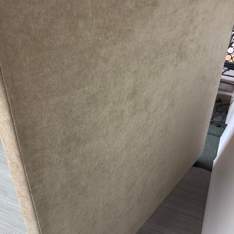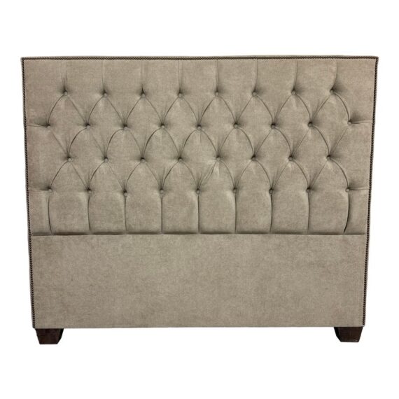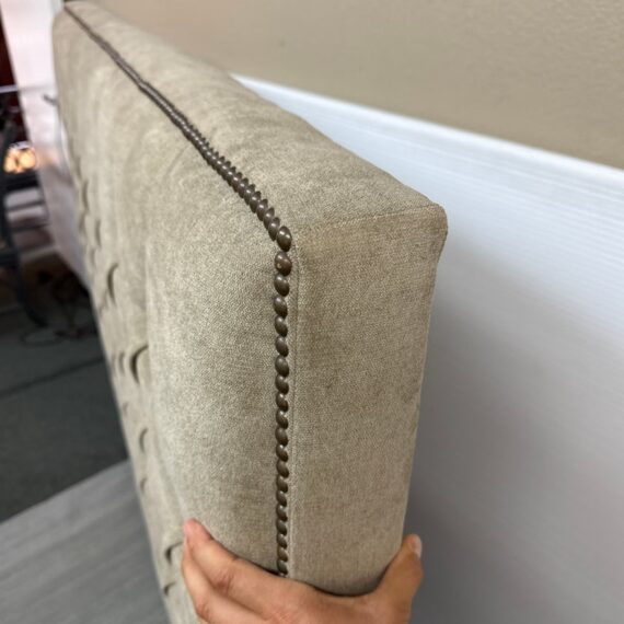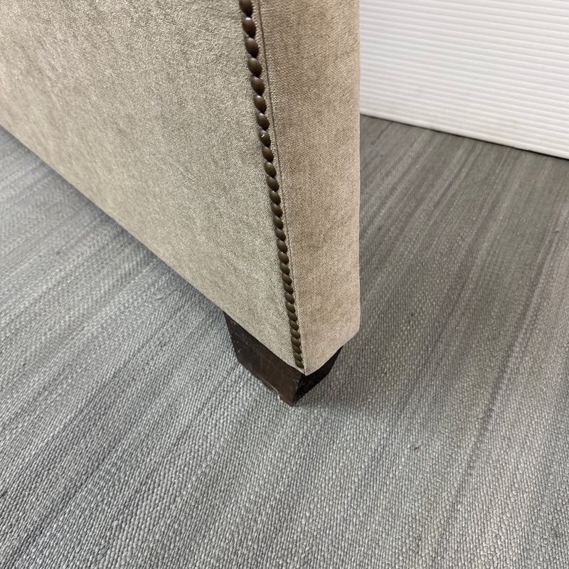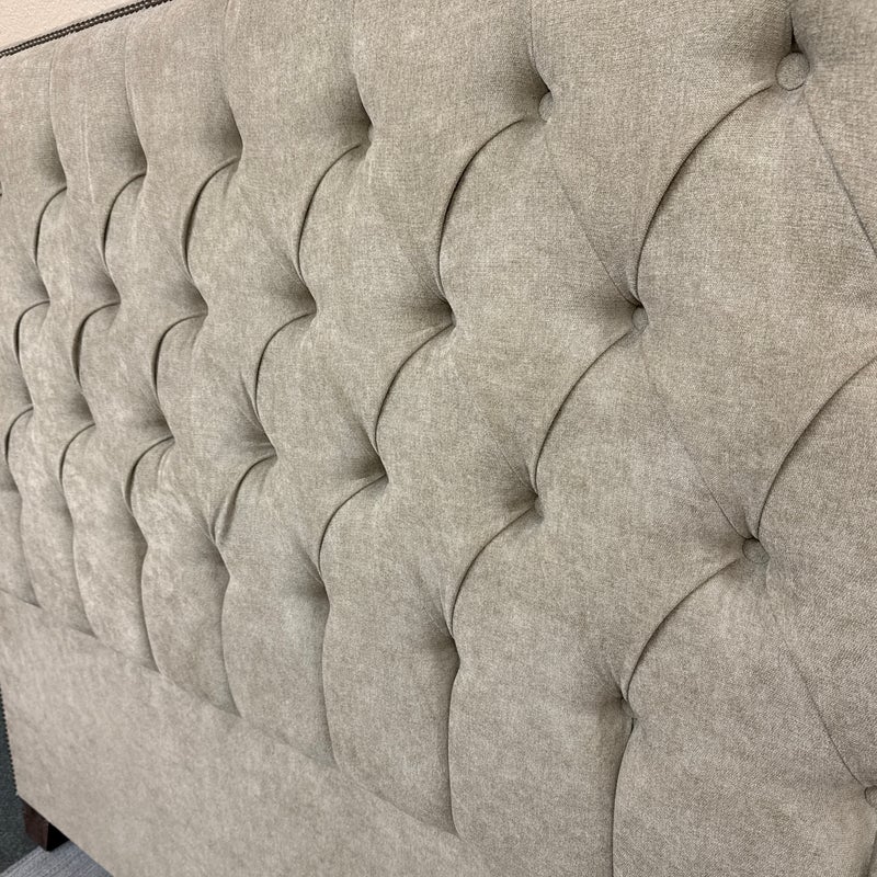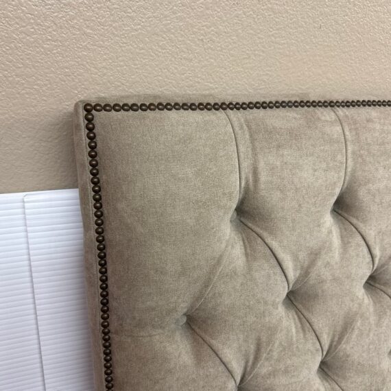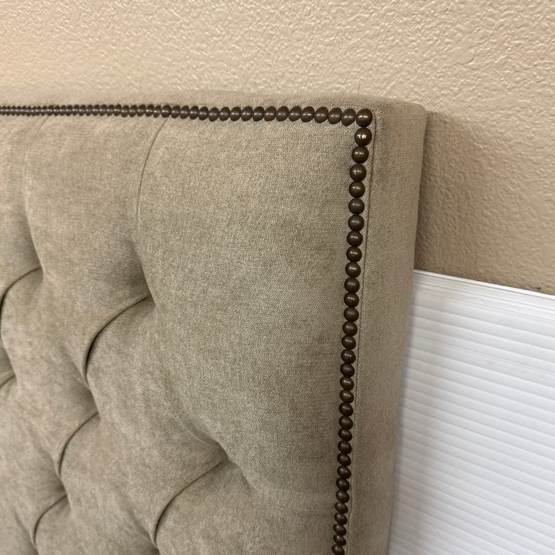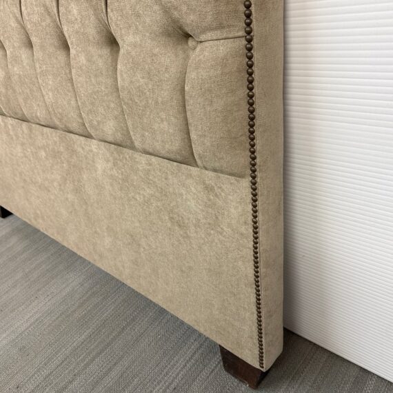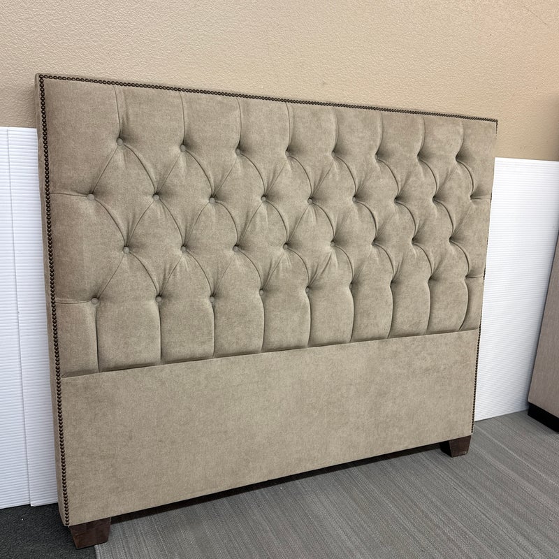Design Plus Gallery presents a Queen Size Verona Headboard Custom Made by California Sofa. The khaki toned, diamond tufted, and faux suede upholstery to the headboard also offers a detailed border of antique brass nailheads. Subtle drama for bedroom or guest room. Is in good showroom like condition with minimal visible surface wear for its usage.