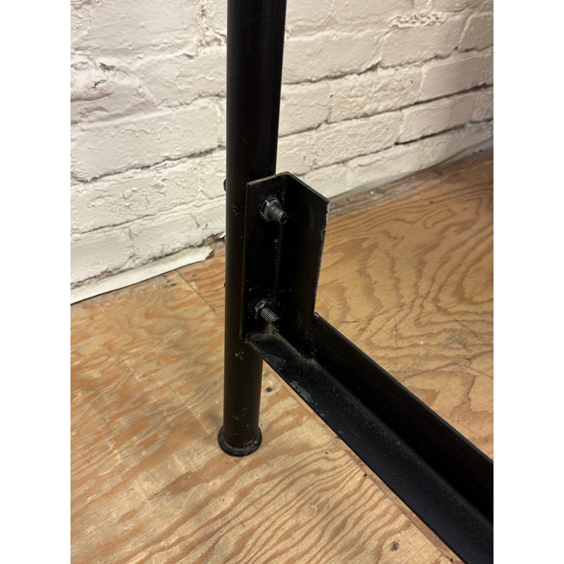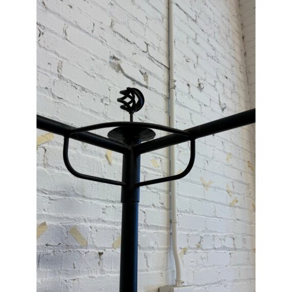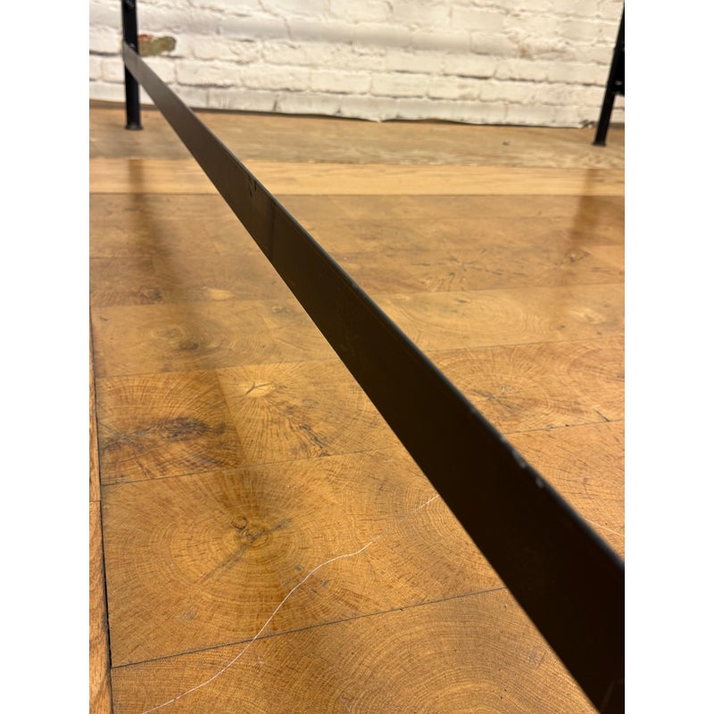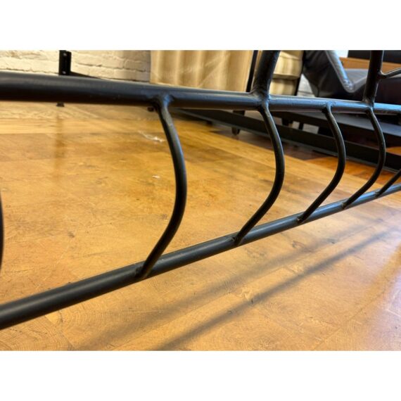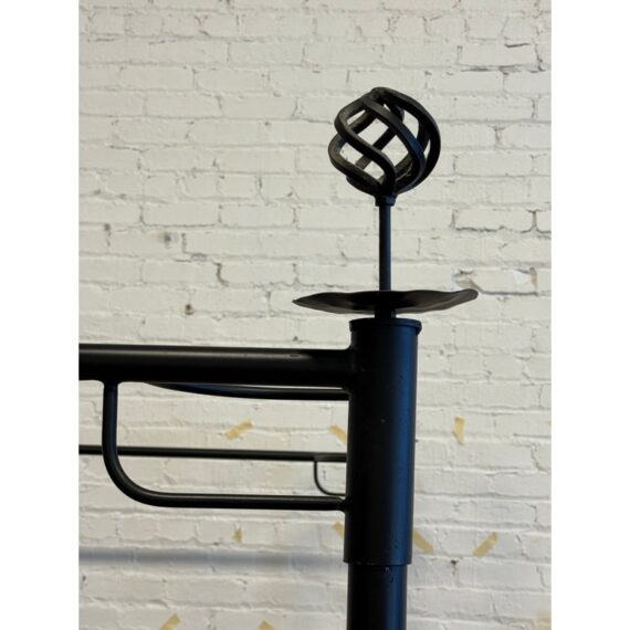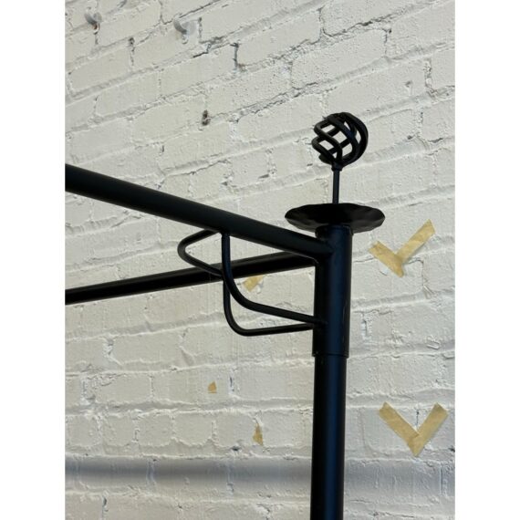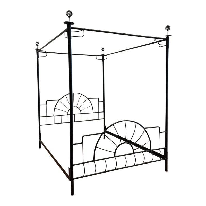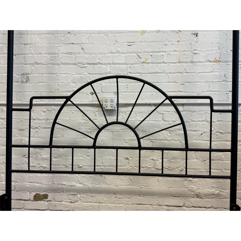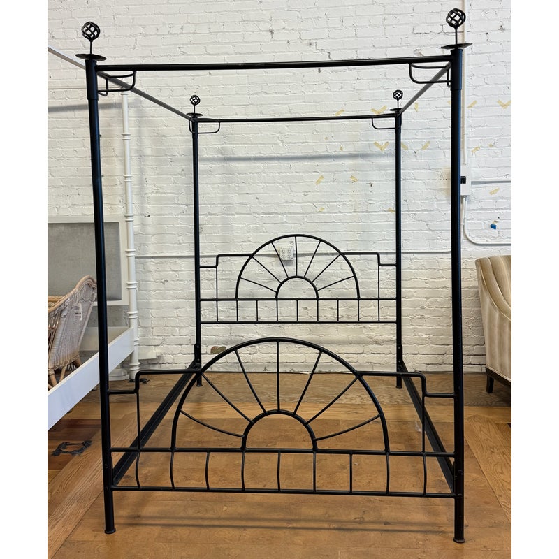 Design Plus Gallery presents a Queen Size Sunburst Canopy Bed Frame from Coaster. This stunning iron canopy bed will make a bold centerpiece in your home. The headboard and footboard have a lovely sunburst motif, while simple wrought iron posts soar high above each corner. Distinctive spherical finials sit at the top for the perfect finishing touch. The dark wrought iron finish is rustic, keeping the piece in balance. It is in good condition for its usage.