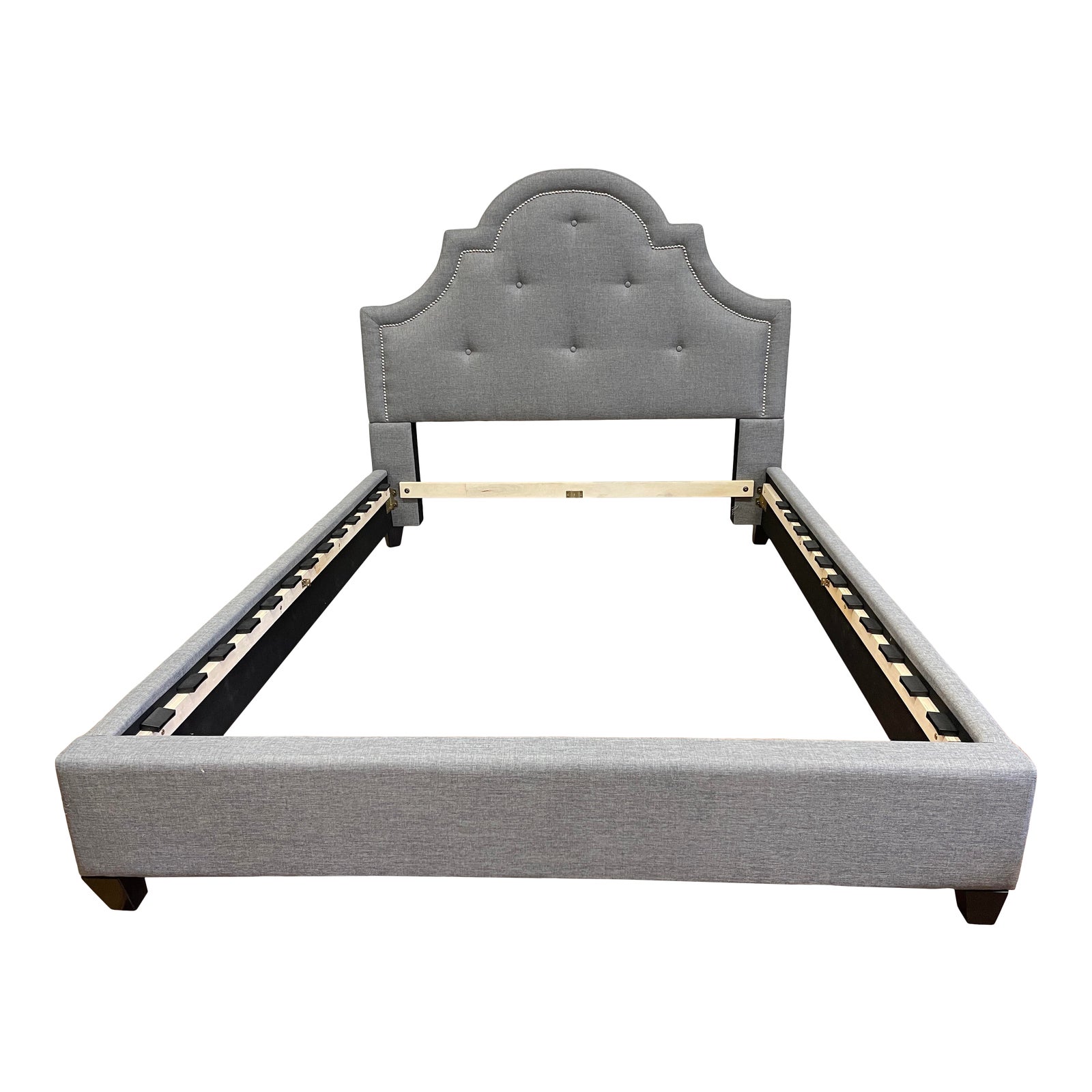 Design Plus Gallery presents a Queen Size Contemporary Upholstered Sky Blue Button Tufted Bed Frame. Sky blue synthetic blend is upholstered around the side rails with a scalloped crown. Interior of headboard is button tufted and detailed with an oiled chrome nail head. Visible wear through out, good condition. Missing a few slats.