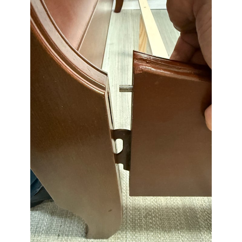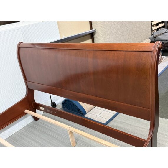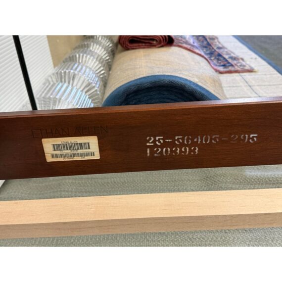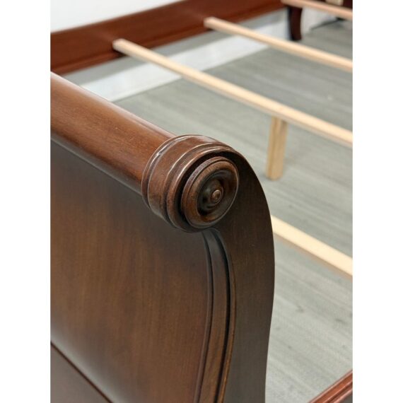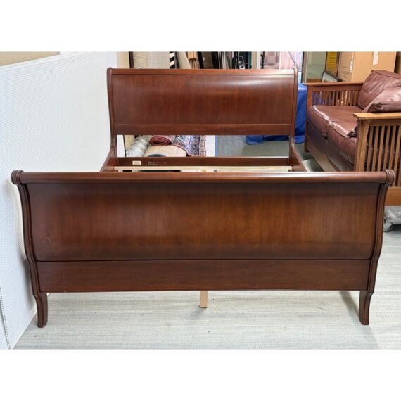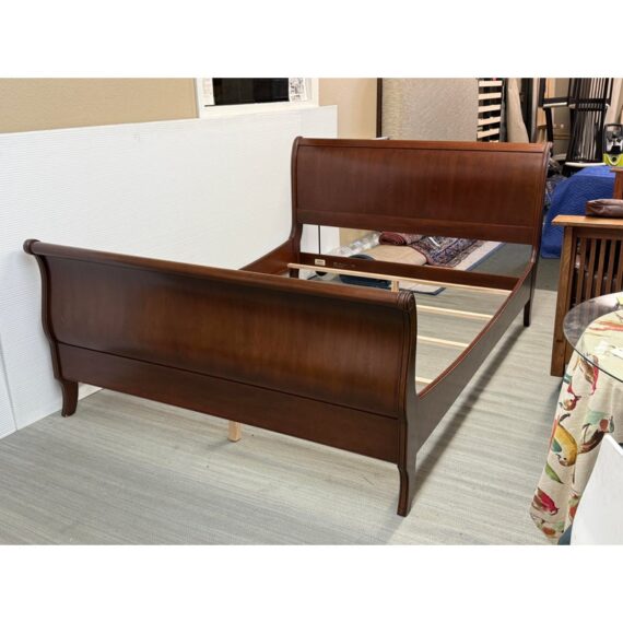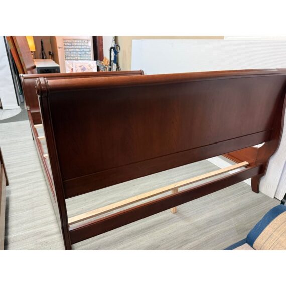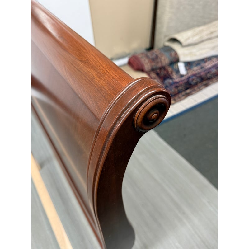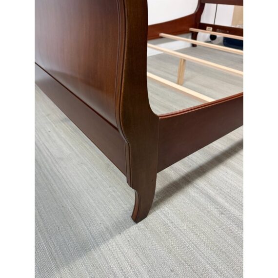 Design Plus Gallery presents the Queen Size Georgian Court Cherry Sleigh Bed Frame from Ethan Allen. This bed pairs classic inspiration with a modern sensibility. Its sleigh silhouette showcases clean lines and gentle, graceful curves, creating a poised profile that suits both traditional and transitional spaces. A cherry finish warms the room and highlights the natural beauty of the wood, while the streamlined design keeps your room looking refined and uncluttered. Built for lasting comfort and style, it’s a centerpiece that brings understated elegance to any bedroom. In good condition, visible and minimal wear. Made in USA.