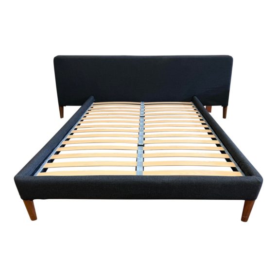 Design Plus Gallery presents a Queen Size Parallel Wide Bed Frame by Design Within Reach. Designed by Jeffrey Bennett. Simple and complex, the Parallel features solid wood legs, foam padded alder frame, and removable felt-like dark gray slipcovers in a highly functional silhouette. Platform slats for support. Nightstands install on either side of the Queen size bed for storage, etc. Original hardware for nightstands are missing. Light evidence of wear; good condition overall.