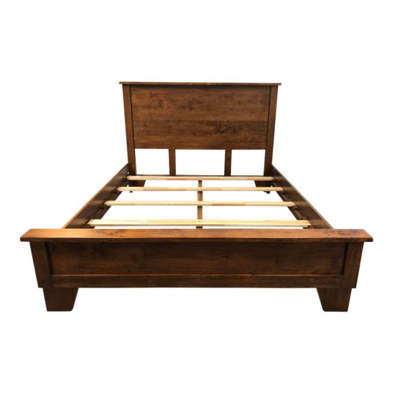 Design Plus Gallery presents a Queen Size Bed Framed. Constructed of solid Mahogany woods. Clean and simple lines. Minor wear on wood. Come with five slats.