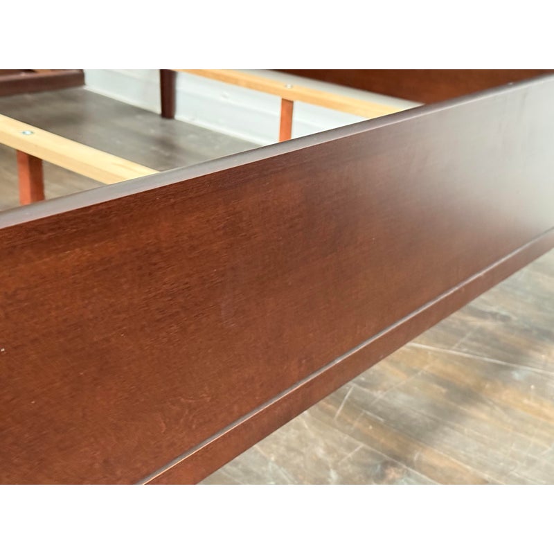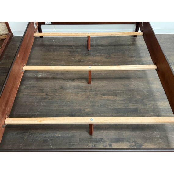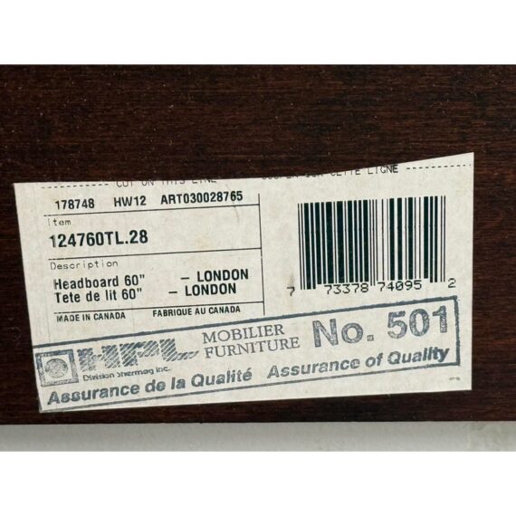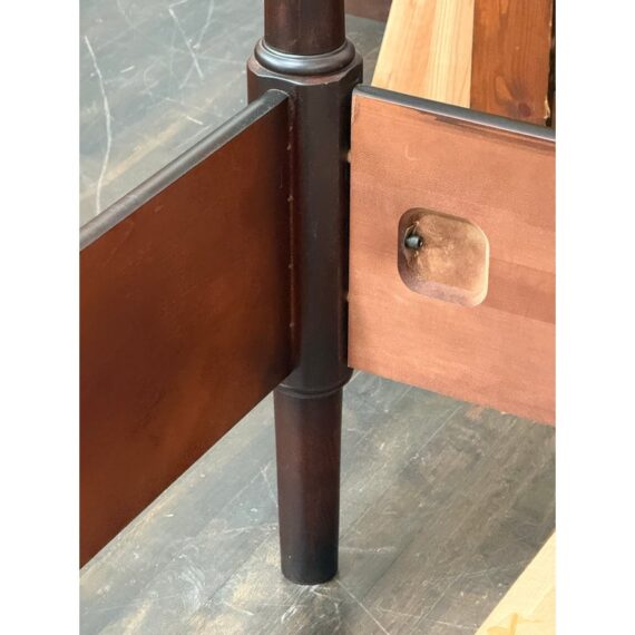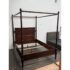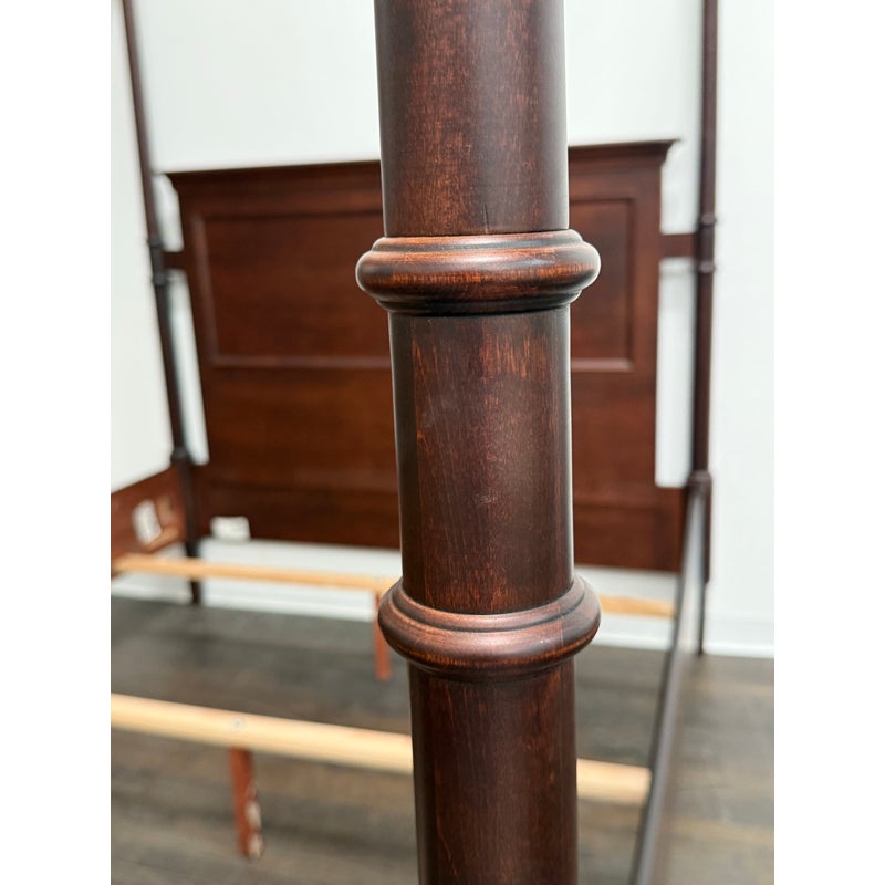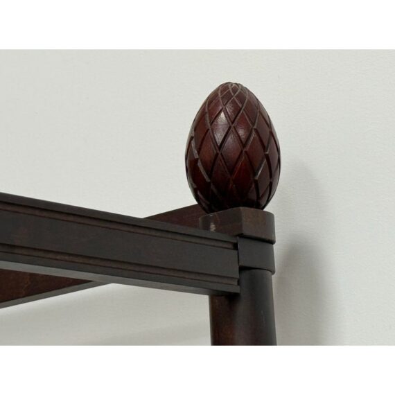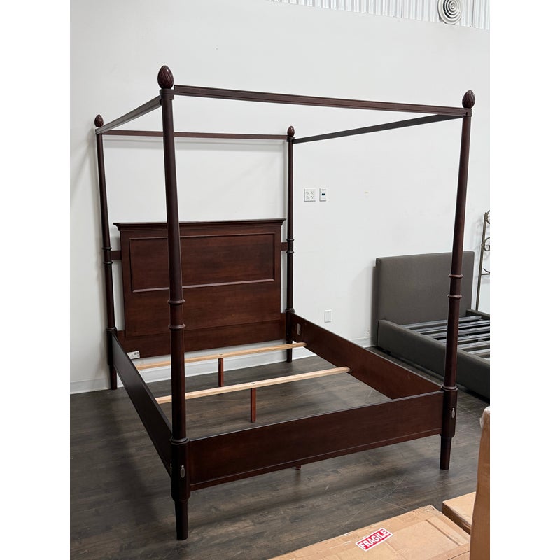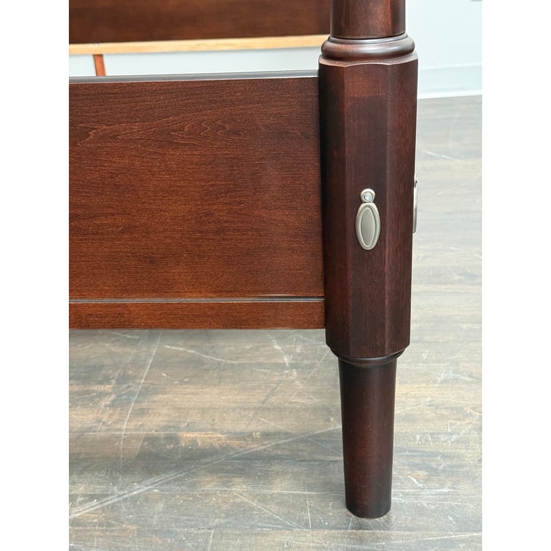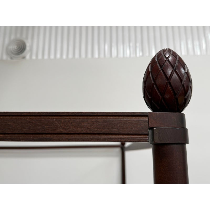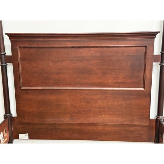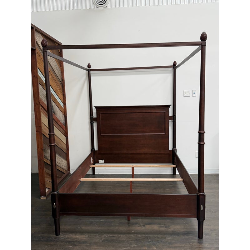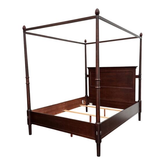 Design Plus Gallery presents a Queen Size London Canopy Bed by Mobilier Furniture, a division of Shermag. This Canopy bed model has a deep cherry tone with a traditional canopy frame, turned posts, pineapple-form finials, paneled headboard, side rails, footboard, and wood support slats. The design includes decorative metal medallions on the front posts and classic molding details throughout. This is a discontinued model with the brand and is in good condition with visible and minimal wear from usage. Made in Canada