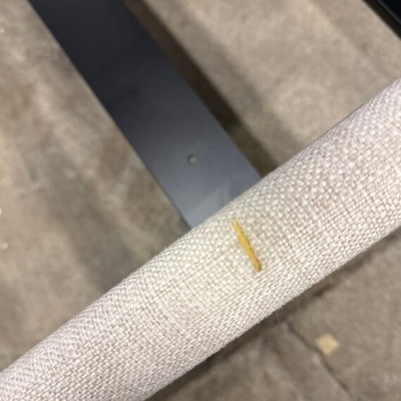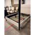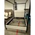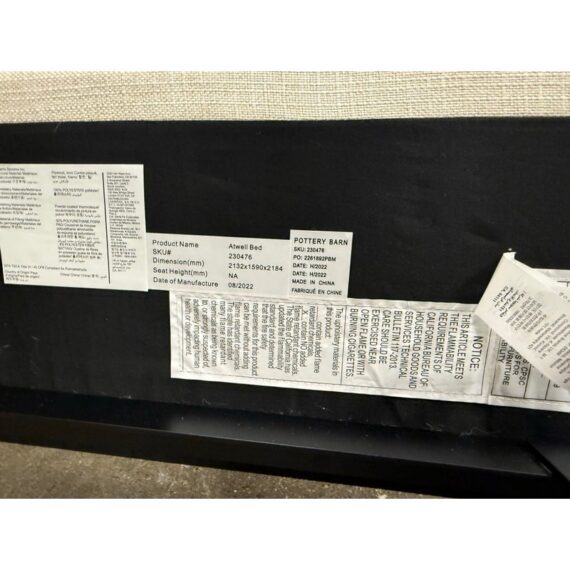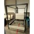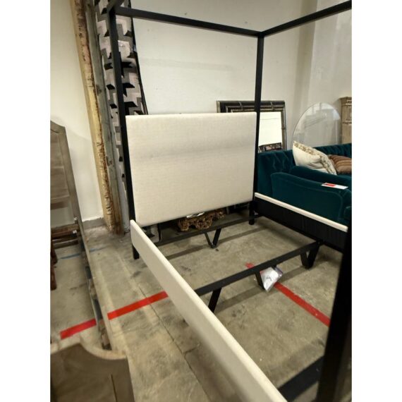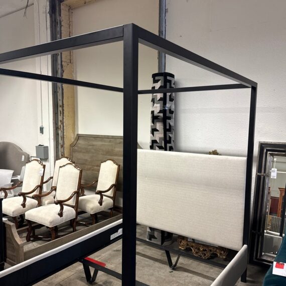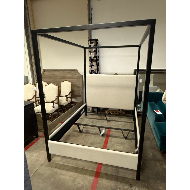 Design Plus Gallery presents the Queen Size Atwell Canopy Bed Frame from Pottery Barn. The bed frame has a streamlined iron canopy structure with upholstered headboard and foot board panels in a light neutral textile, creating a look that is architectural and understated. The open frame gives the piece a defined profile, while the padded elements add softness and contrast to the linear metal form. This is a discontinued Pottery Barn model and is in good condition with visible and minimal wear from usage.
