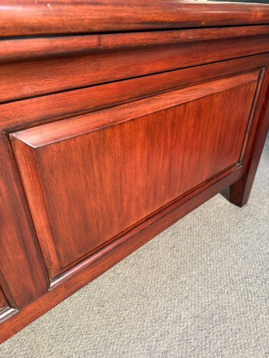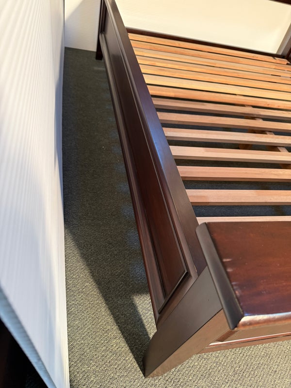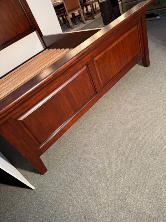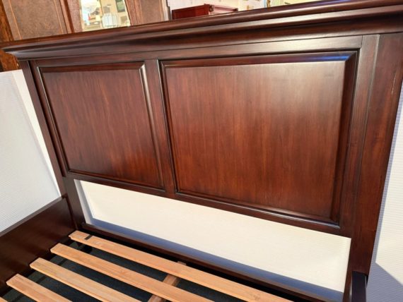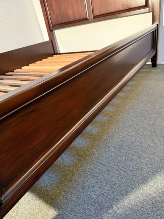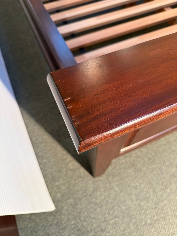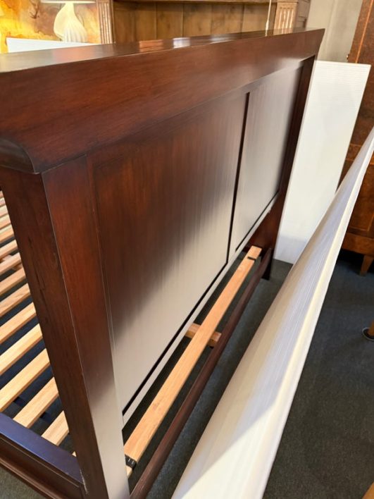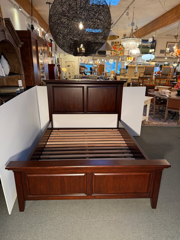 Design Plus Gallery presents a Hudson Queen Bedframe. Simple lines and minimal paneled embellishment recall the artistry of Craftsman-style design in this nicely scaled mahogany finished, kiln-dried solid wood and veneer bed. Includes slats and center support as shown. Made in Indonesia. Surface scratches, condition is consistent with age and use.