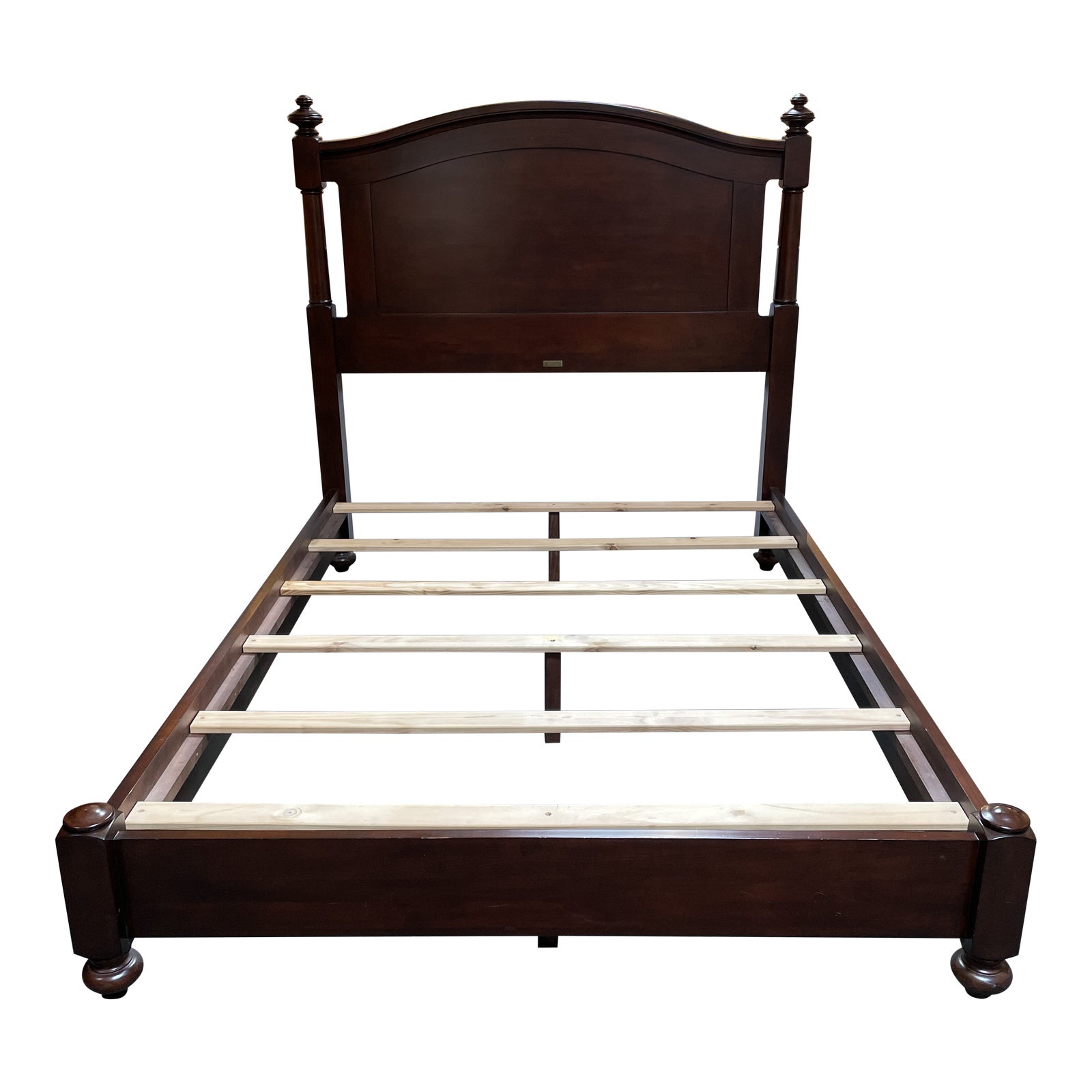 Design Plus Gallery presents a Queen Size Bed Frame by Restoration Hardware. All wood, the beds designed in the American Empire style, a simple rather than ornate one. Rich tobacco finish and turned finials are all the details necessary.